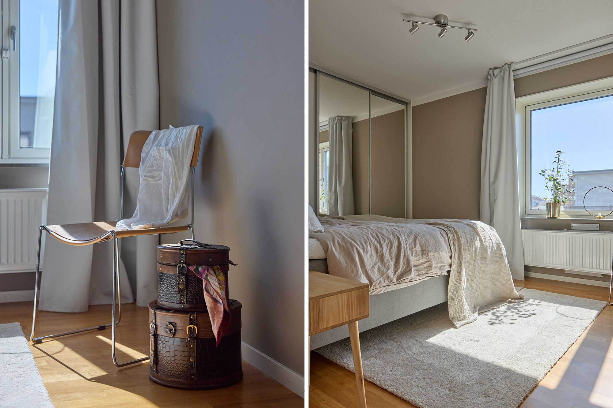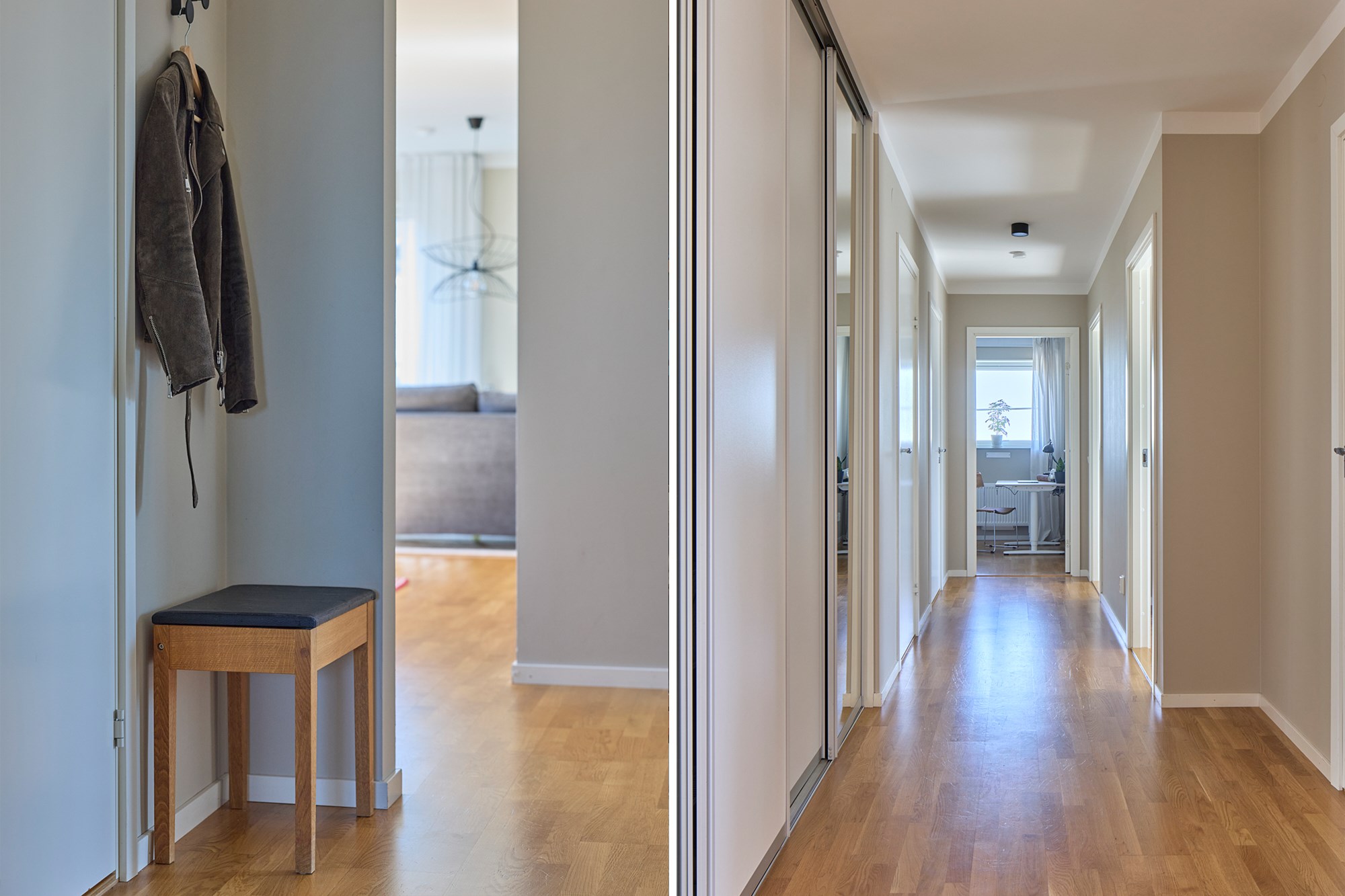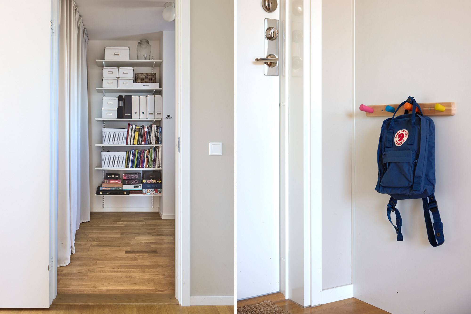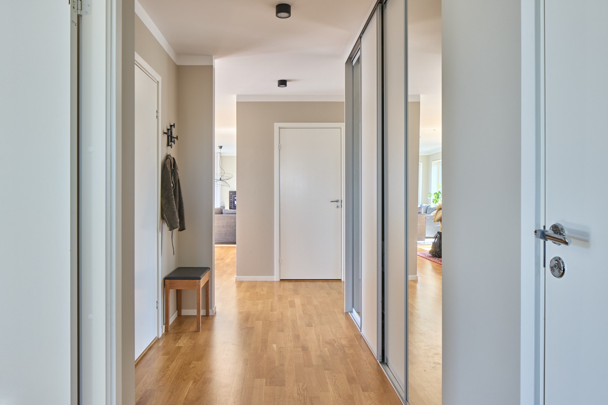 Parkettgolv och ljusa väggar. Garderobsförvaring.