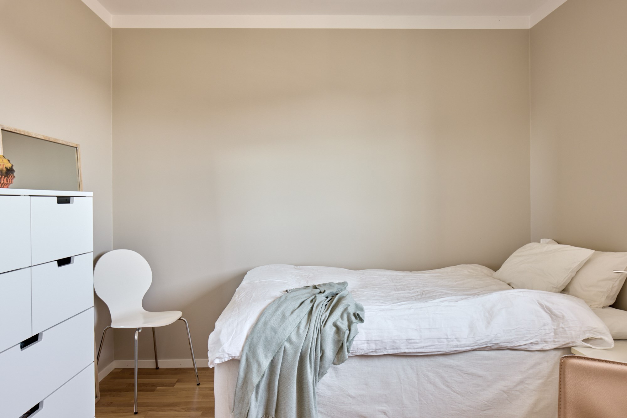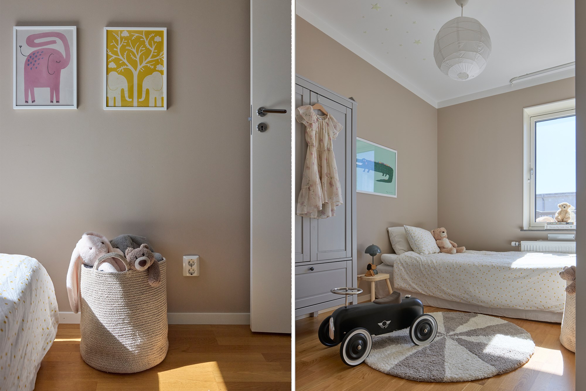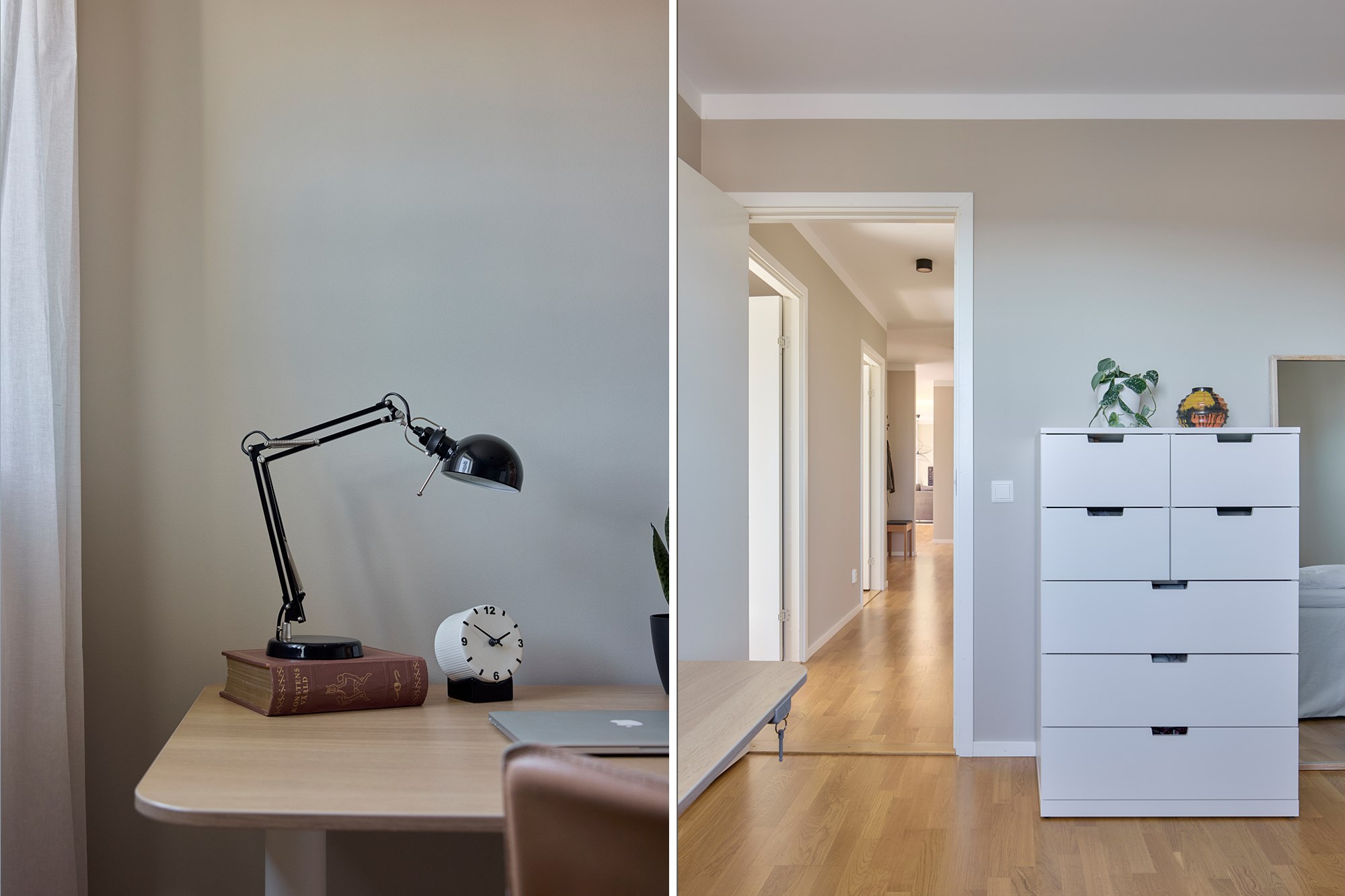 Parkettgolv och ljusa väggar. Garderobsförvaring.