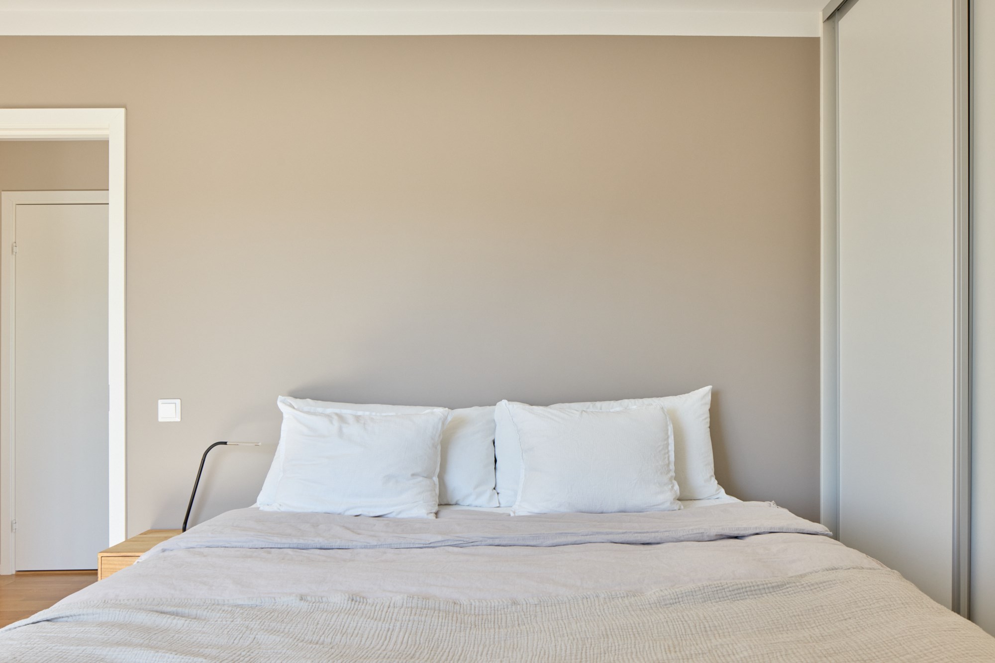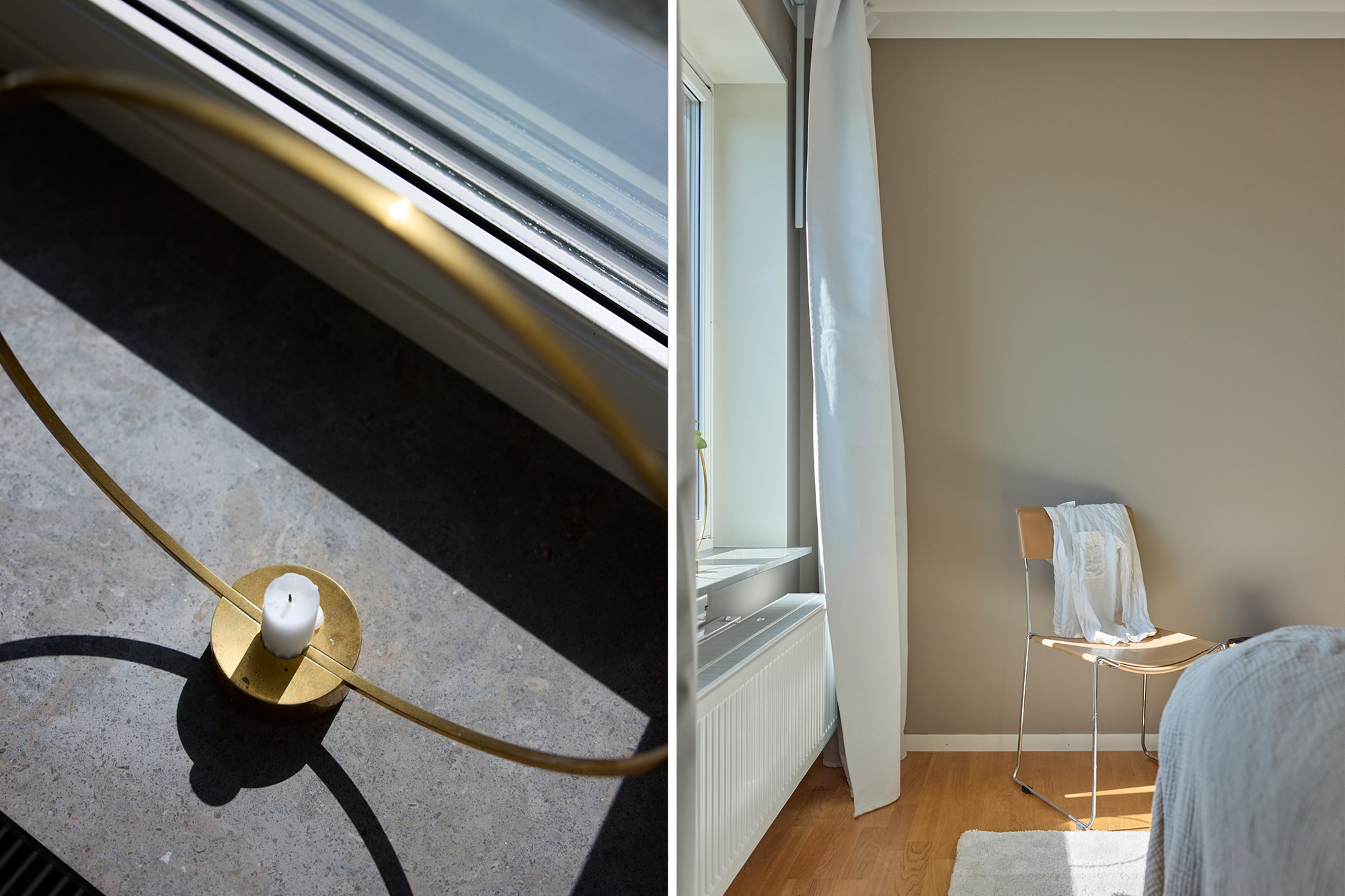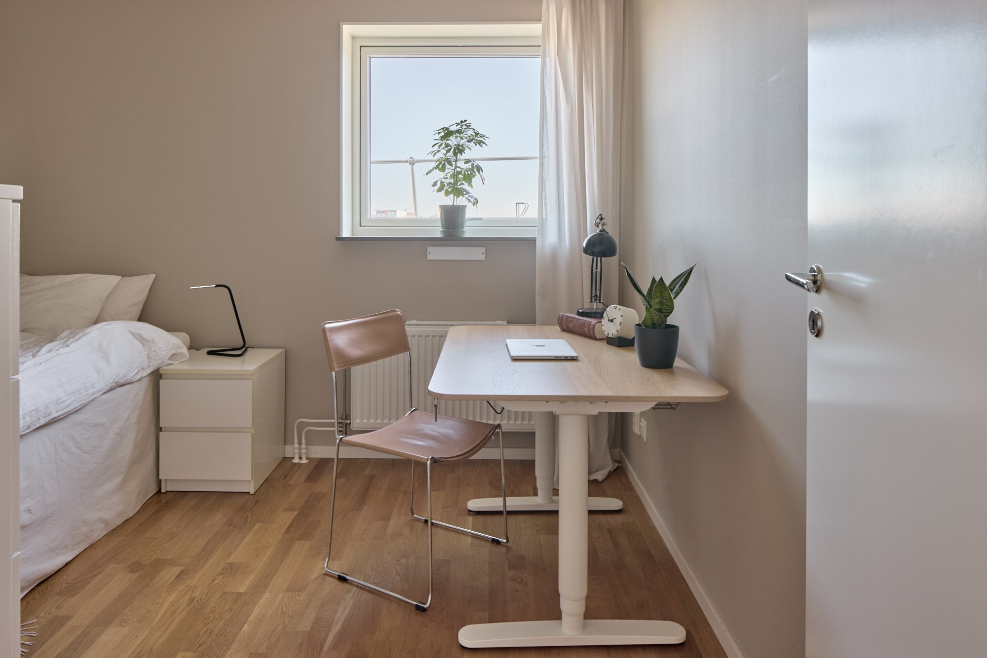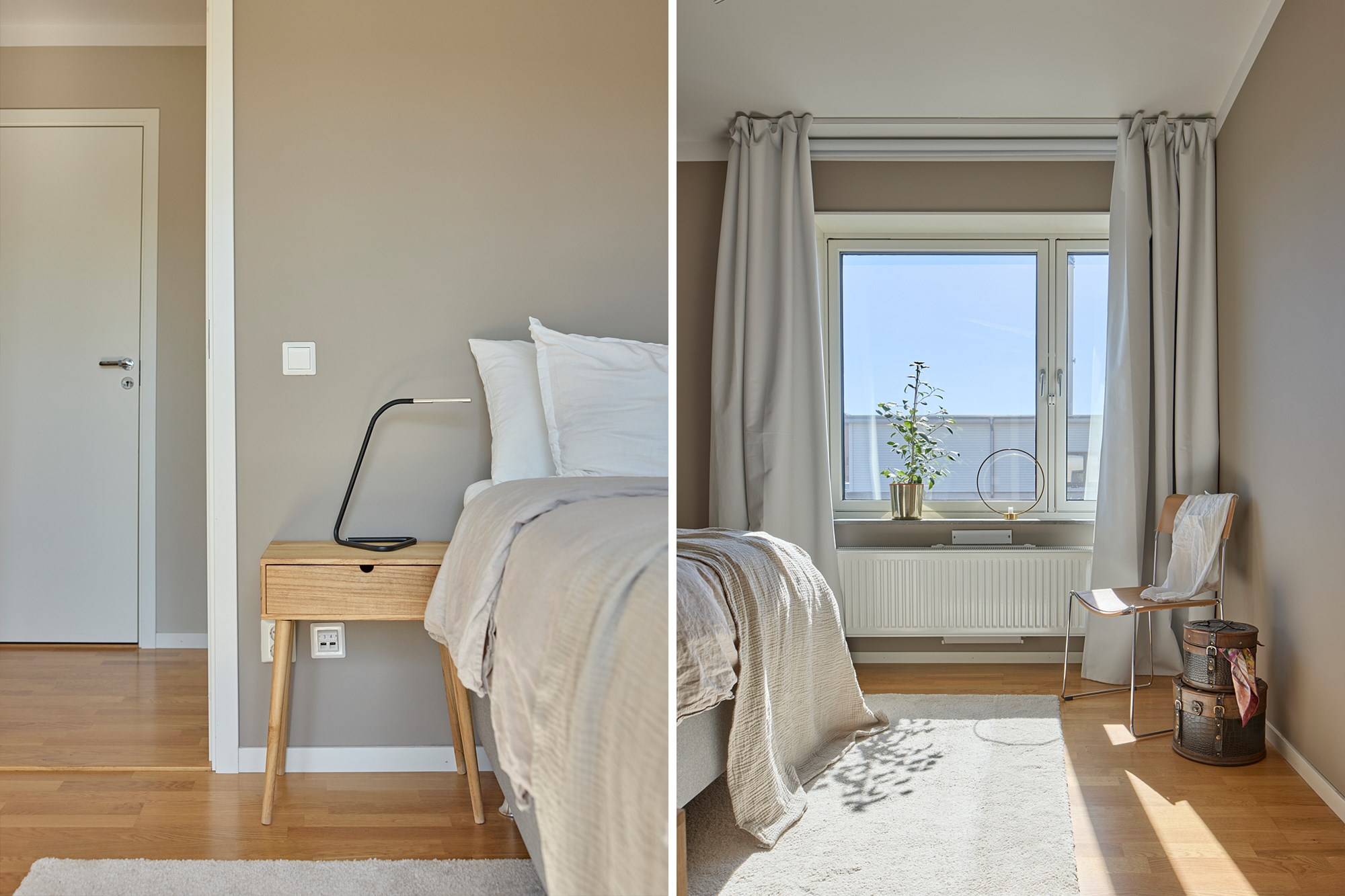 Parkettgolv och ljusa väggar. Garderobsförvaring.
