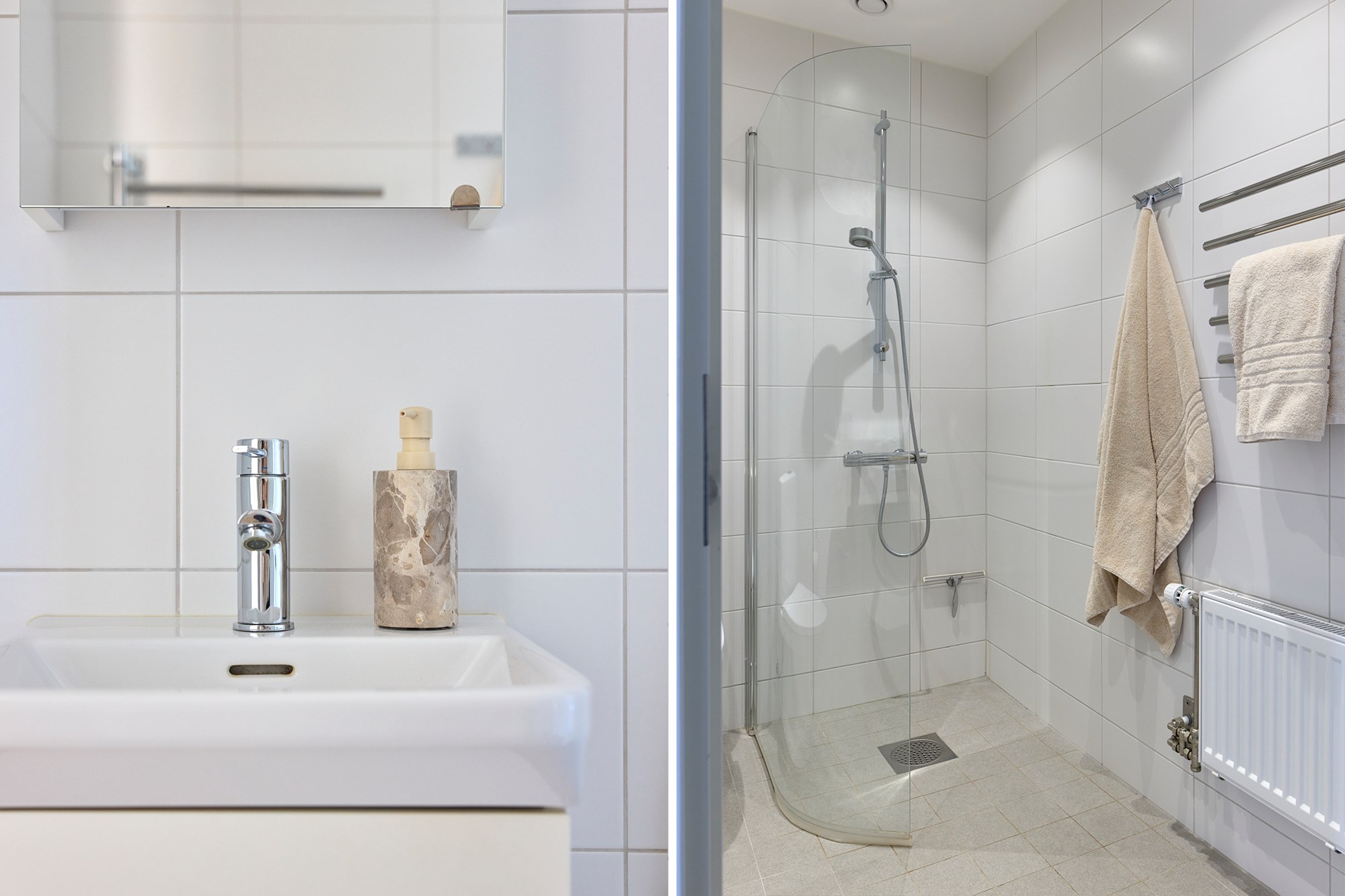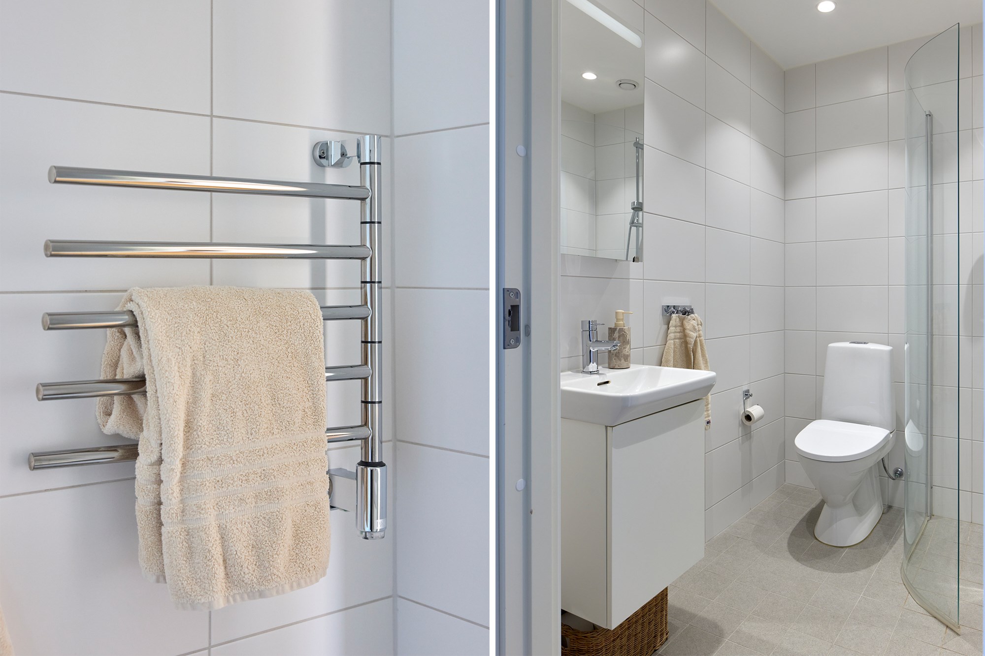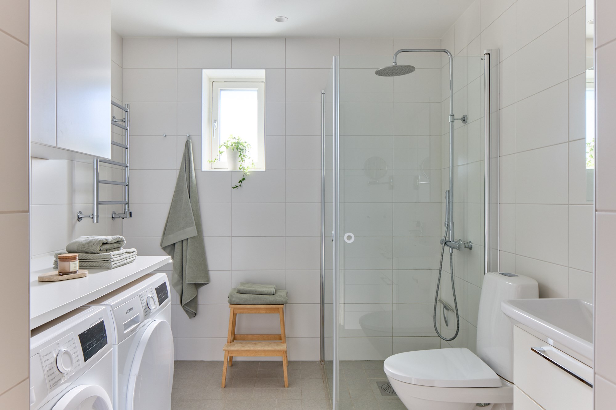 Helkaklat badrum. Beigt klinker till golv och vita kaklade väggar. Utrustad med WC, handfat med vit kommod, spegel, dusch, handdukstork, tvättmaskin och torktumlare med arbetsbänk och förvaringsskåp ovan.