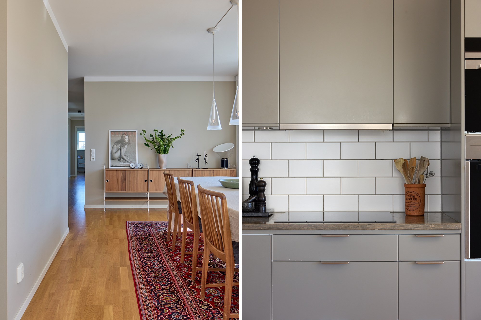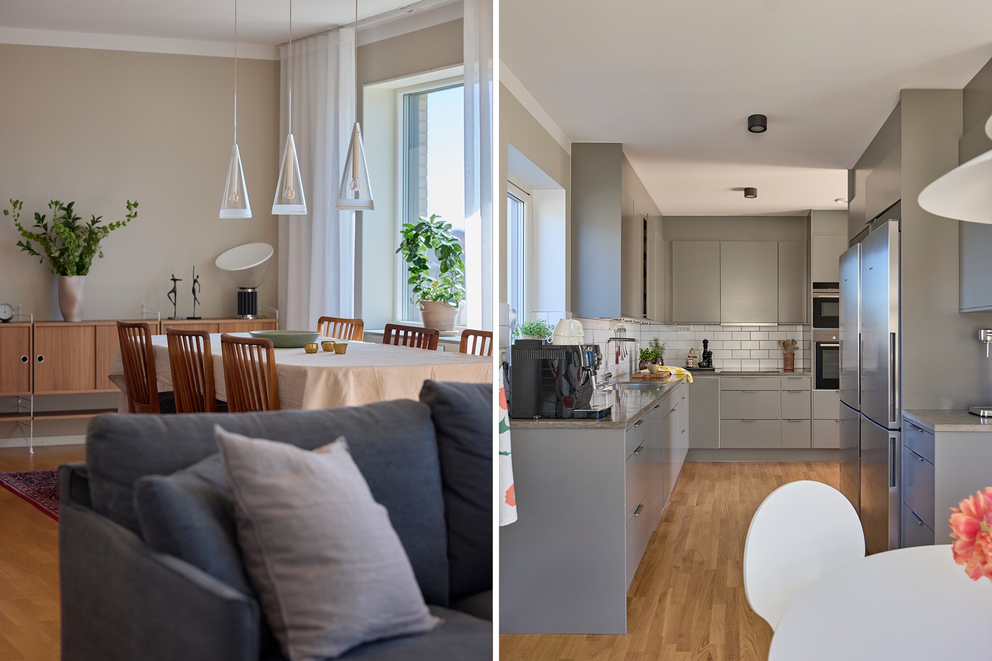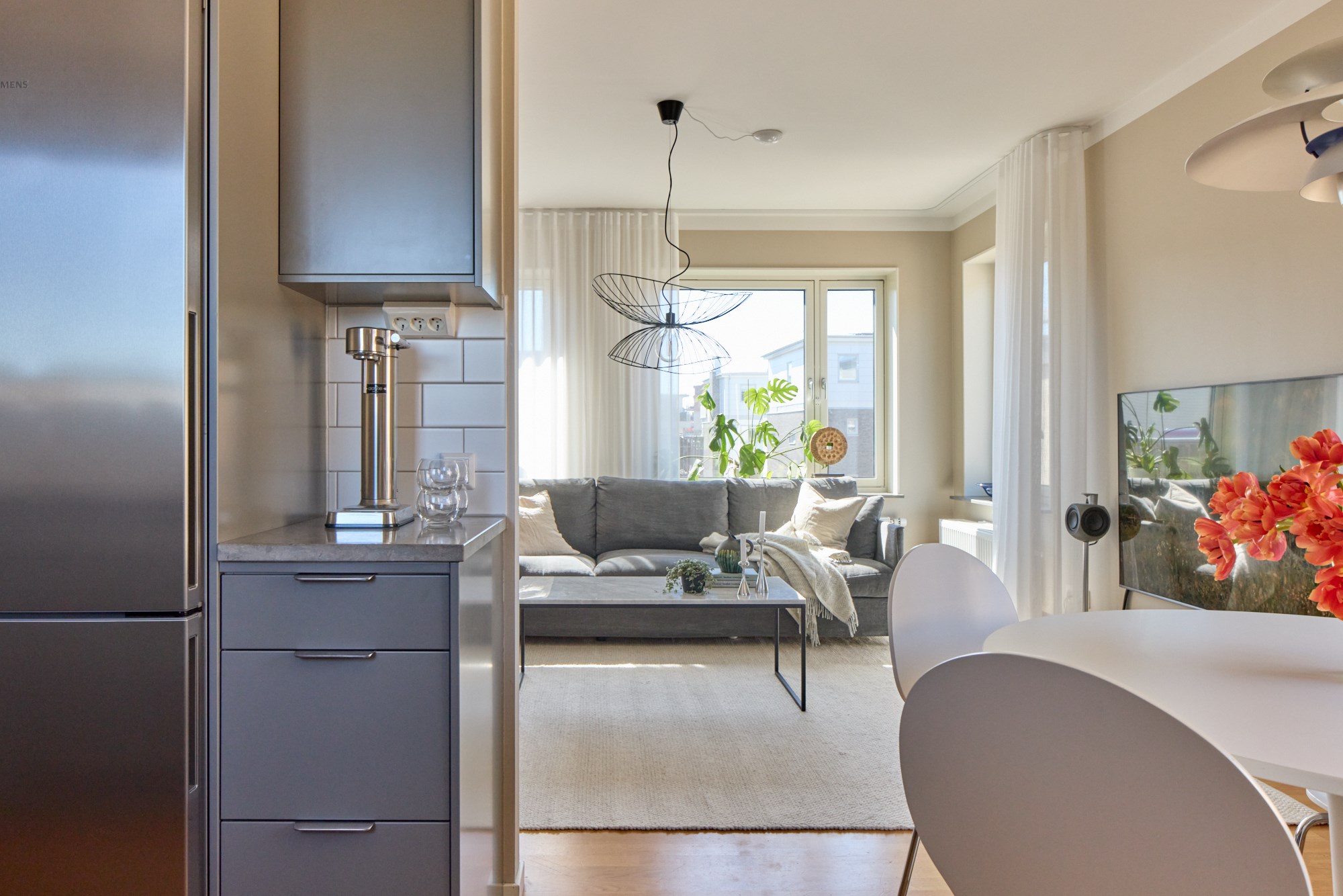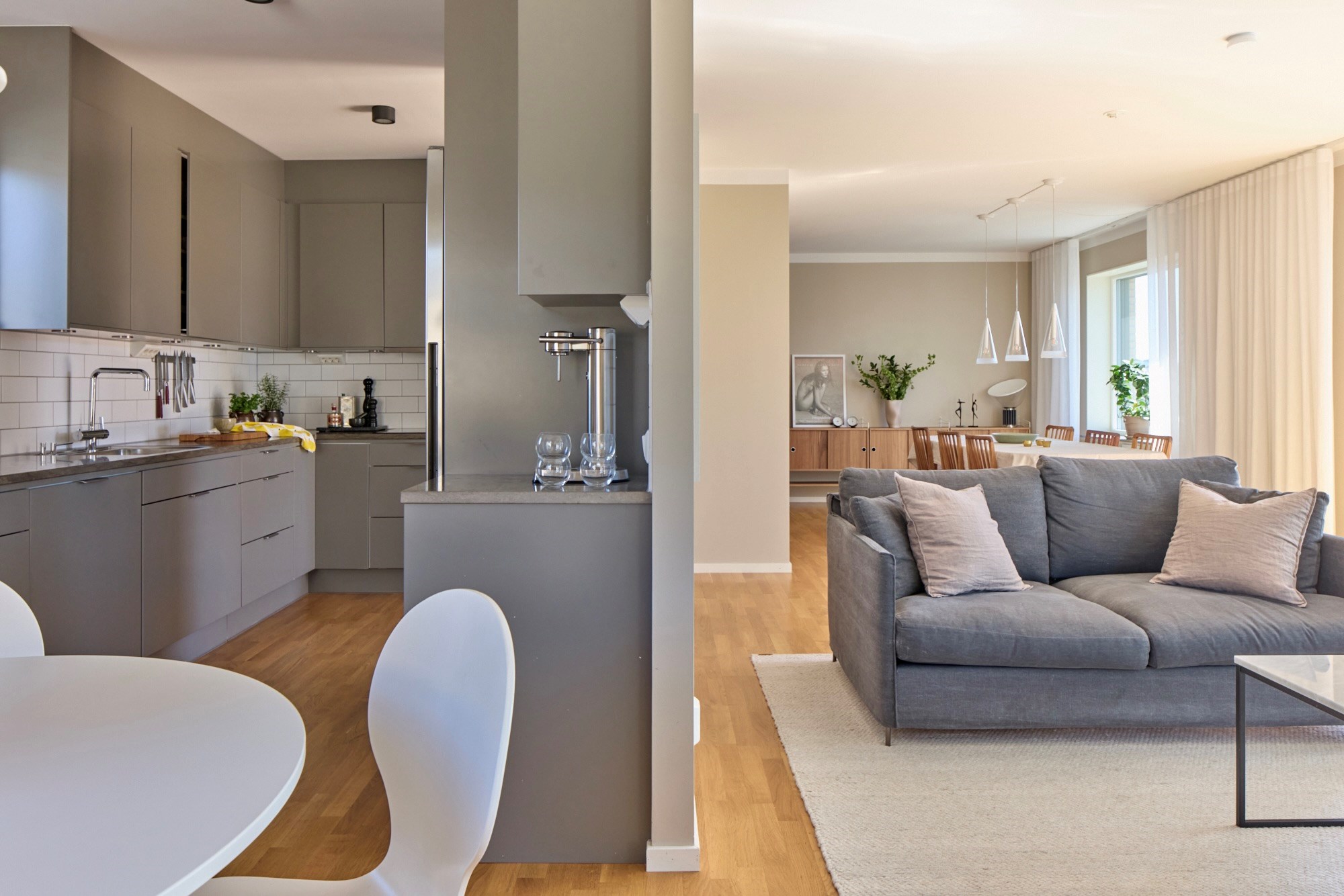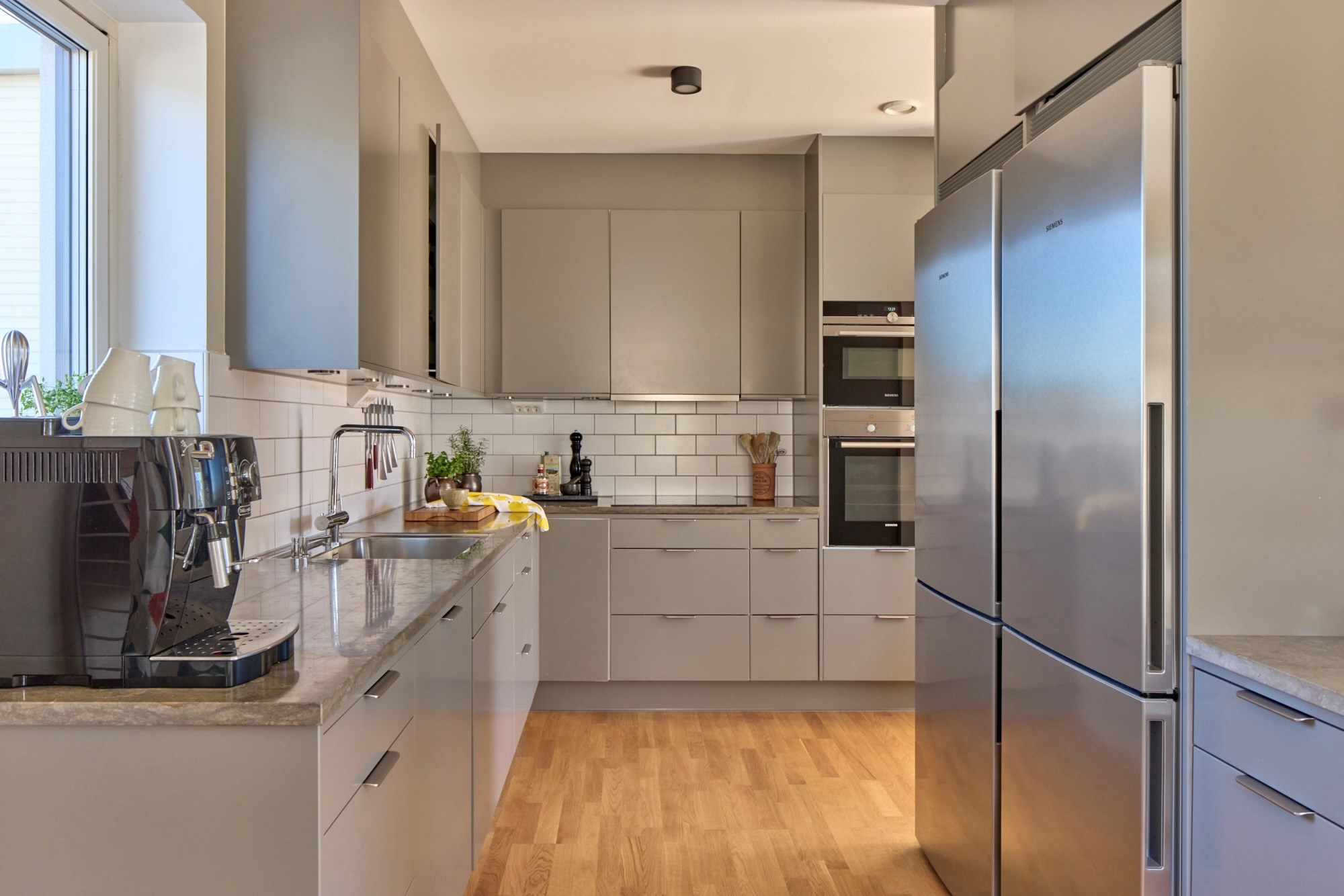Parkettgolv och ljusa väggar. Ljus köksinredning. Maskinell utrustning i form av induktionshäll och fläkt, ugn, mikrovågsugn, diskmaskin, kyl och frys.