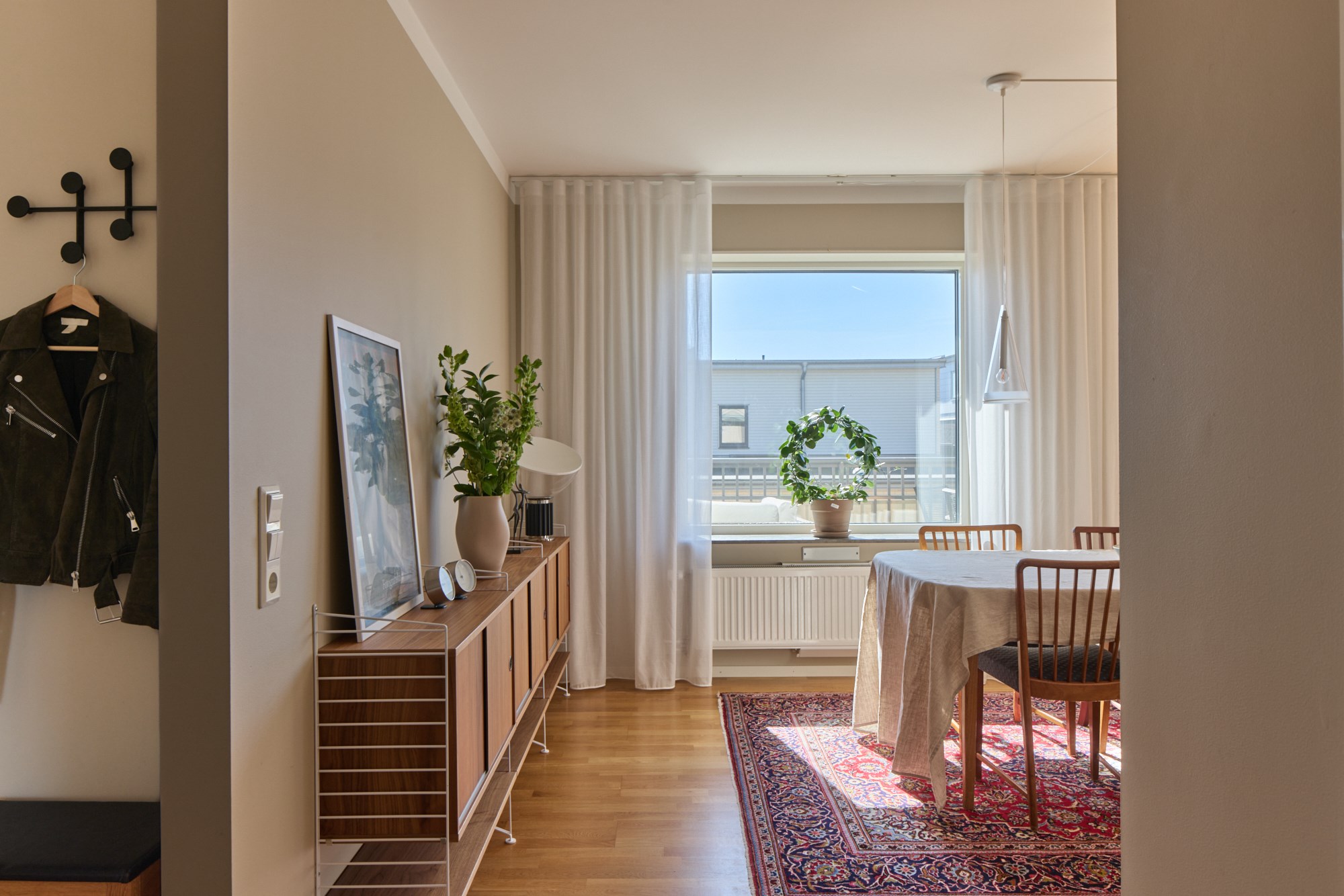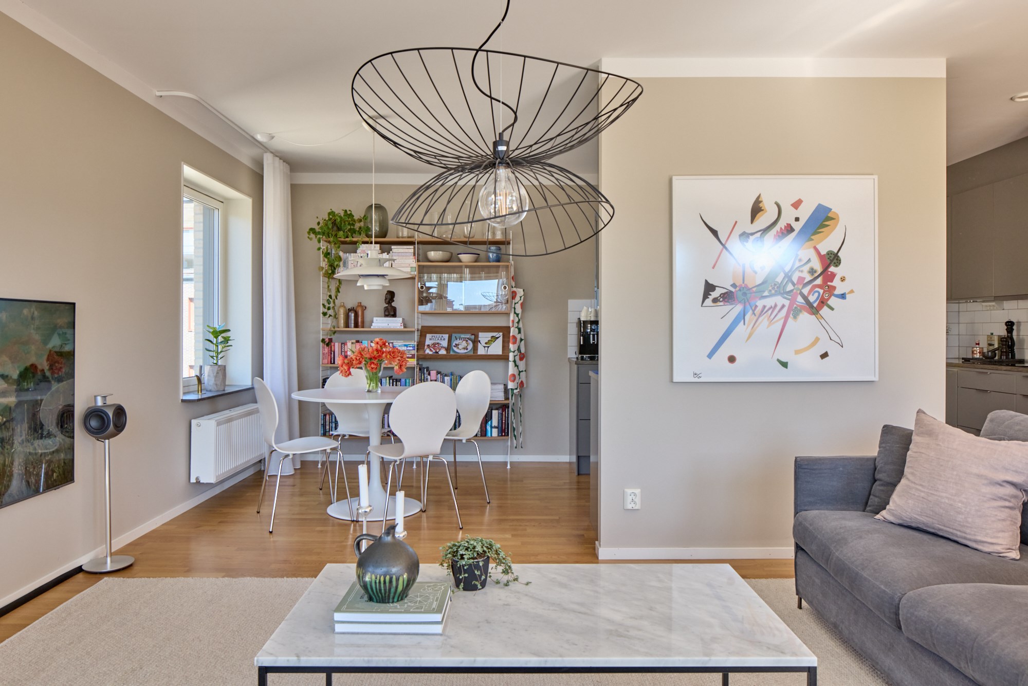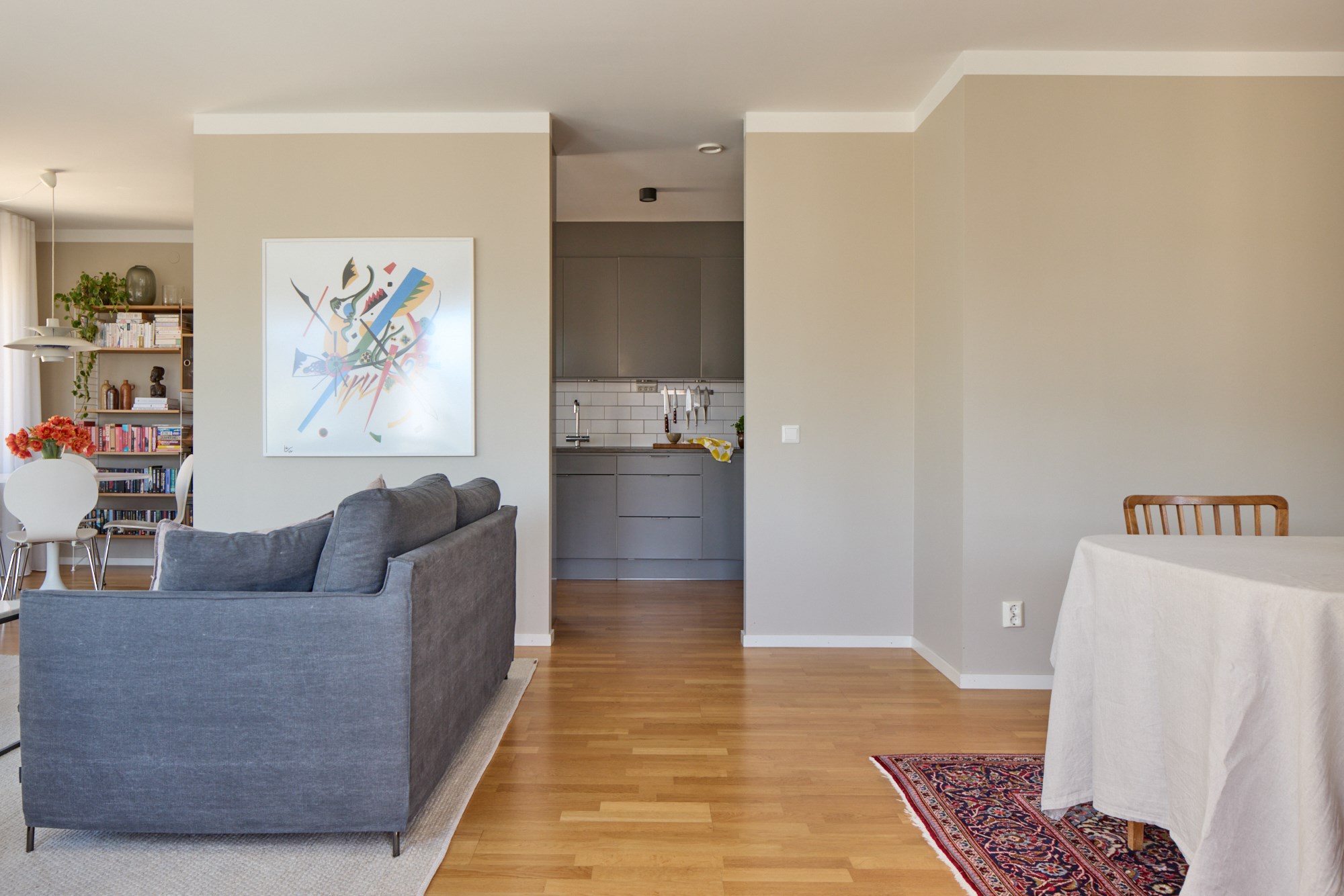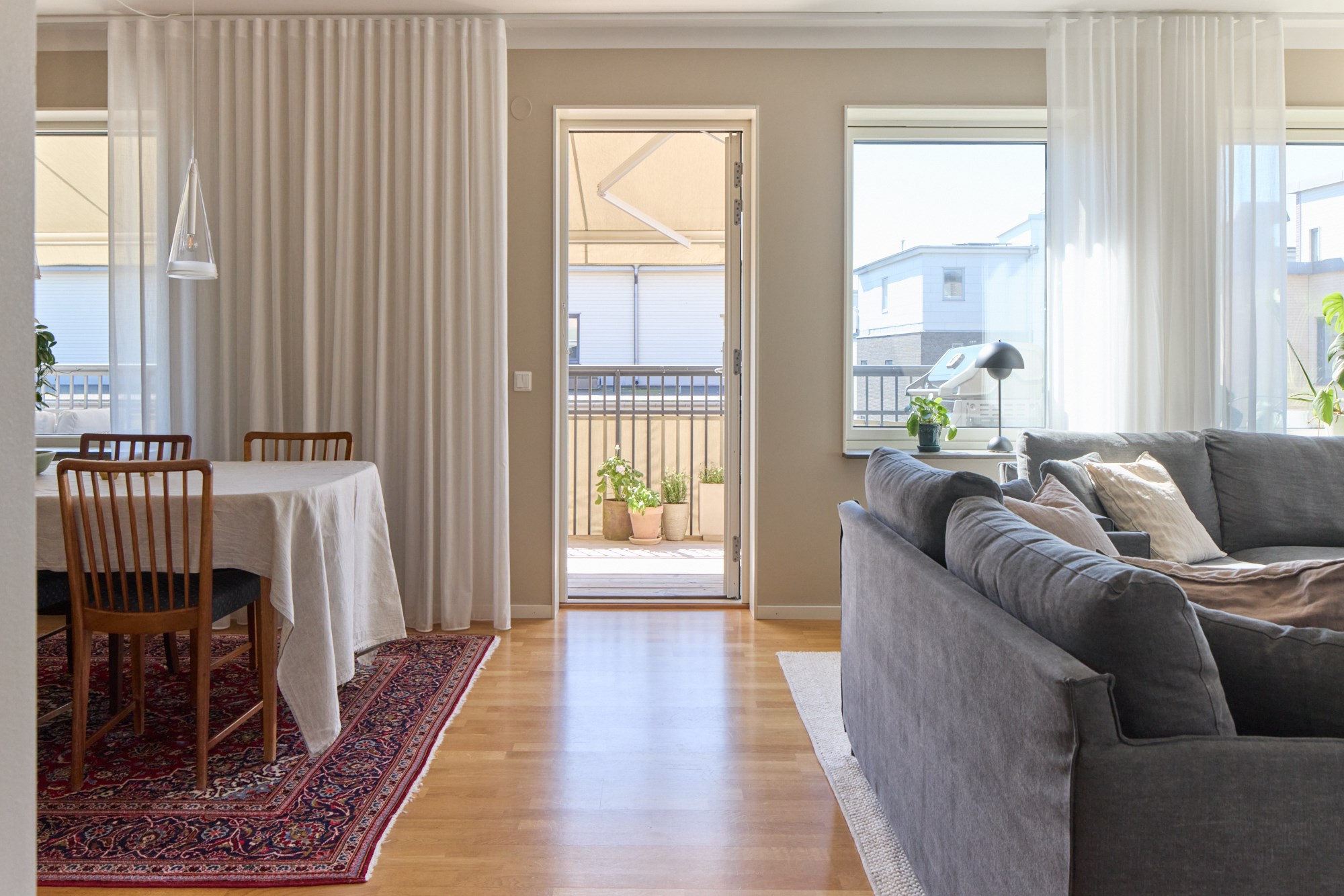 Parkettgolv och ljusa väggar. Plats för soffgrupp och matplats. Utgång till balkong.
