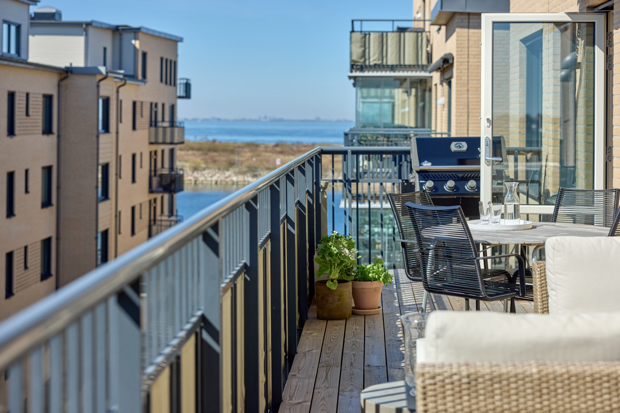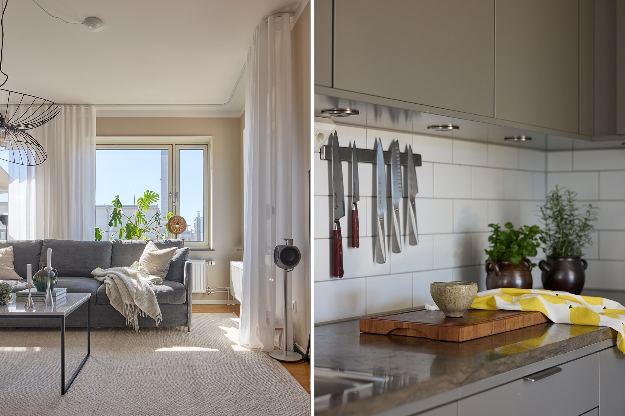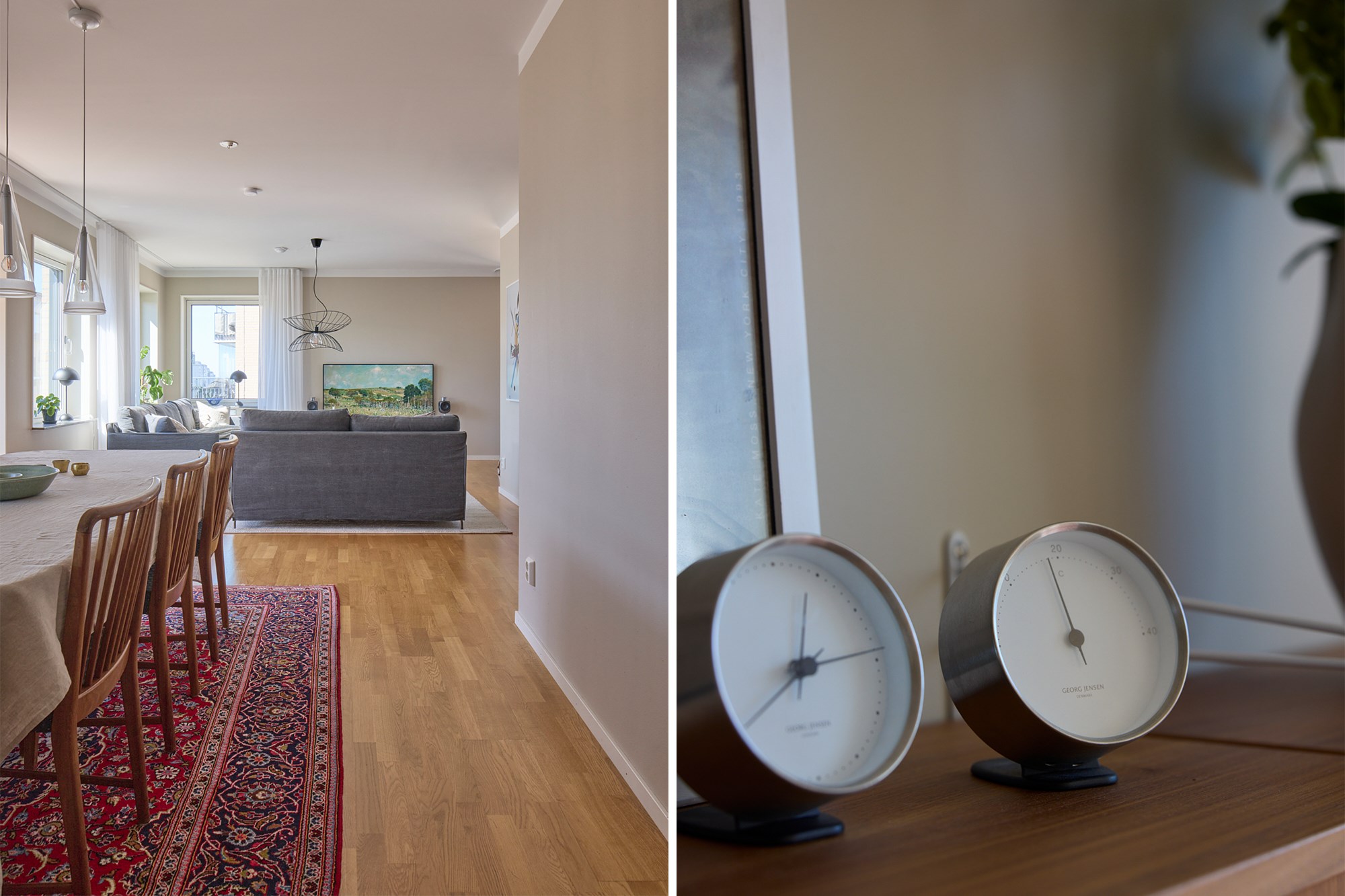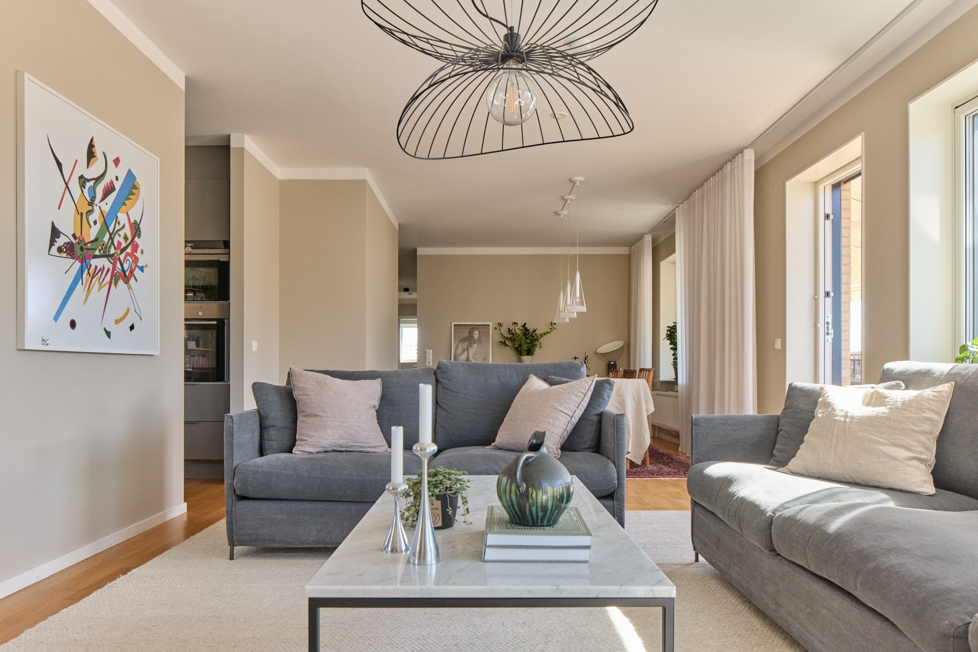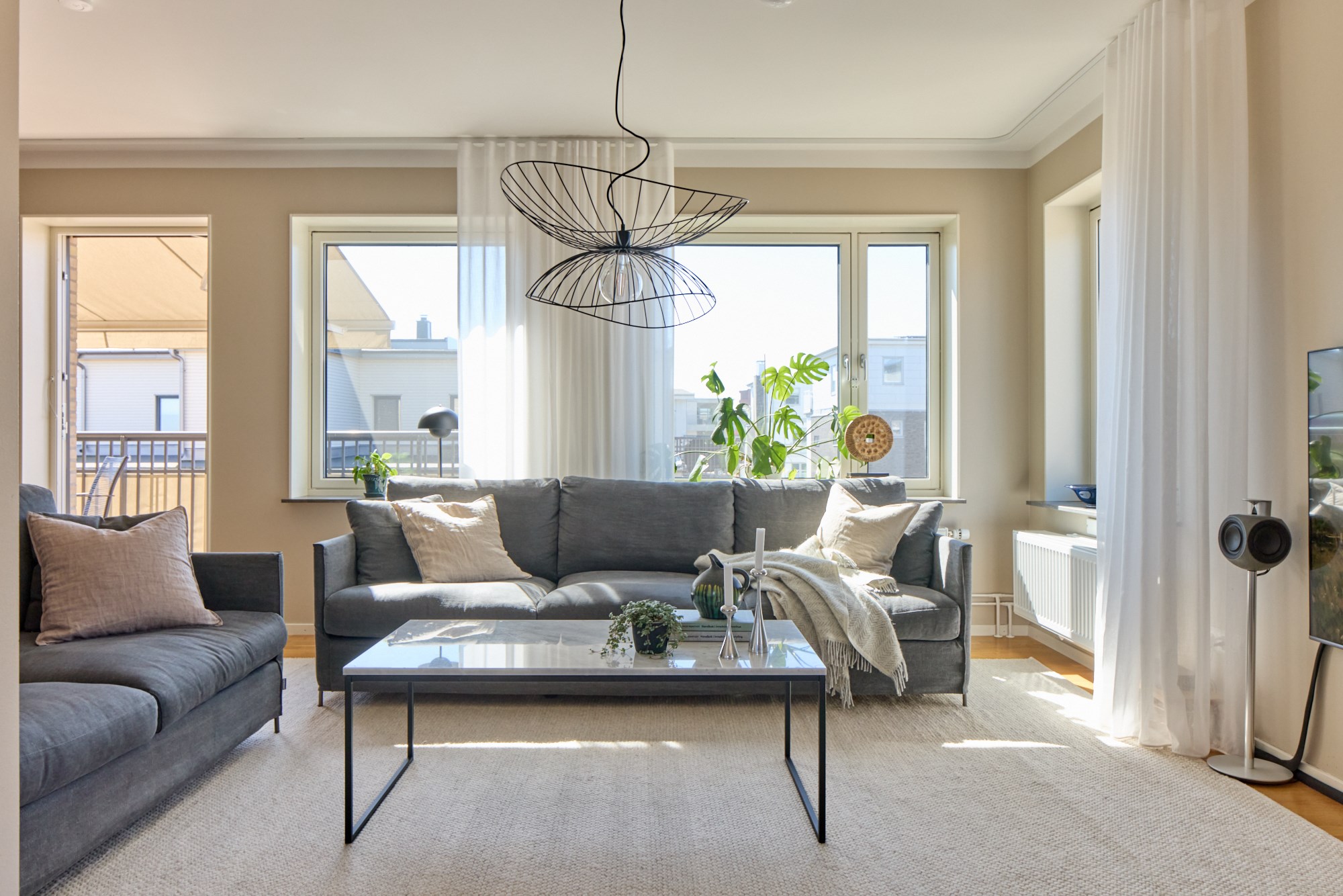 Parkettgolv och ljusa väggar. Plats för soffgrupp och matplats. Utgång till balkong.