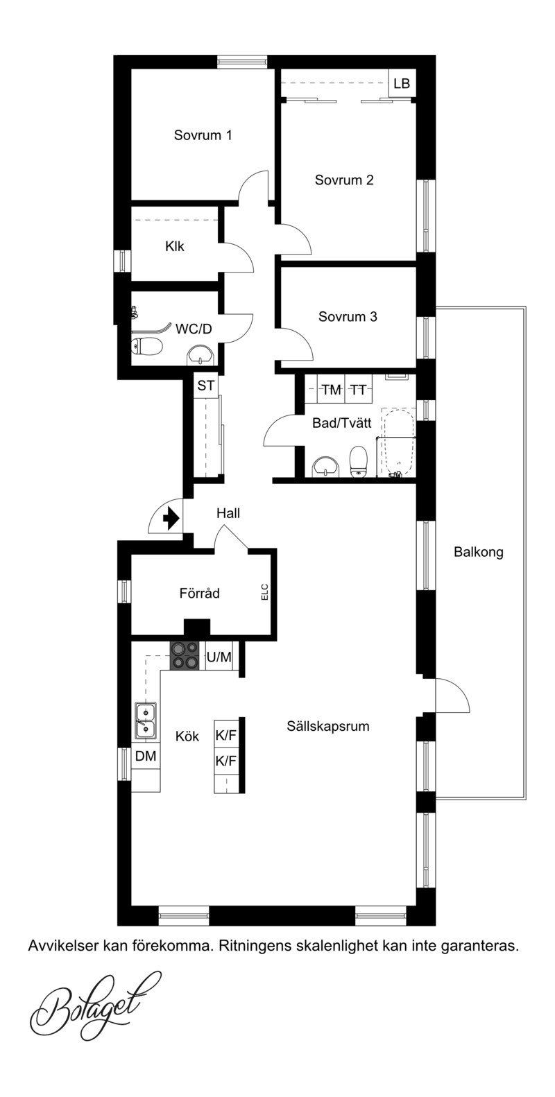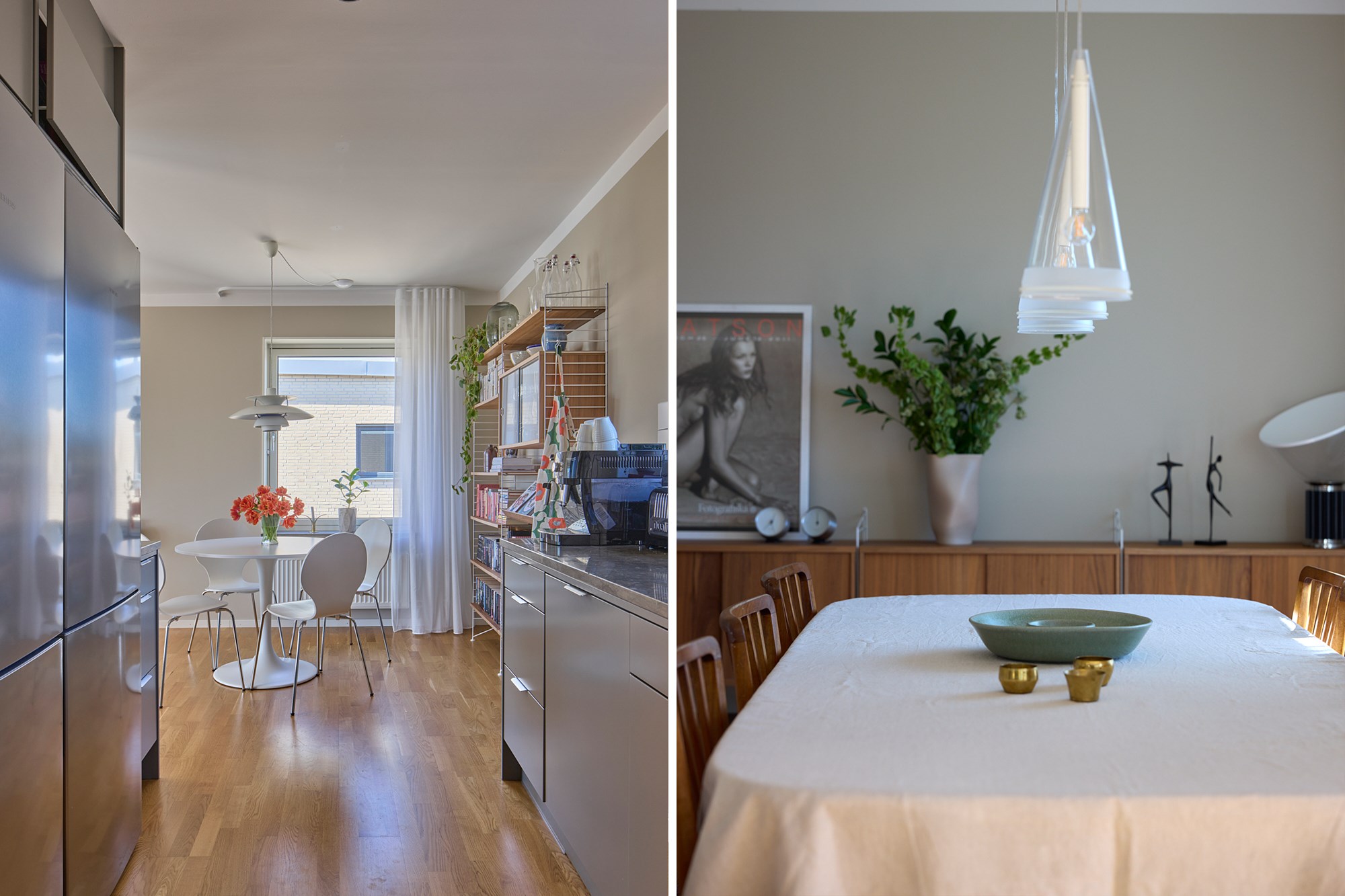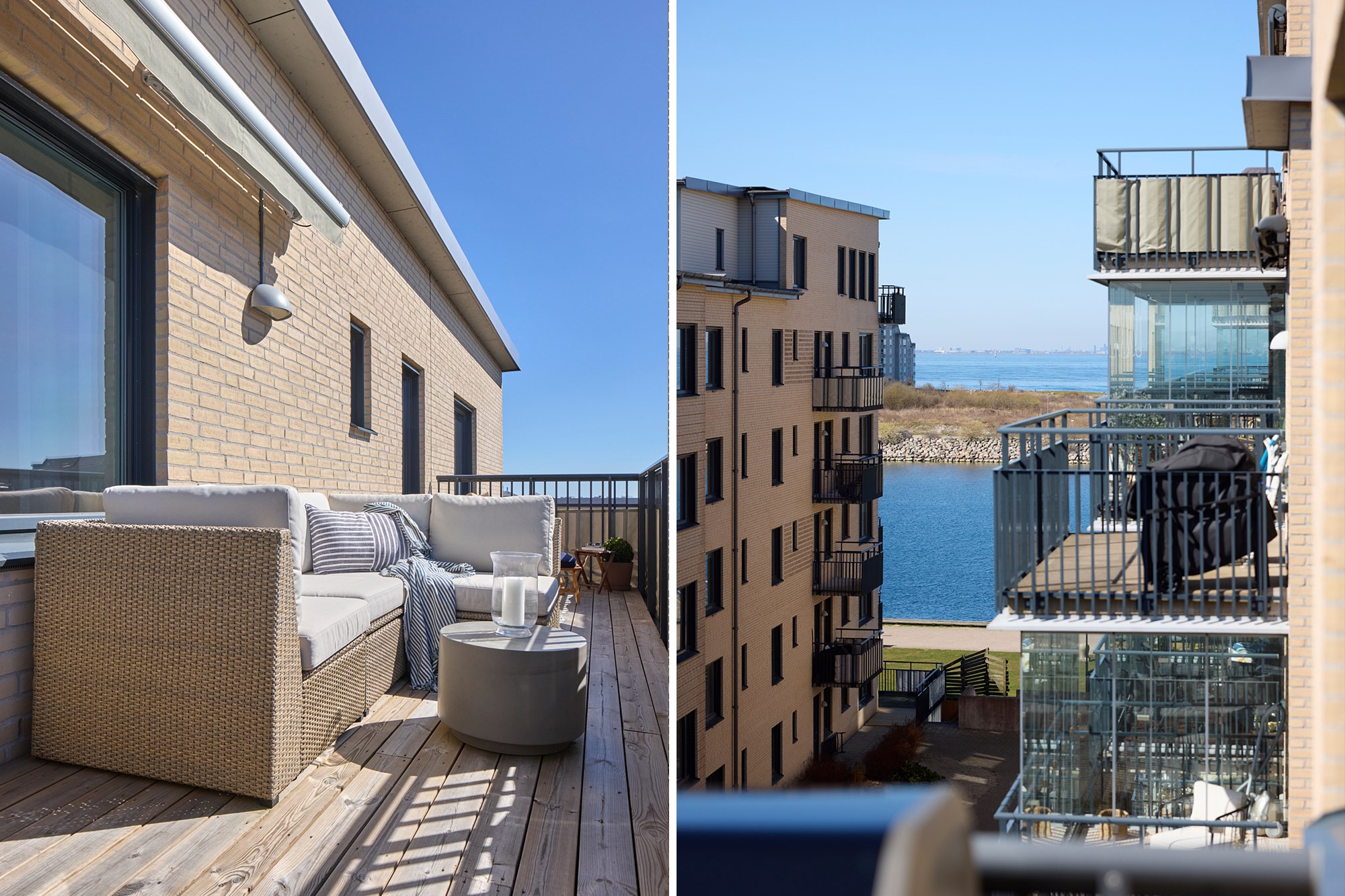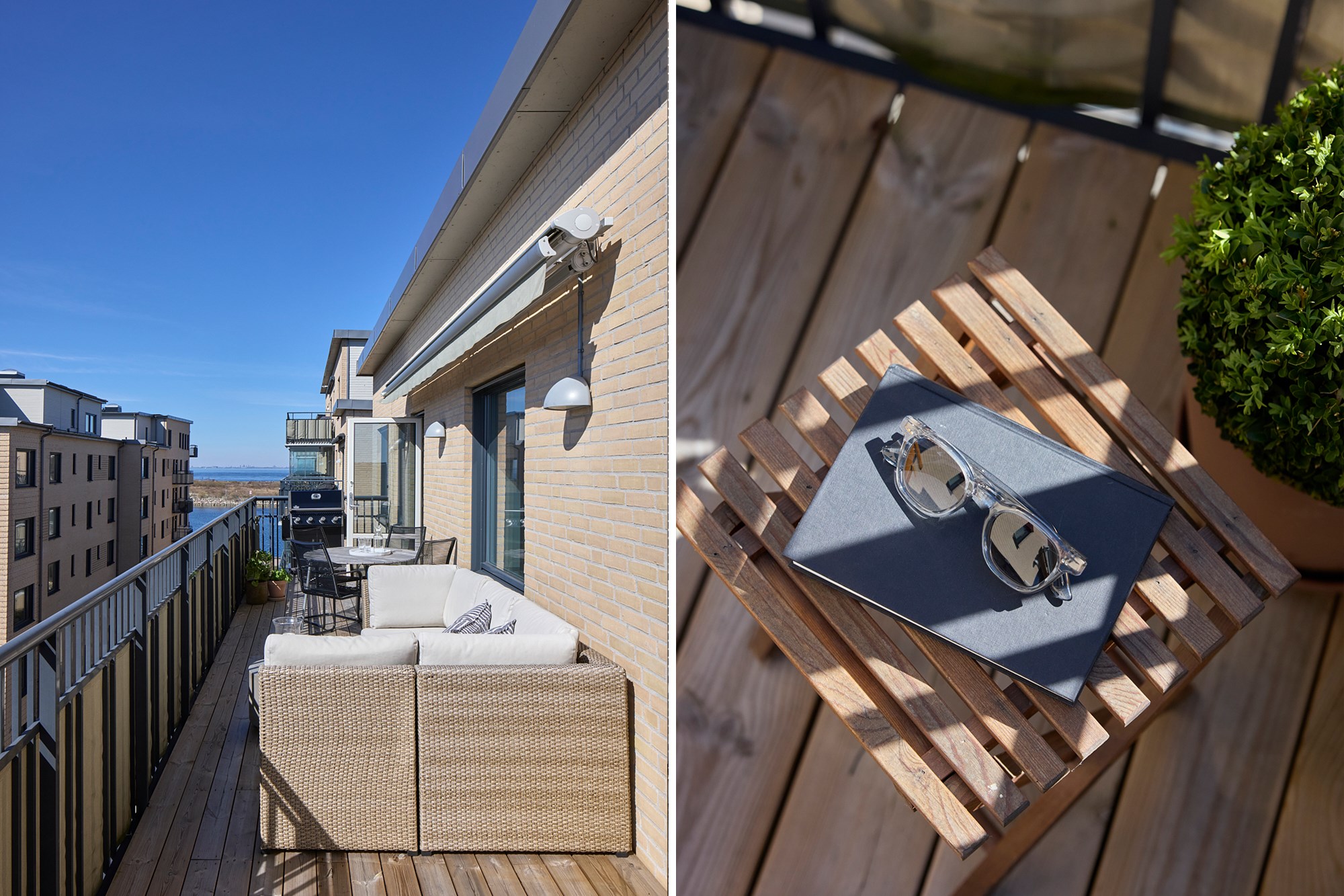 Parkettgolv och ljusa väggar. Plats för soffgrupp och matplats. Utgång till balkong.