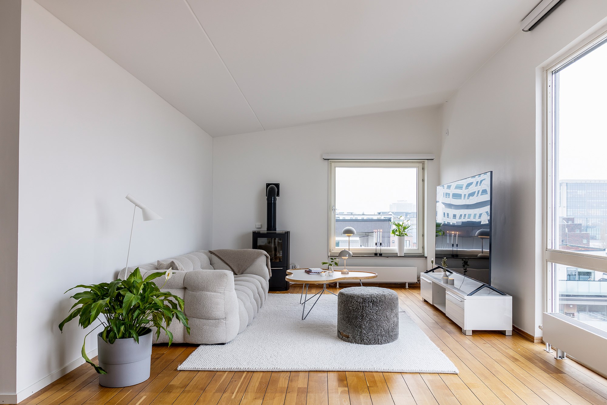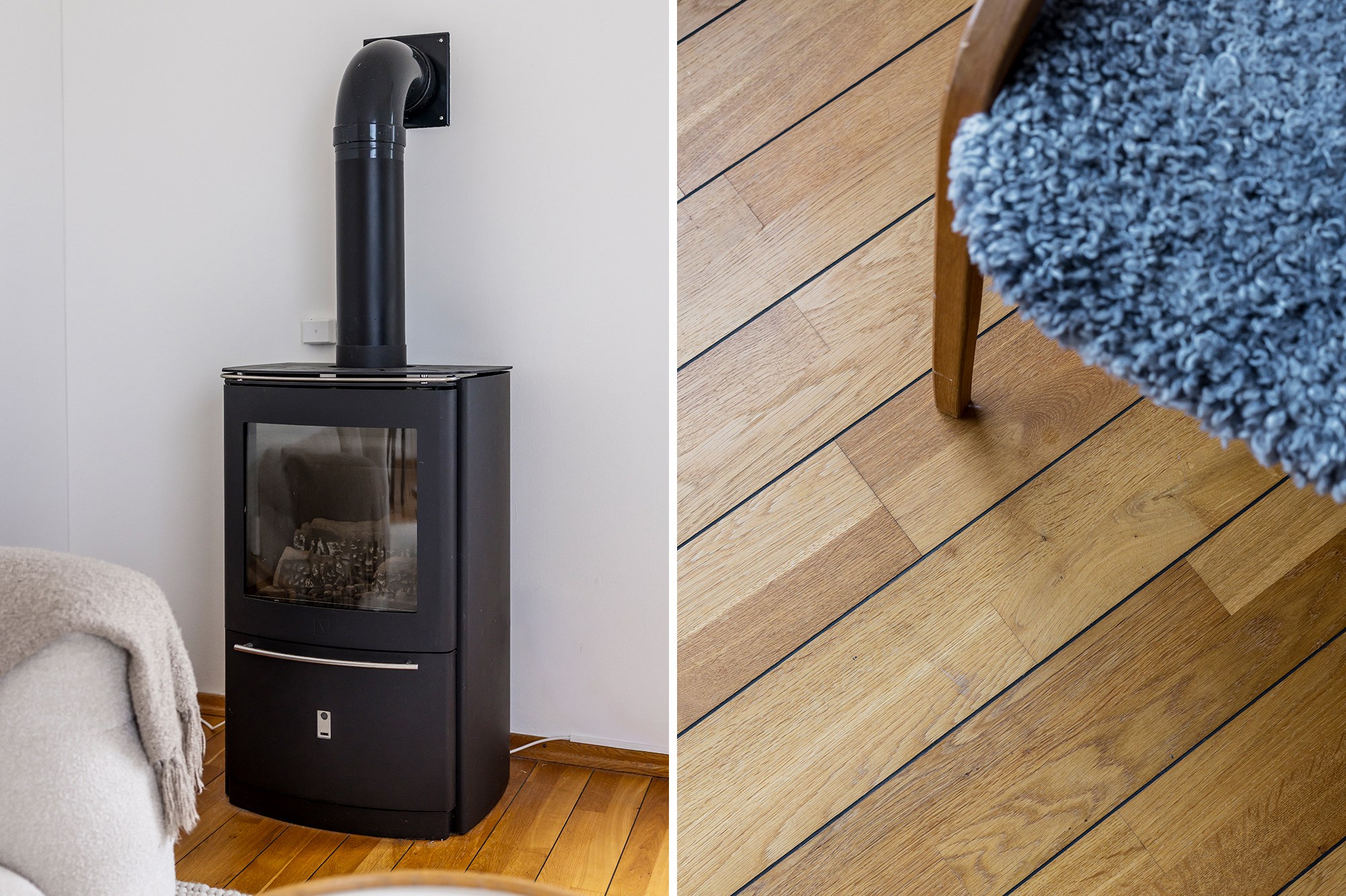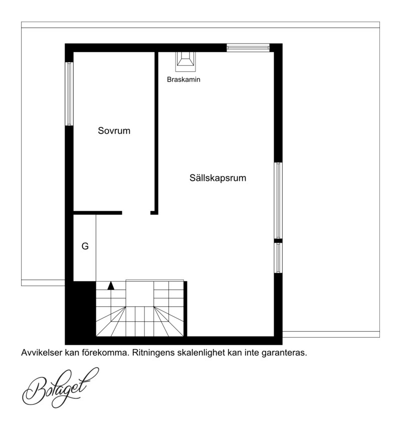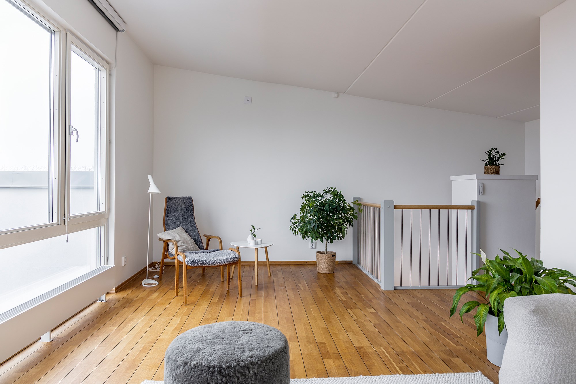 Skeppsgolv och ljusa väggar. Inredd med en braskamin. Garderobsförvaring vid trappa.