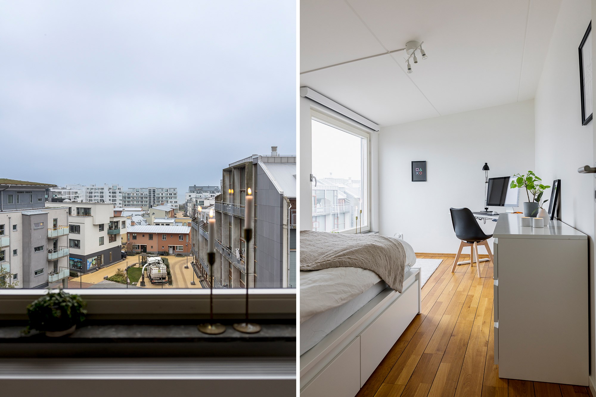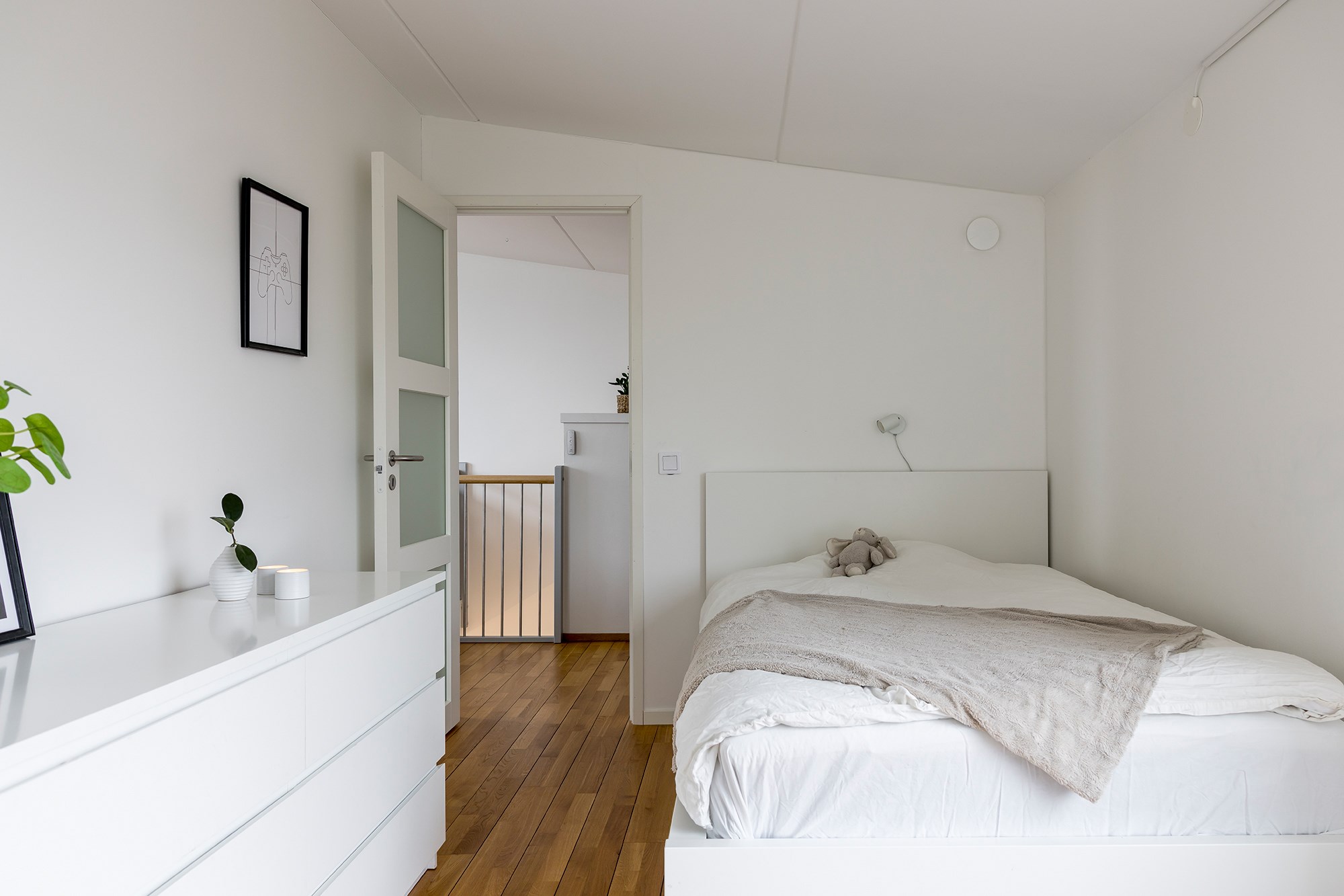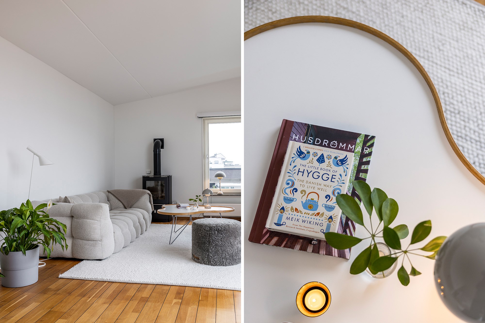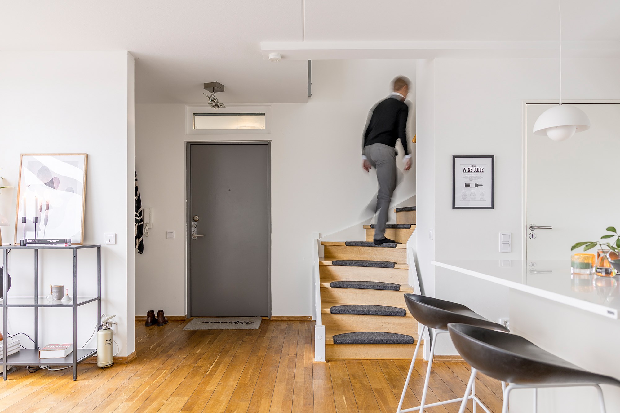 Skeppsgolv och ljusa väggar. Inredd med en braskamin. Garderobsförvaring vid trappa.