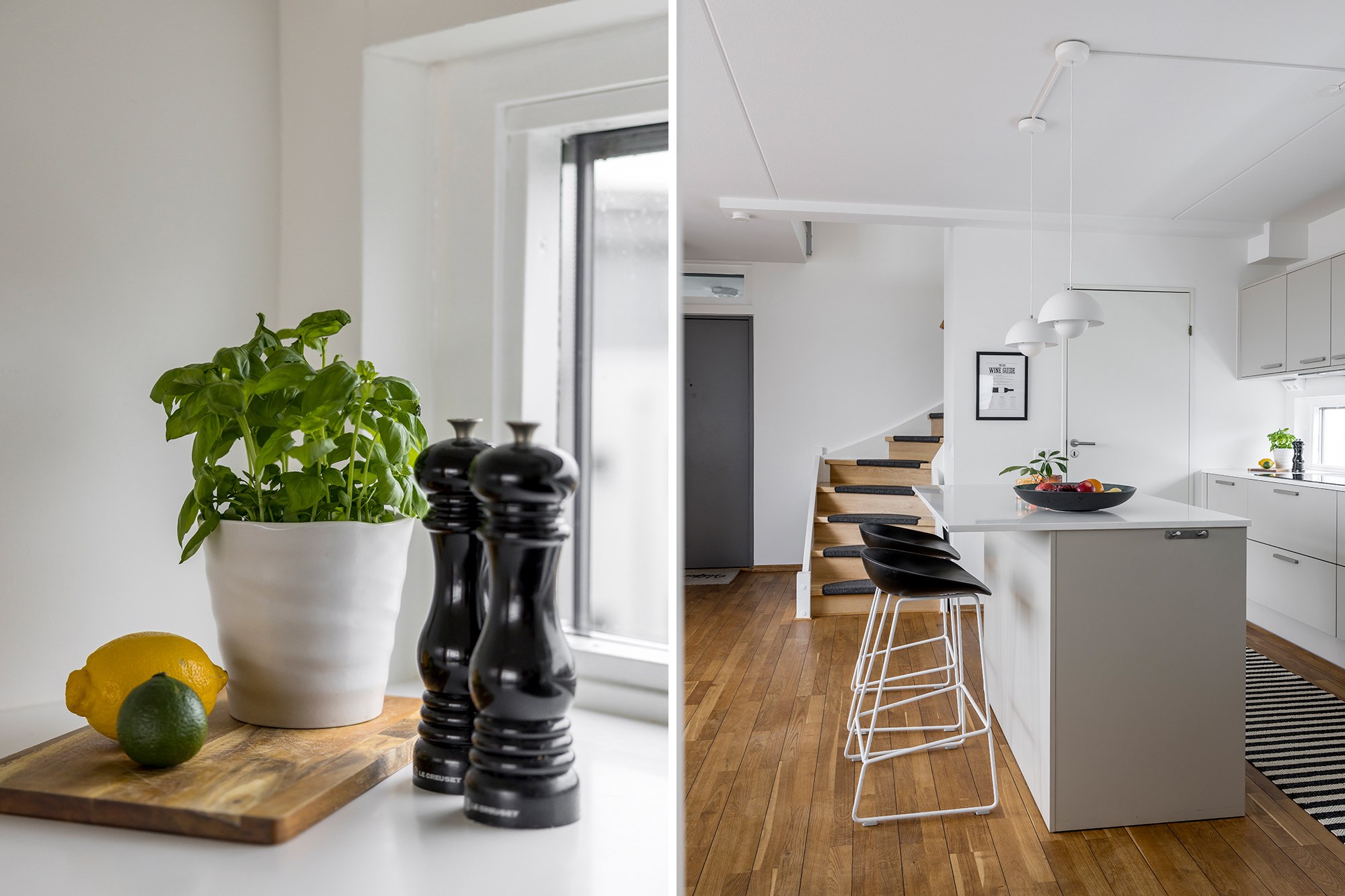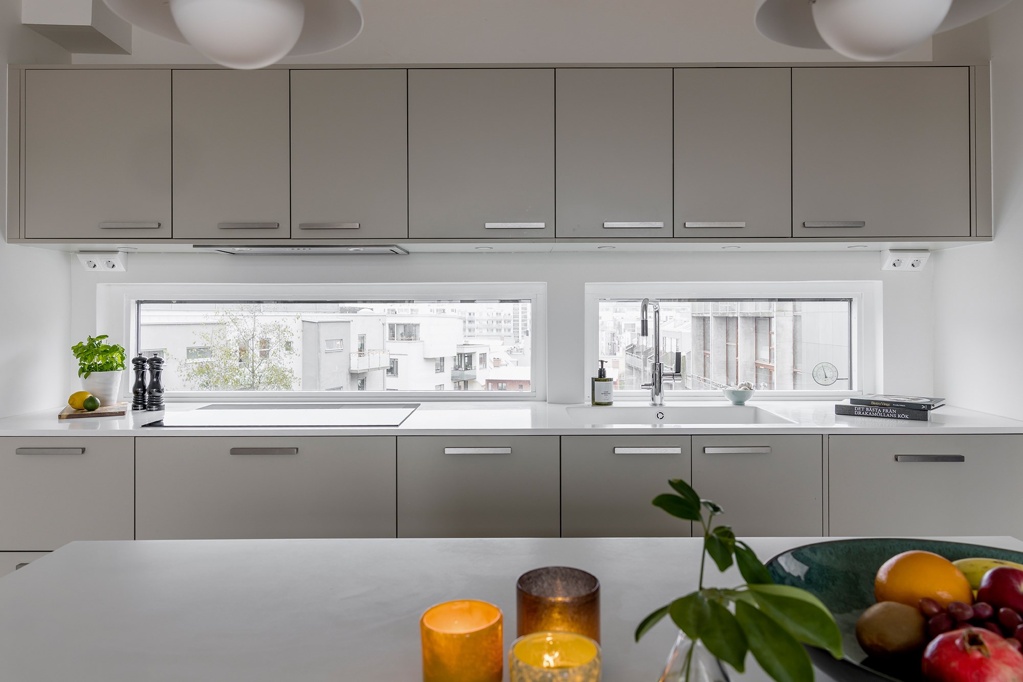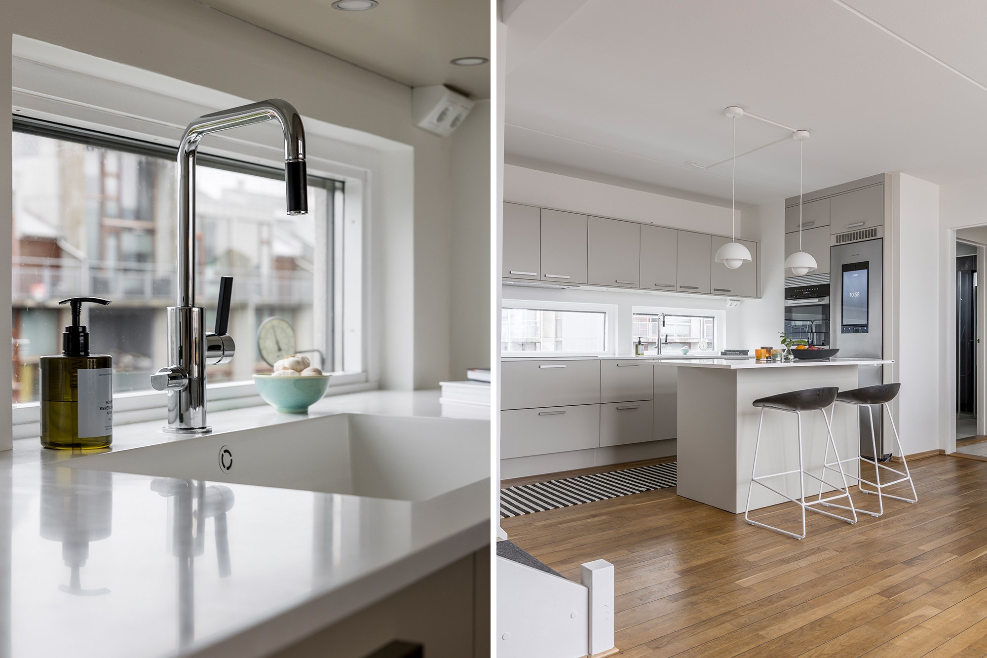 Skeppsgolv och ljusa väggar. Ljusgrå köksinredning från HTH och bänkskiva i ljus sten. Maskinell utrustning i form av induktionshäll (Miele) och köksfläkt, diskmaskin (Miele), två varmluftsugnar där en är med micro (Miele) samt kyl och frus med integrerad touchskärm med internet. Stort skafferi i anslutning till kök. Plats för matgrupp. Utgång till terass. Kök är nytt sedan 2023.