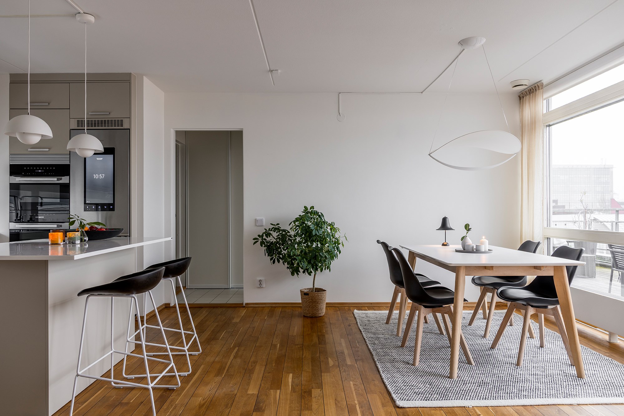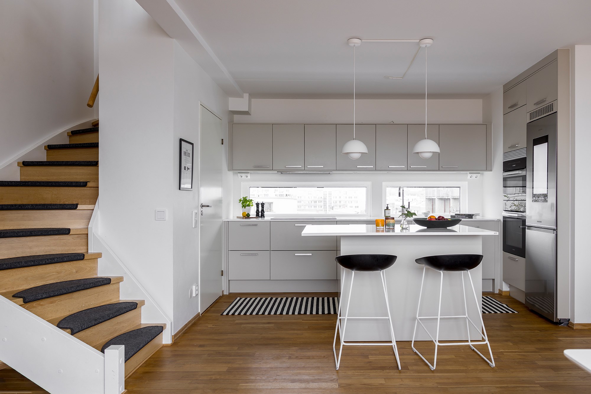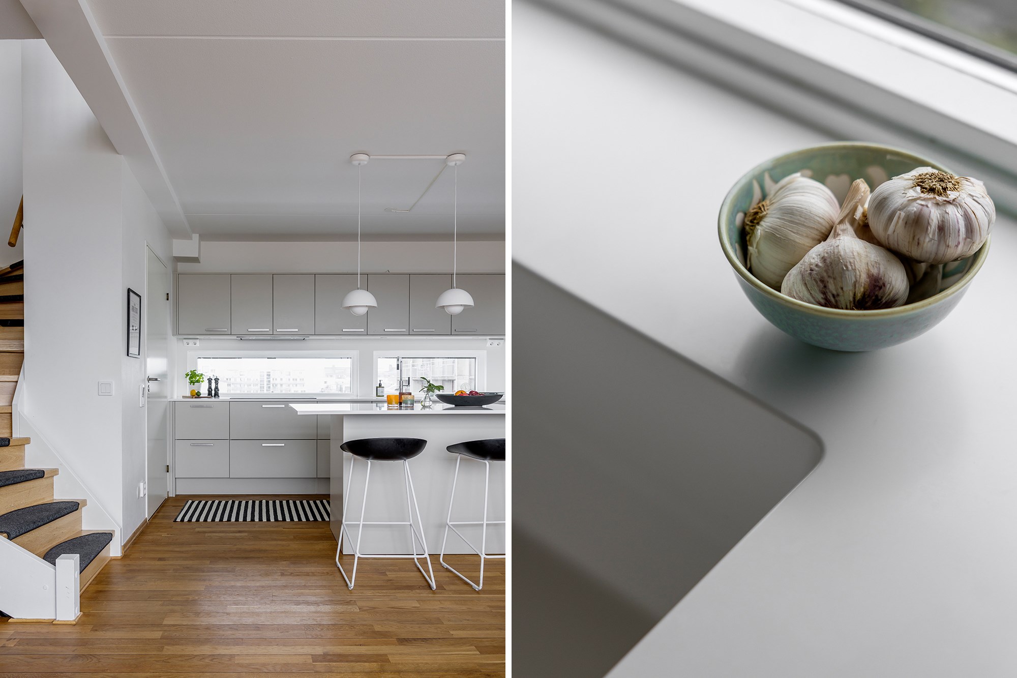 Skeppsgolv och ljusa väggar. Ljusgrå köksinredning från HTH och bänkskiva i ljus sten. Maskinell utrustning i form av induktionshäll (Miele) och köksfläkt, diskmaskin (Miele), två varmluftsugnar där en är med micro (Miele) samt kyl och frus med integrerad touchskärm med internet. Stort skafferi i anslutning till kök. Plats för matgrupp. Utgång till terass. Kök är nytt sedan 2023.