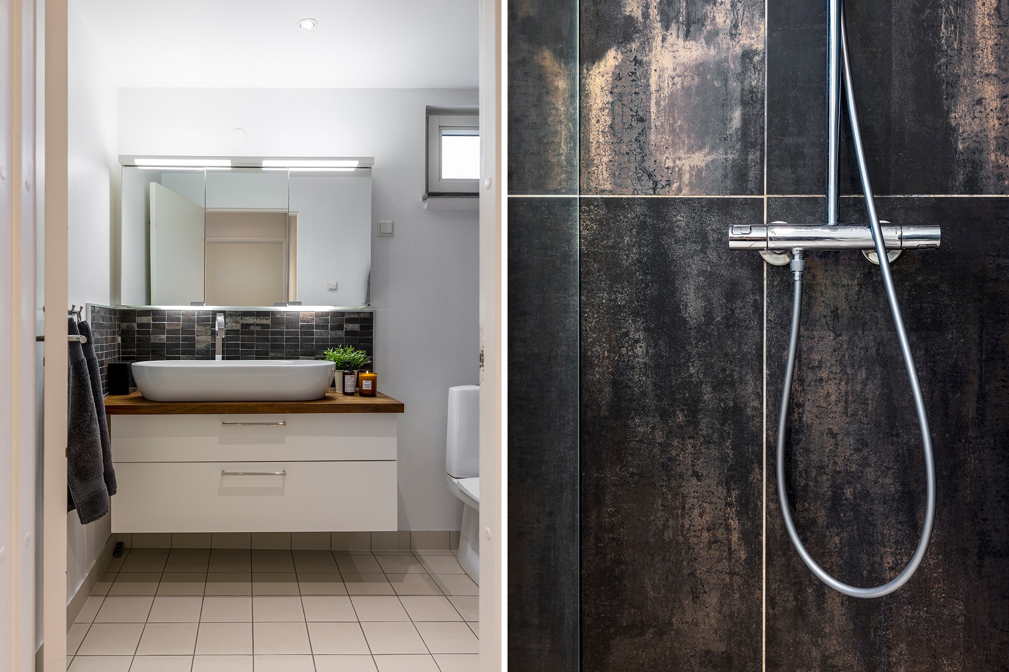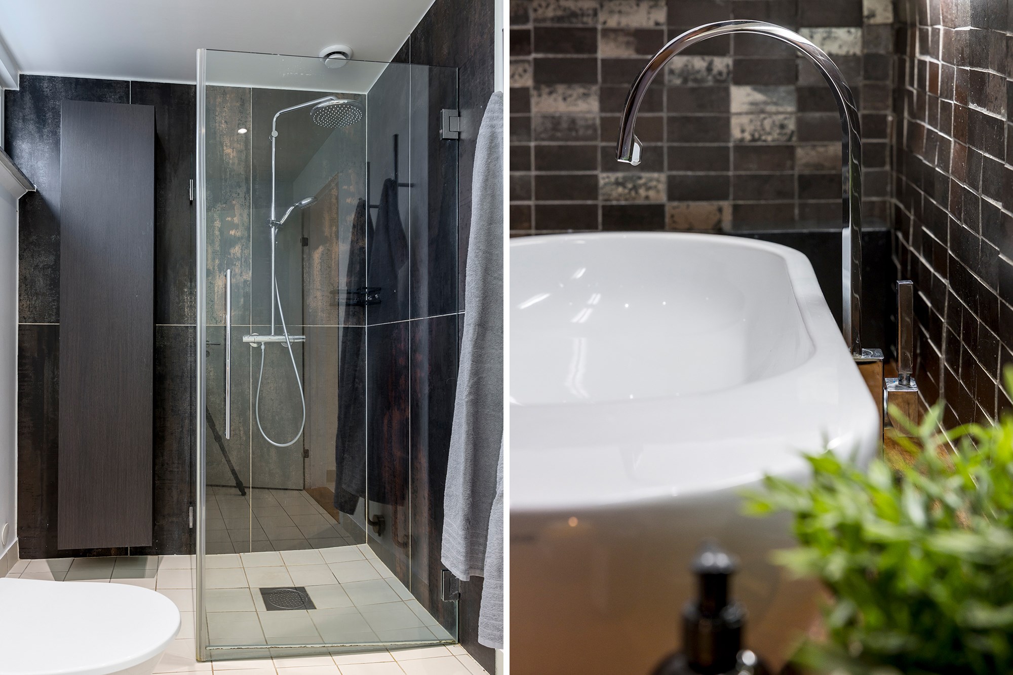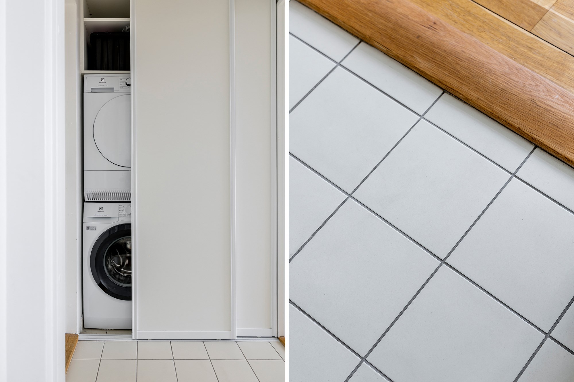 Ljust klinker och ljusa väggar. Mörkt kakel vid duschparti. Utrustad med WC, handfat med kommod, dusch och förvaringsskåp. Tvättmaskin och torktumlare i anslutning till badrum, båda från 2024/2025.