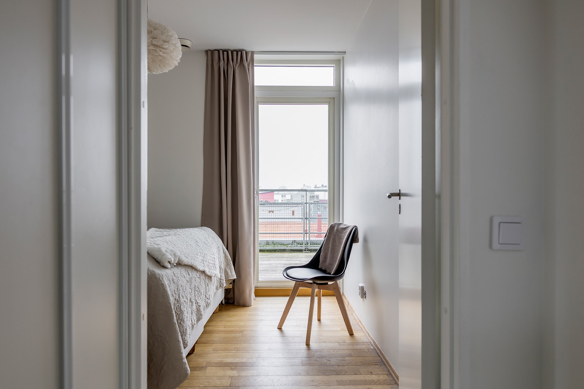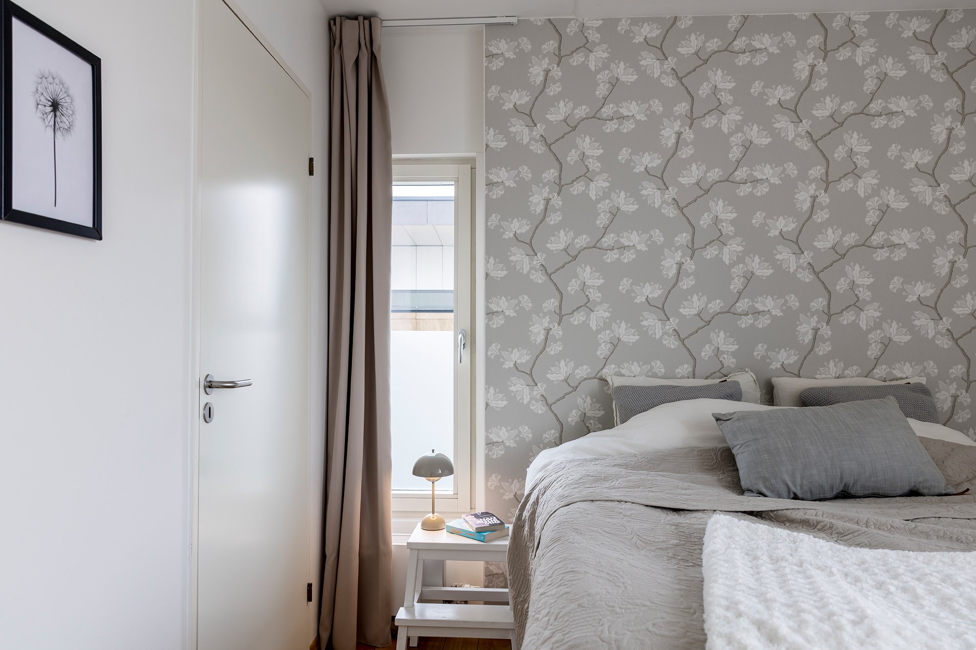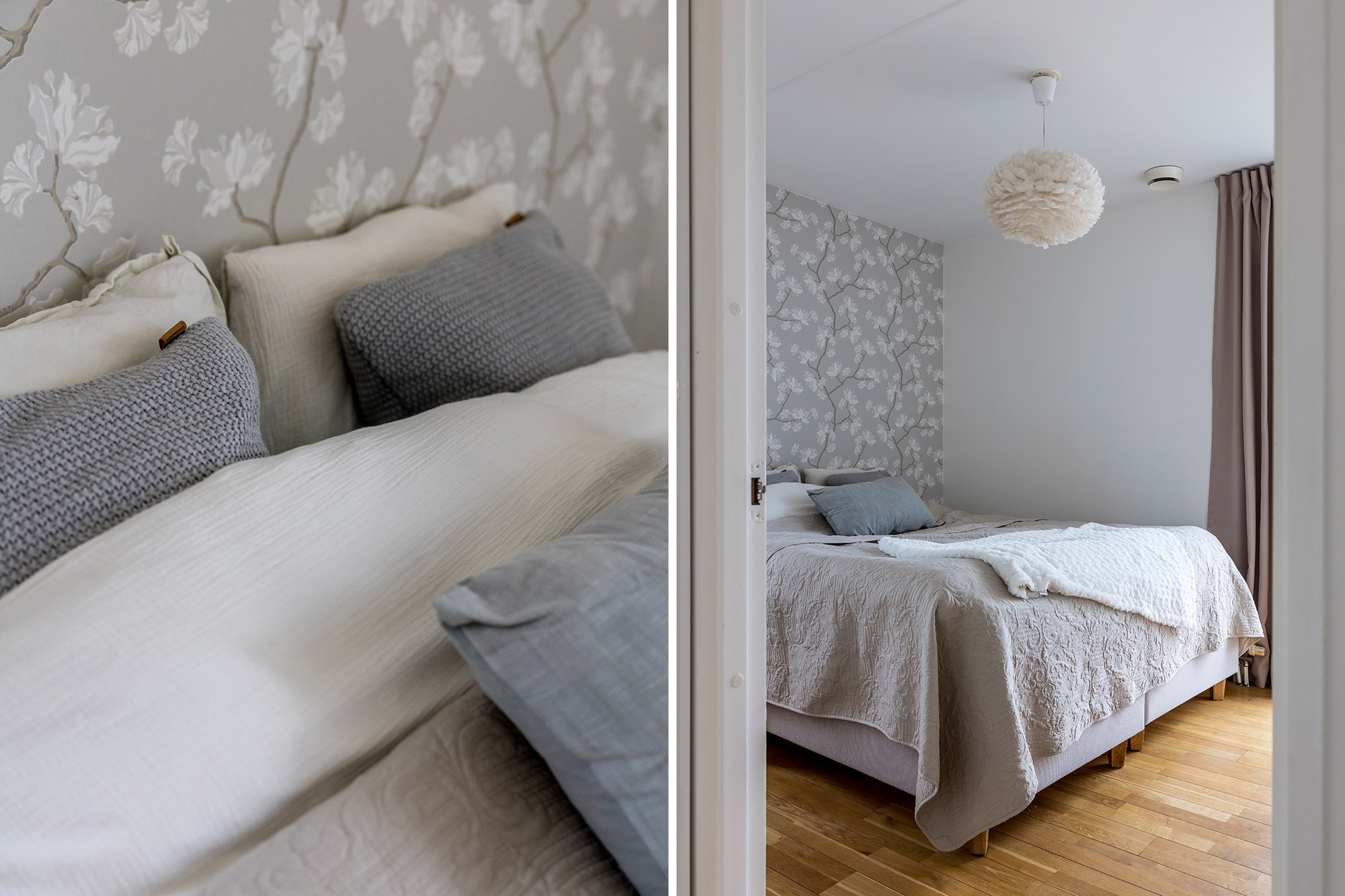 Skeppsgolv och ljusa väggar. Fondvägg med mönstrad tapet. Ingång till klädkammare.