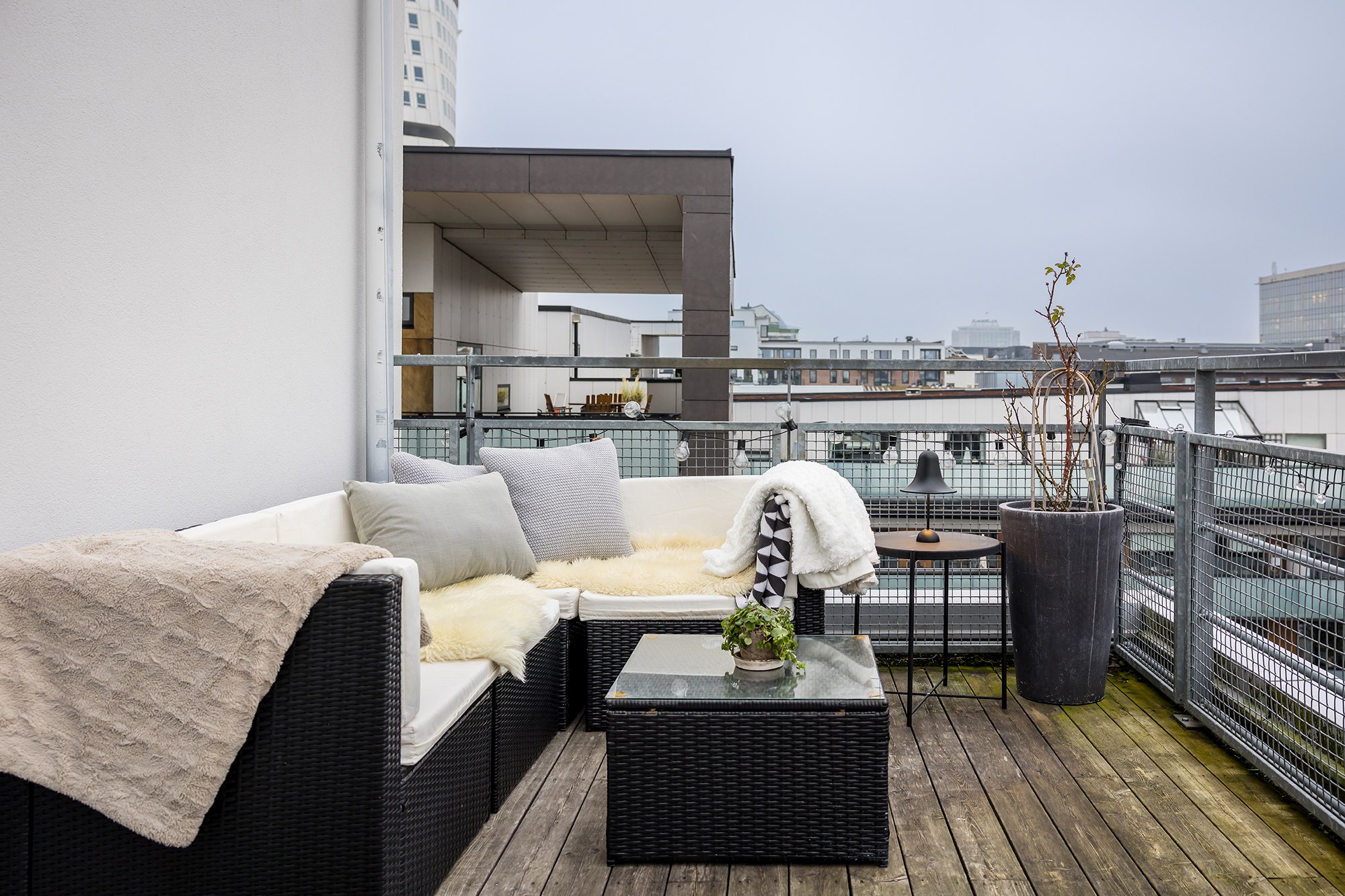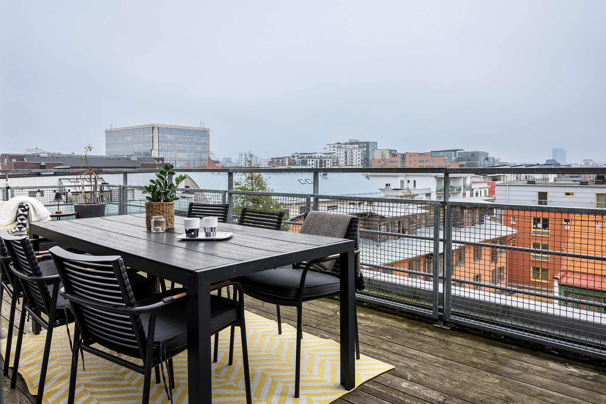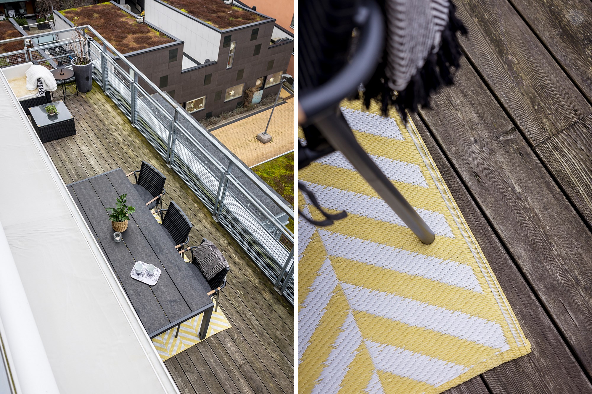 Terassens generösa storlek möjliggör möblering av matplats och umgängesyta. Eldriven markis är installerad över terassen.