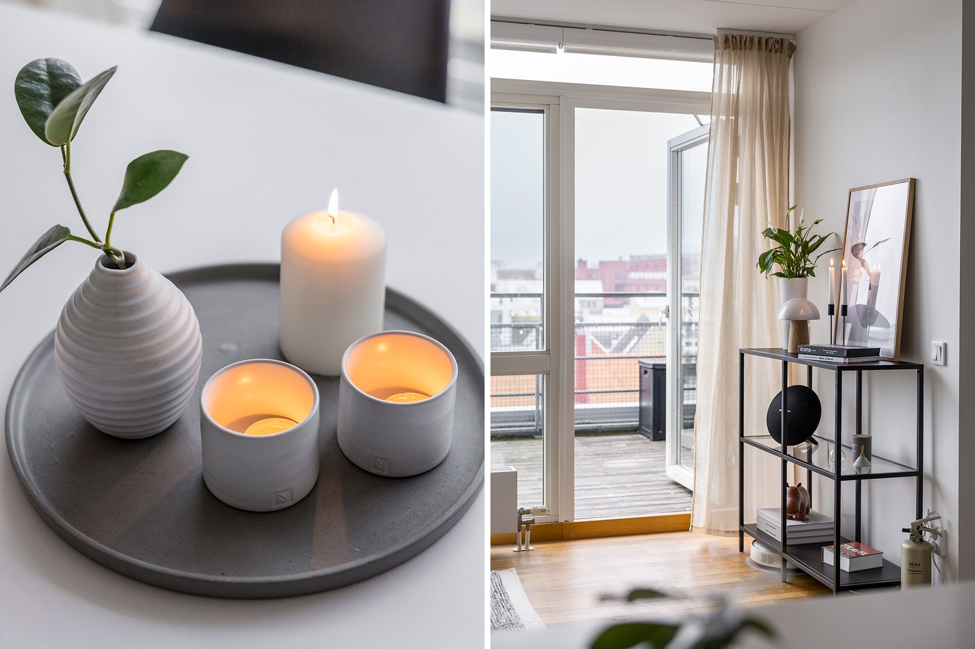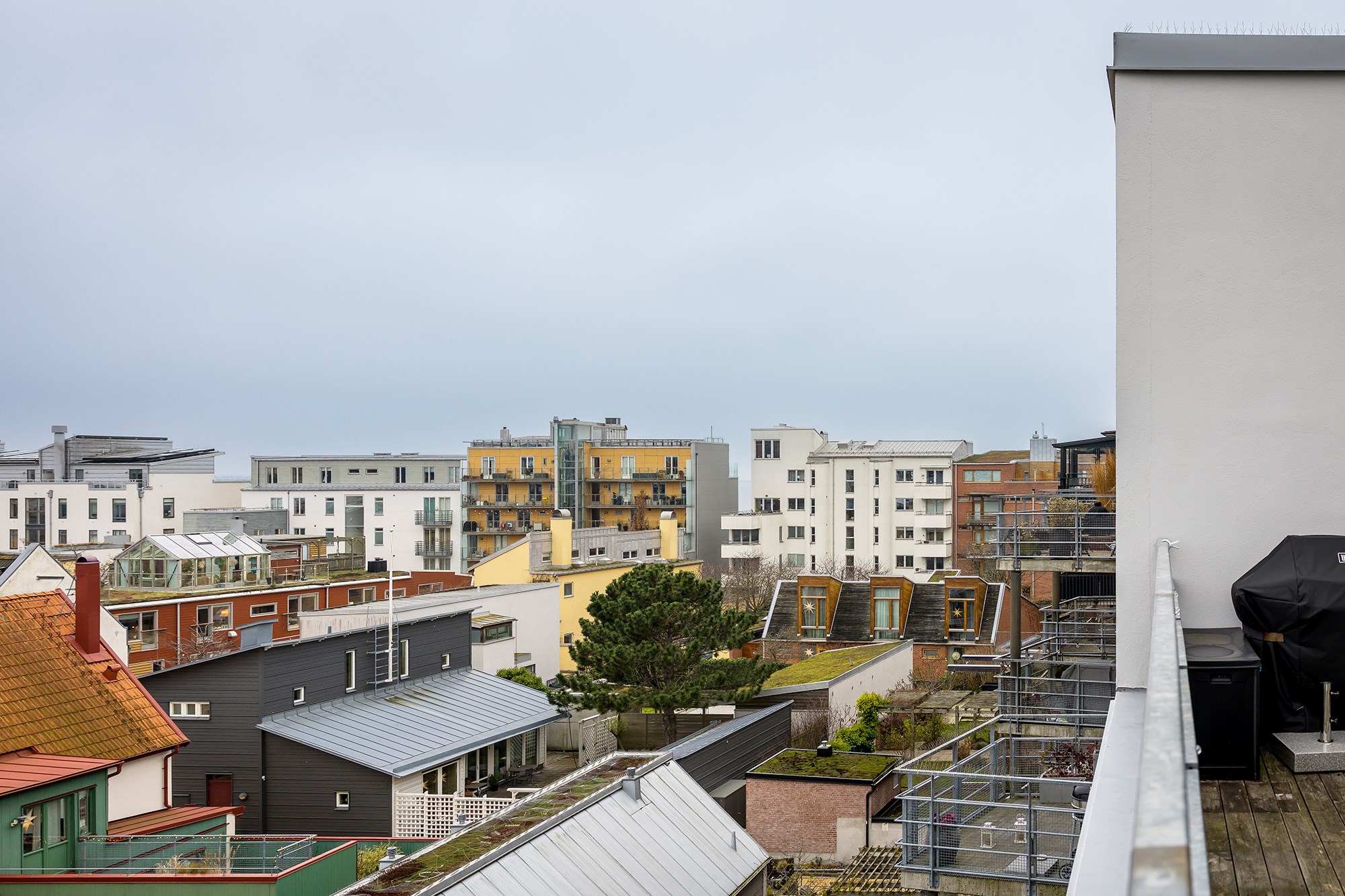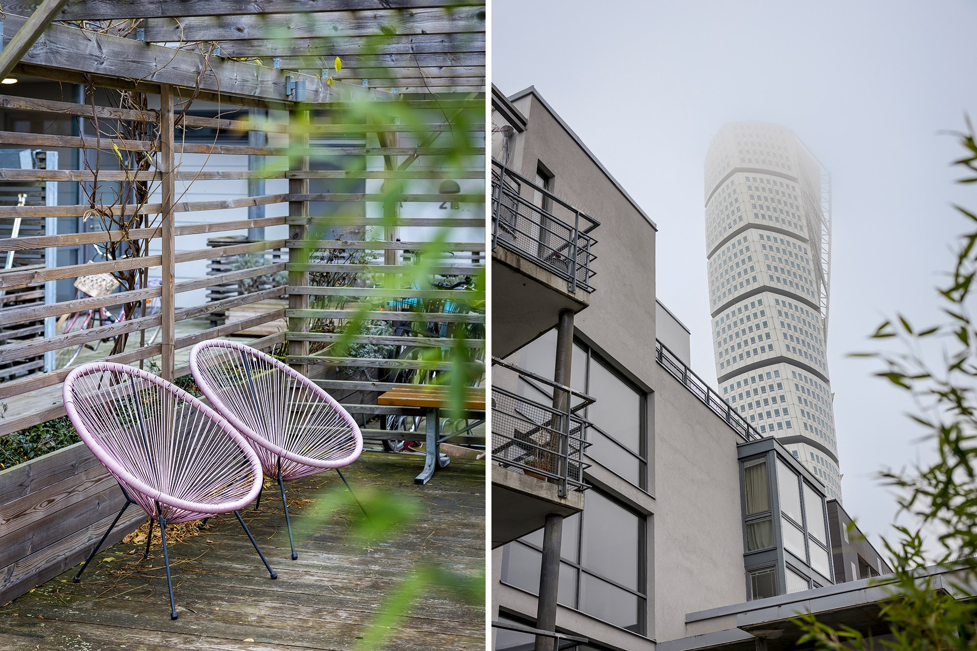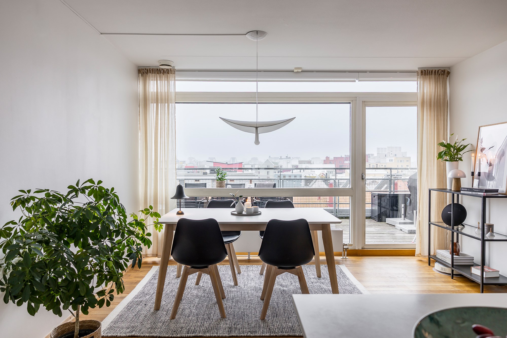 Terassens generösa storlek möjliggör möblering av matplats och umgängesyta. Eldriven markis är installerad över terassen.
