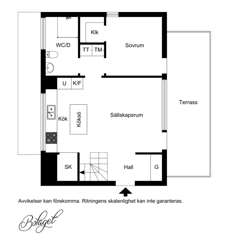 Skeppsgolv och ljusa väggar. Plats för avhängning. Garderob och skoförvaring.