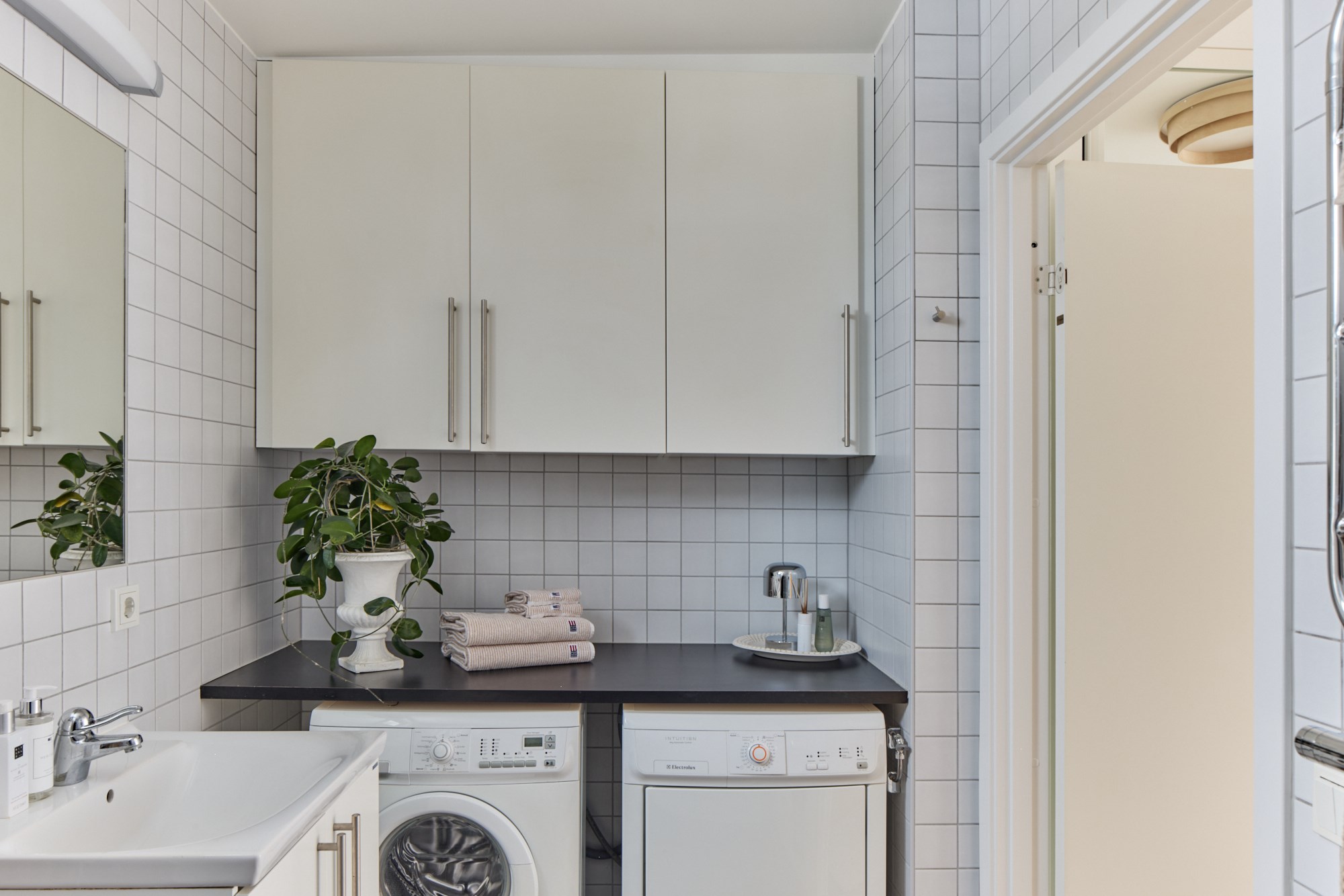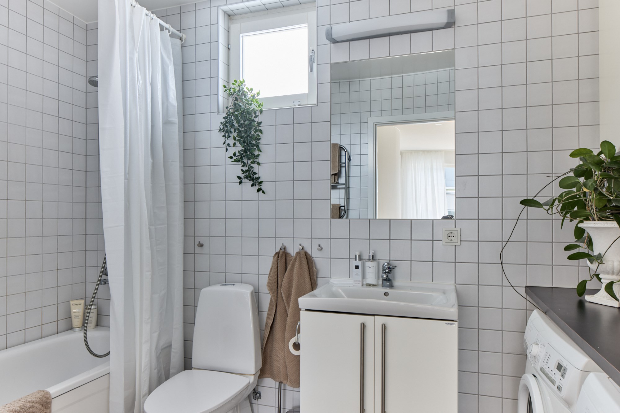 Helkaklat badrum. Mörk klinker till golv och vita kaklade väggar. Utrustad med WC, handfat med vit kommod, badkar med duschmunstycke, handdukstork, tvättmaskin och torktumlare. Arbetsbänk och förvaringsskåp.