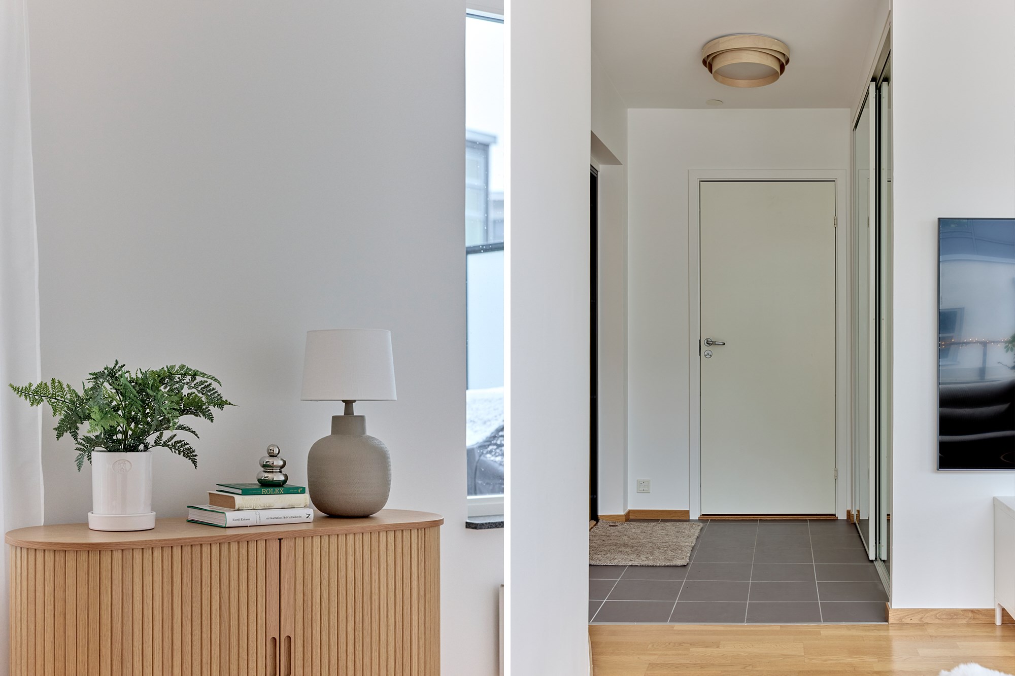 Mörk klinker och ljusa släta väggar. Plats för avhängning. Garderob med skjutdörrar.