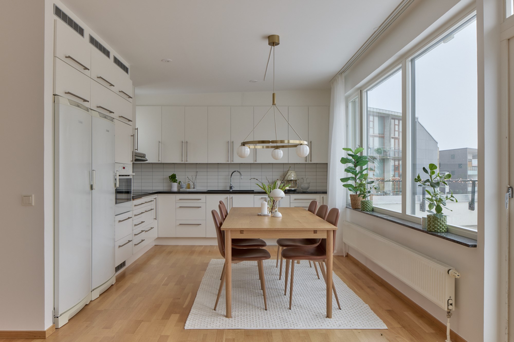 Parkettgolv och ljusa släta väggar. Vit köksinredning med bänkskiva i mörk sten. Maskinell utrustning i form av induktionshäll och fläkt, ugn, diskmaskin, hel kyl och frys.
