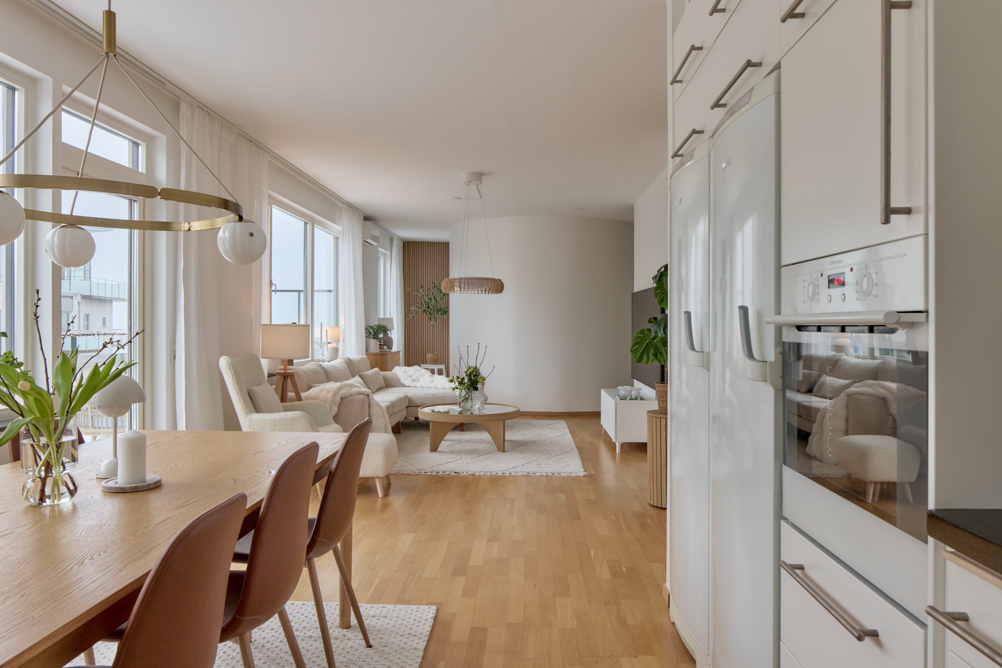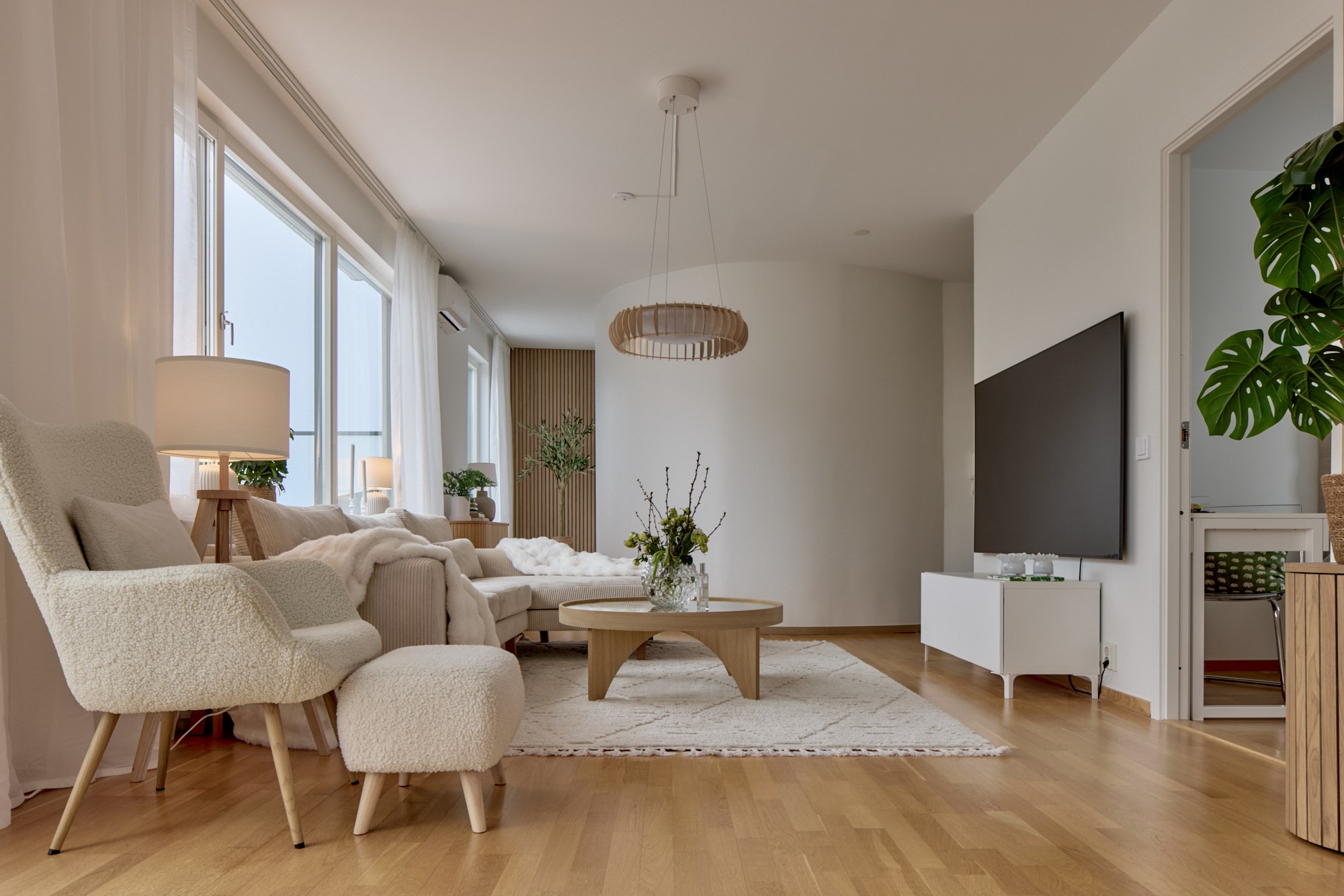 Parkettgolv och ljusa släta väggar. I direkt anslutning till kök samt matplats. Vägg dekorerad med akustikpanel. Utgång till terass.