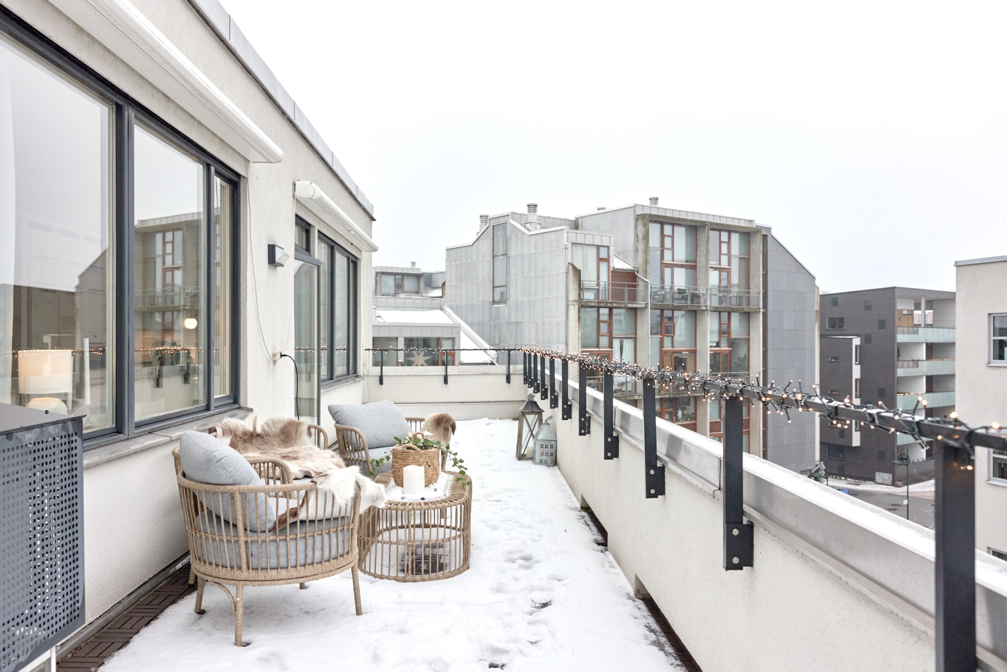 Rymlig storlek på terrass med plats för sällskapsyta och matgrupp.