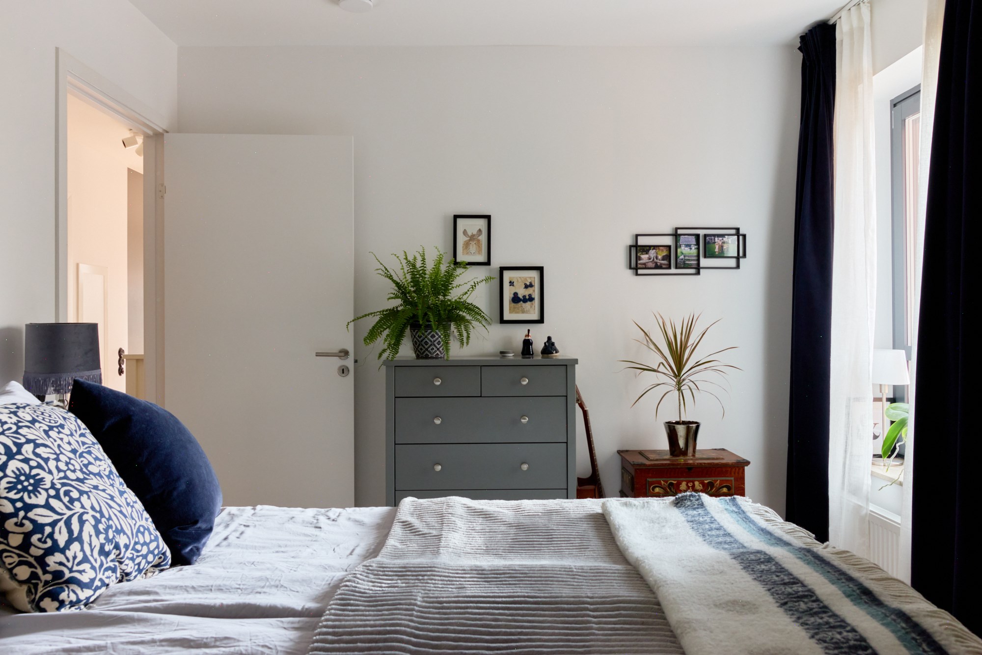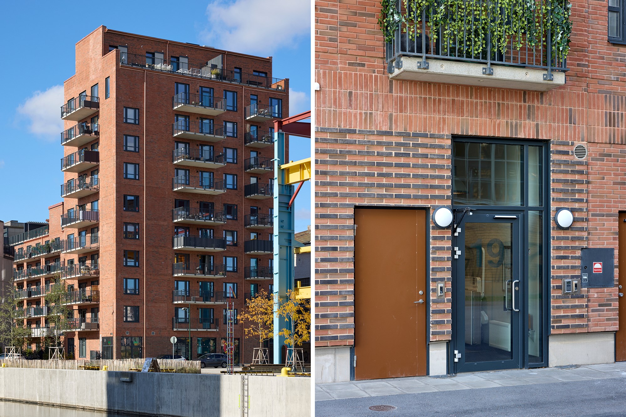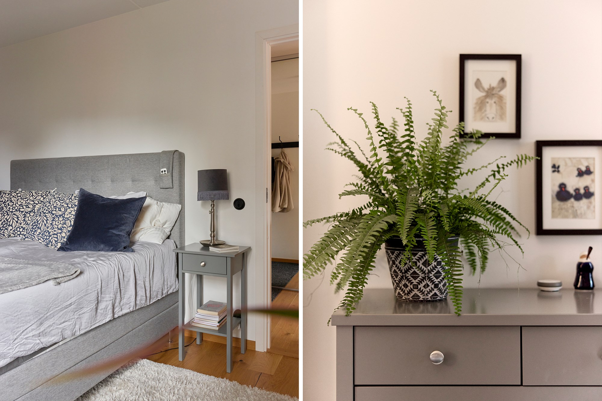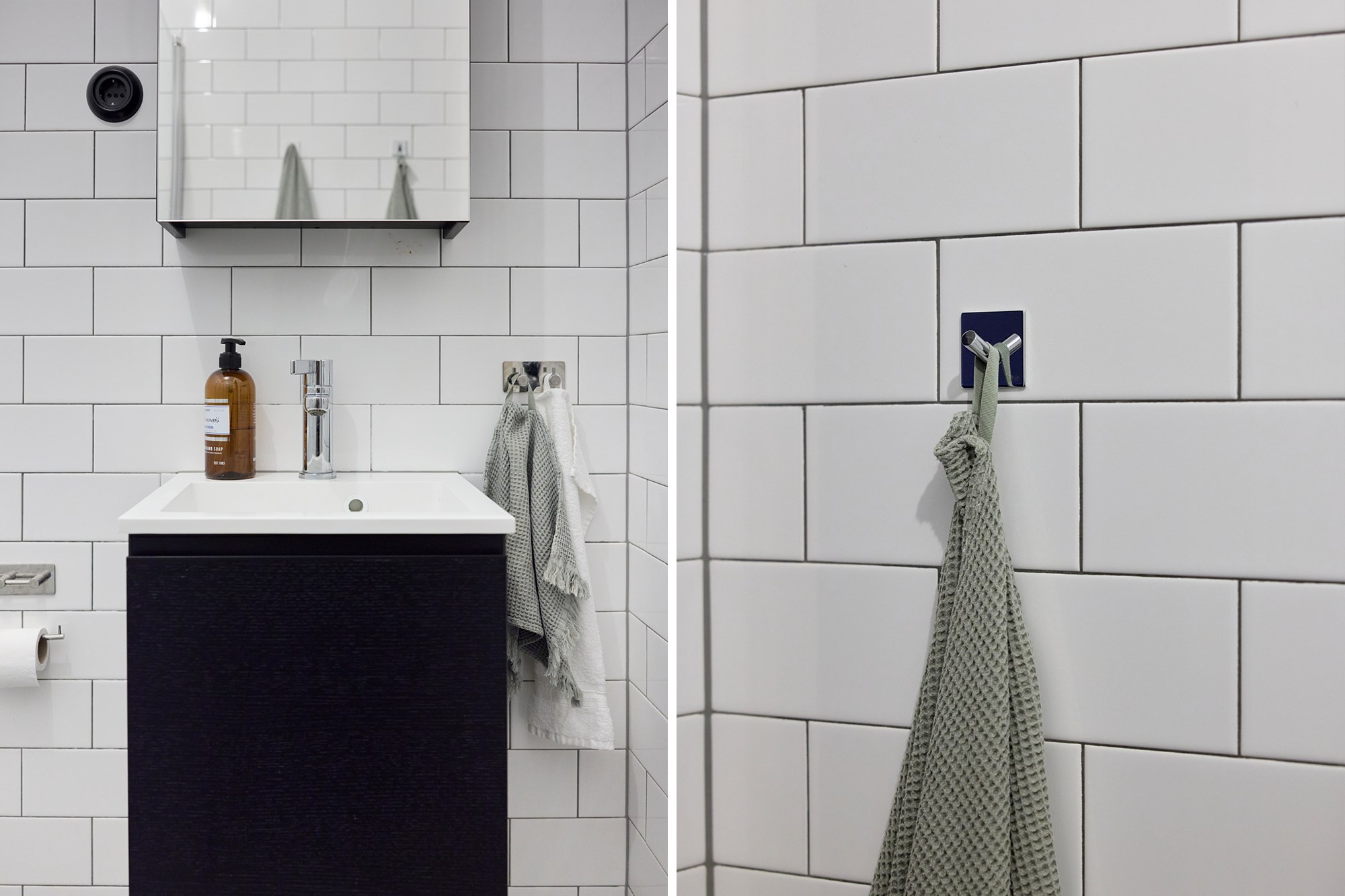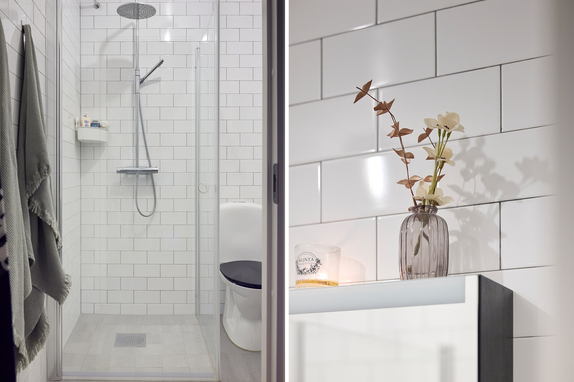 Mörk klinker till golv och ljusa väggar. Förvaring i skjutdörrsgarderob.