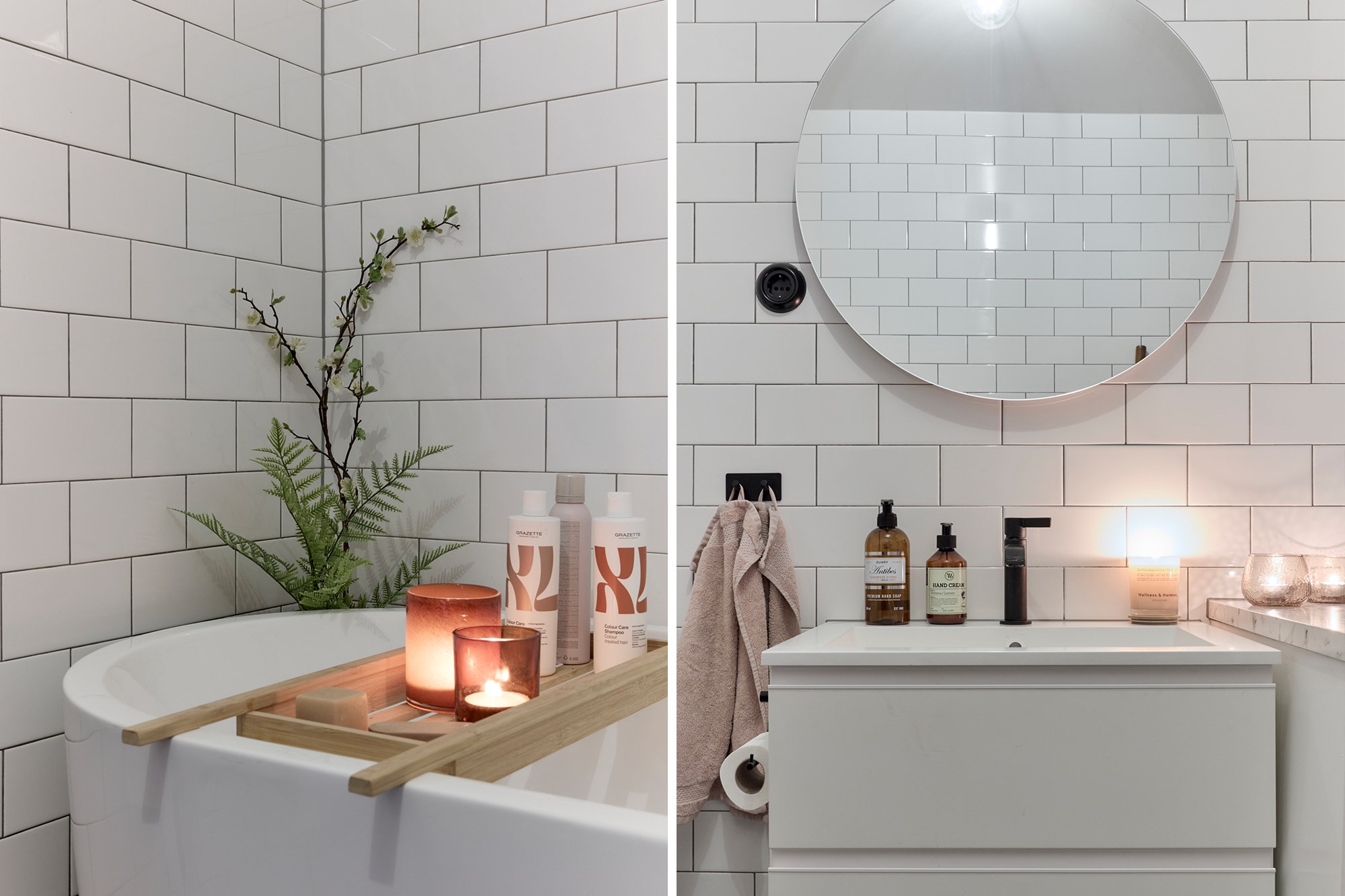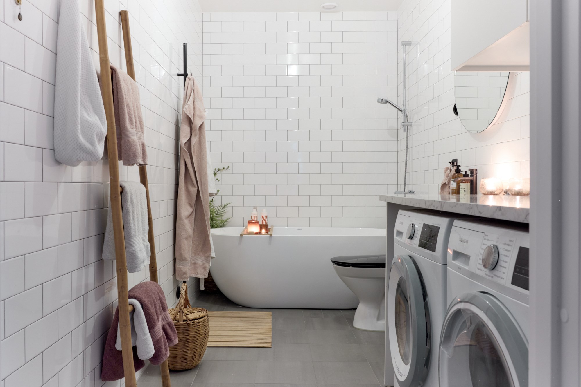 Helkaklat badrum. Ljusgrå klinker till golv och vita kaklade väggar. Utrustad med WC, handfat med kommod, badkar med duschmöjlighet, tvättmaskin samt torktumlare, arbetsbänk och förvaringsskåp