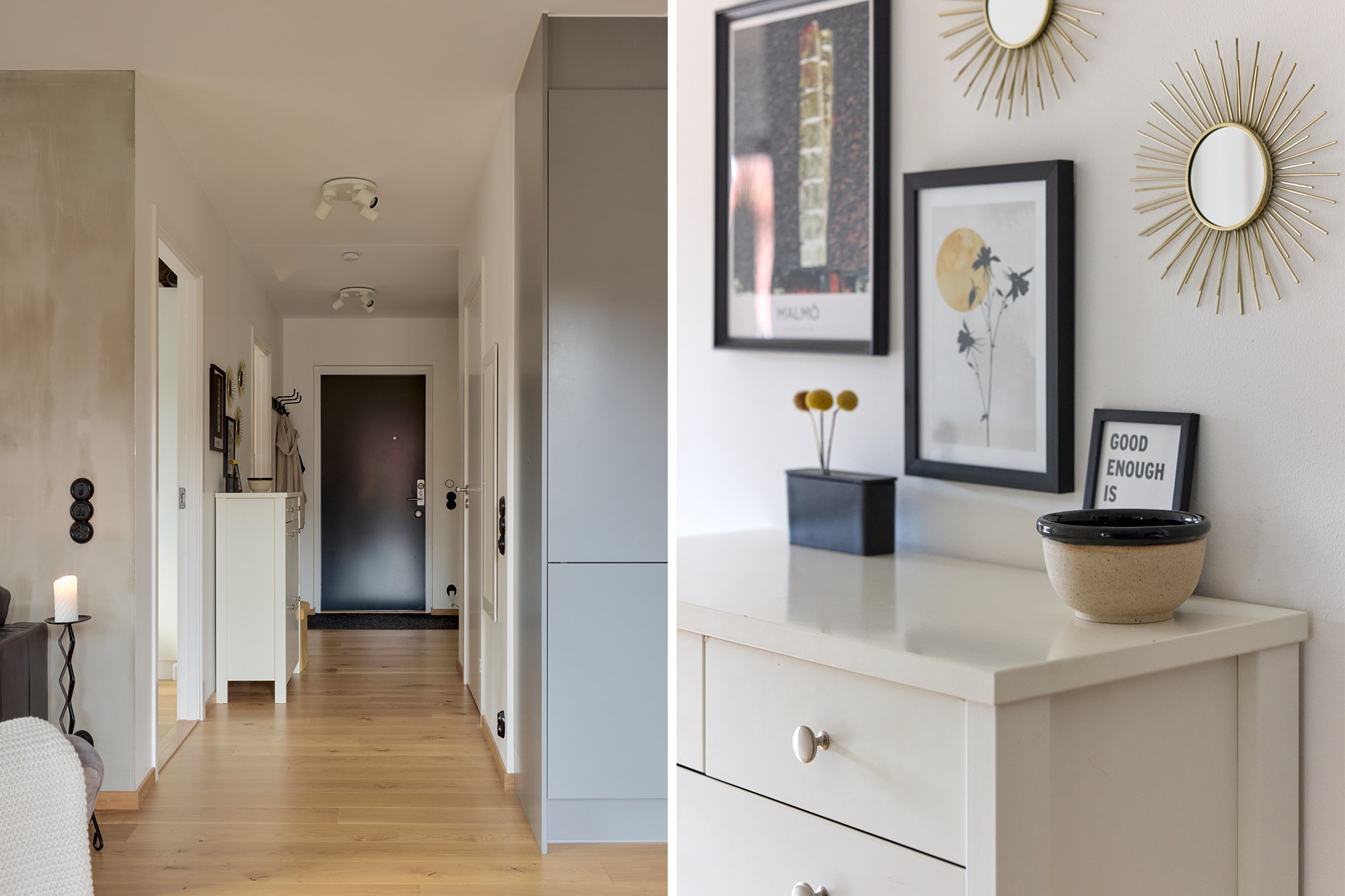 1-stav parkettgolv och ljusa väggar. Ingång till klädgarderob.