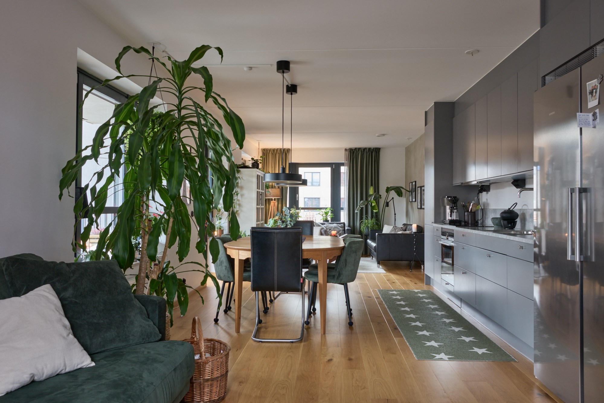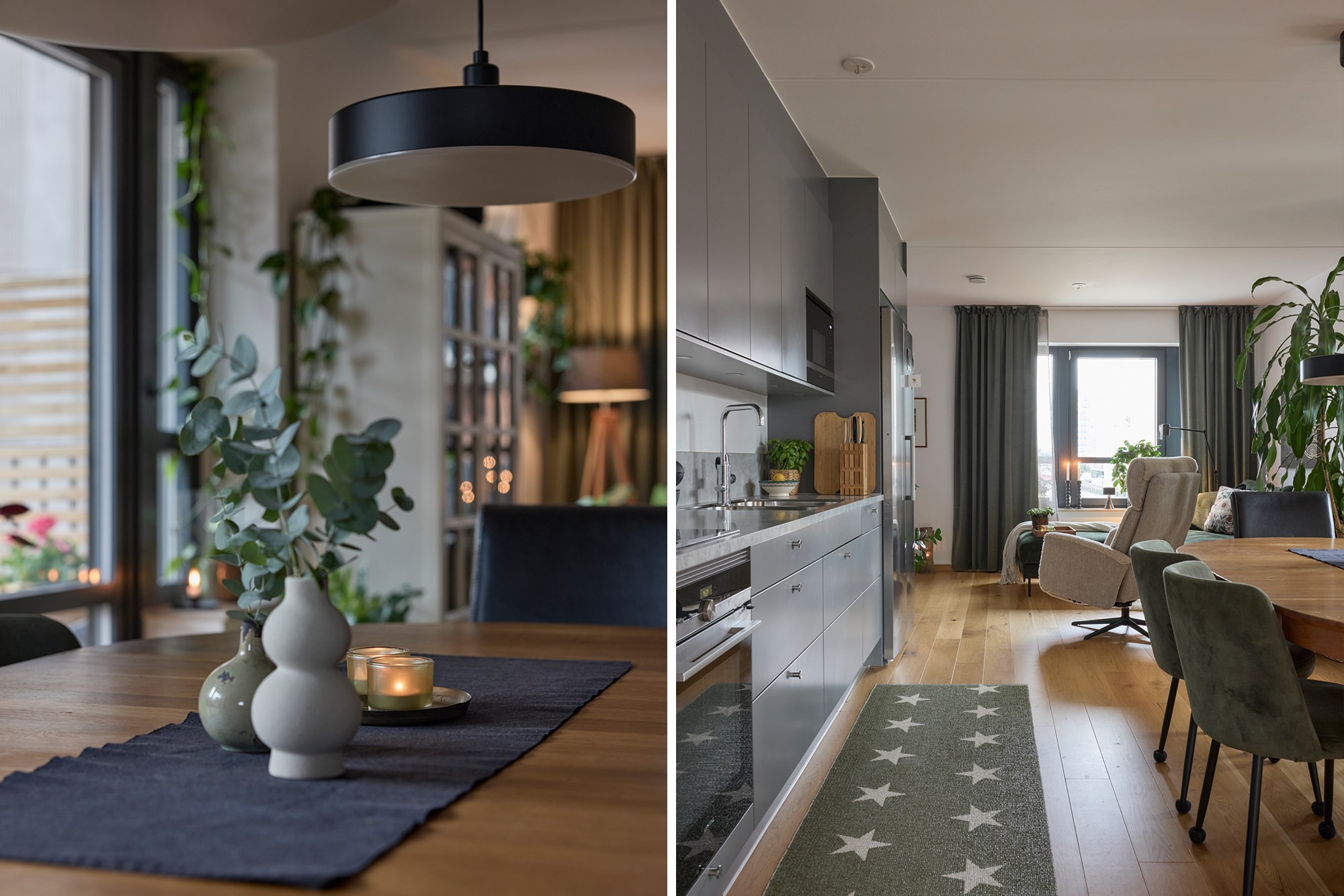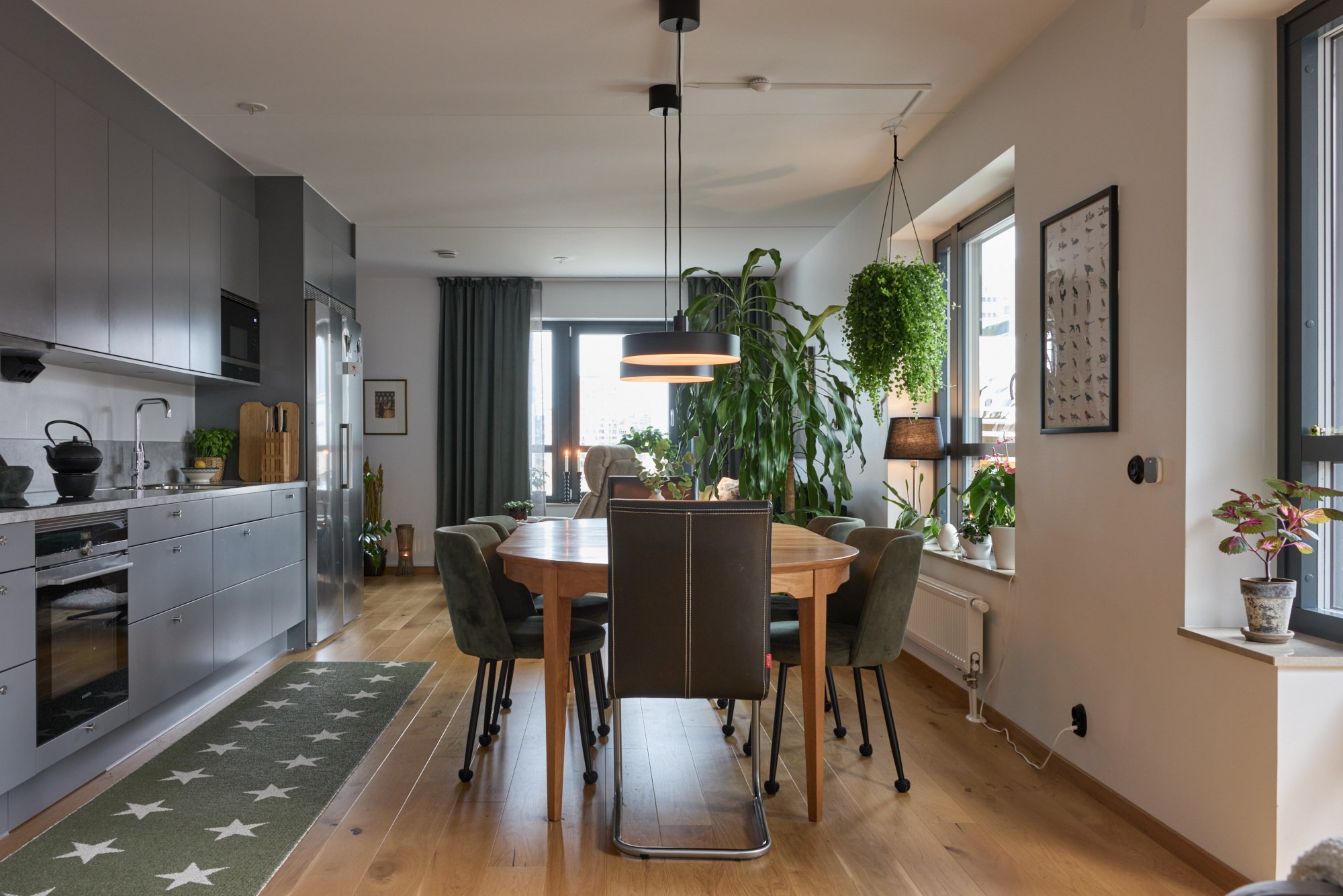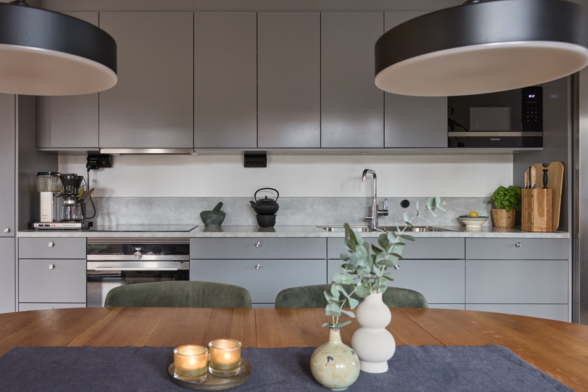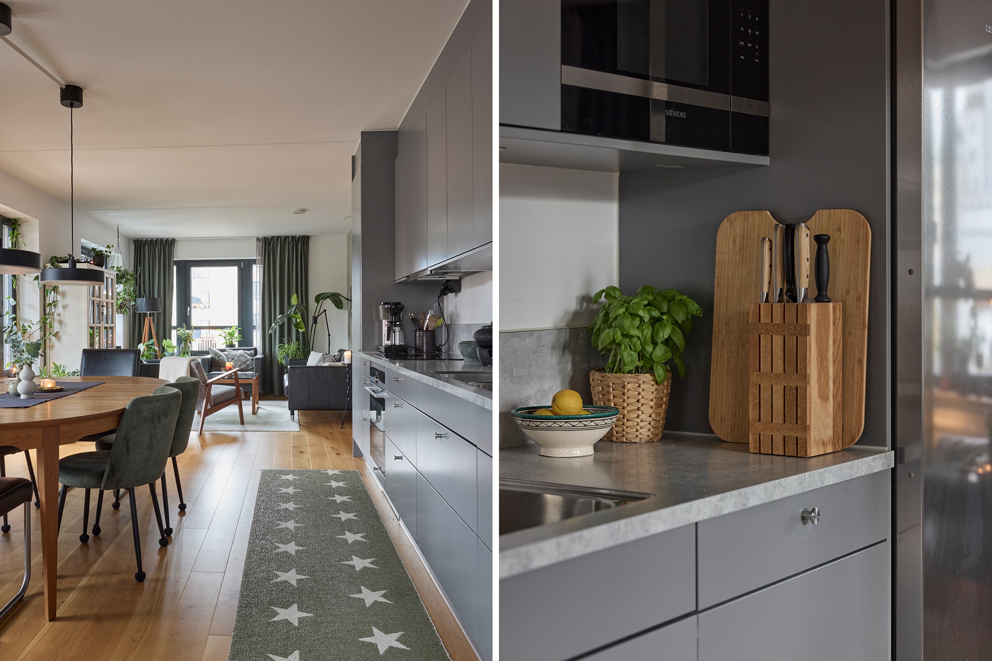1-stav parkettgolv och ljusa väggar. Grå köksinredning och bänkskiva i grå laminat. Maskinell utrustning i form av ugn, induktionshäll och fläkt, integrerad mikrovågsugn, diskmaskin, hel kyl och hel frys. Plats för matgrupp.