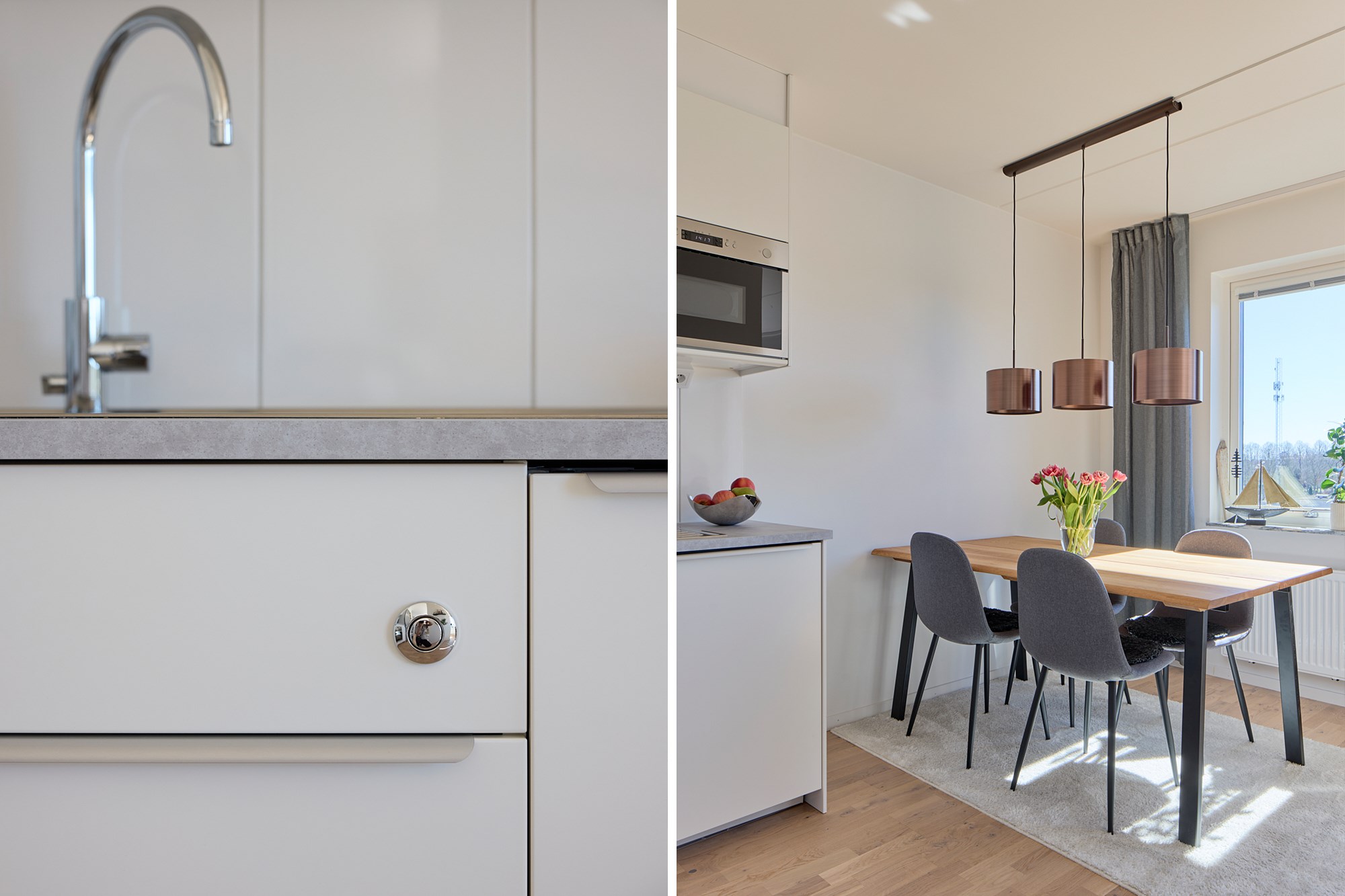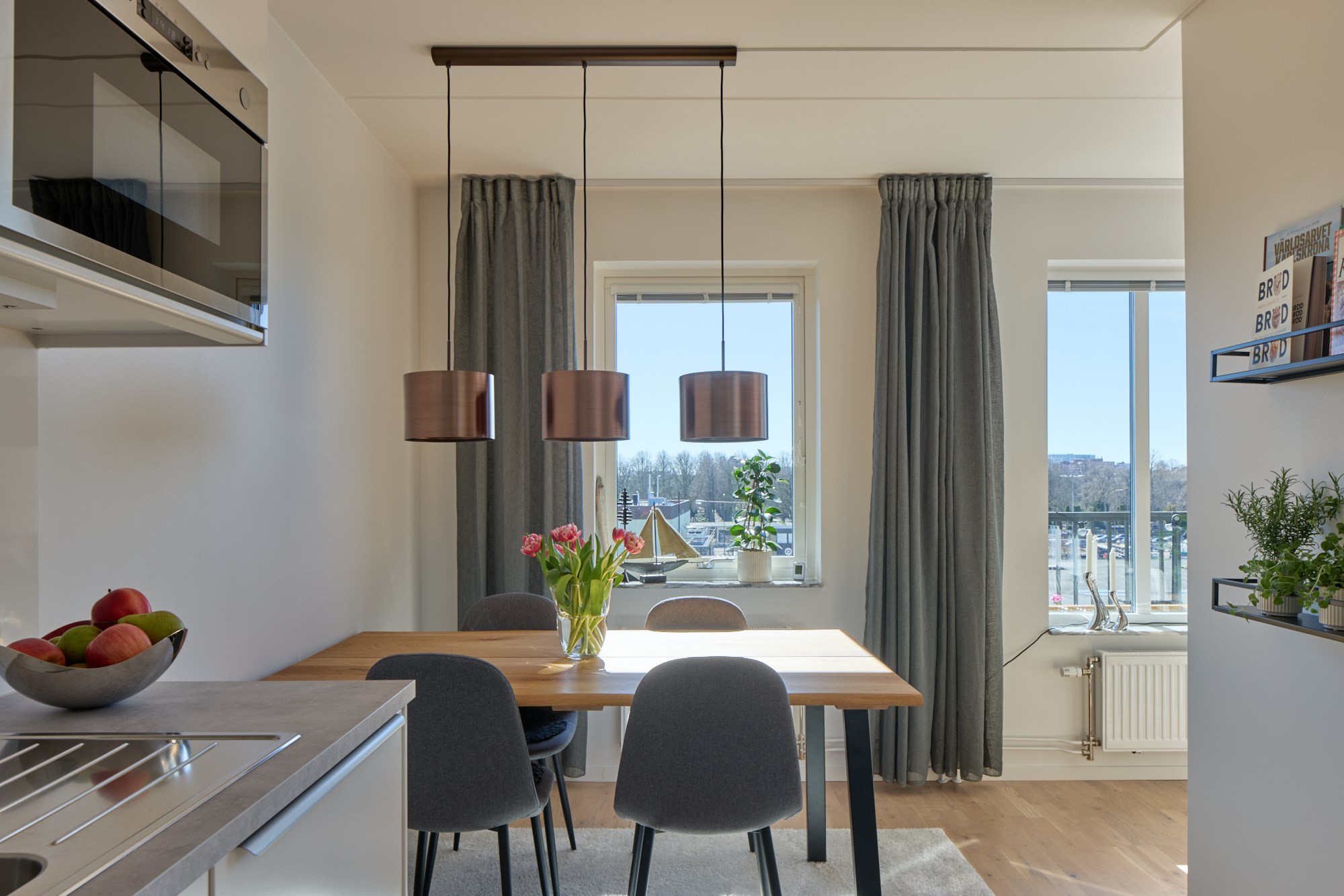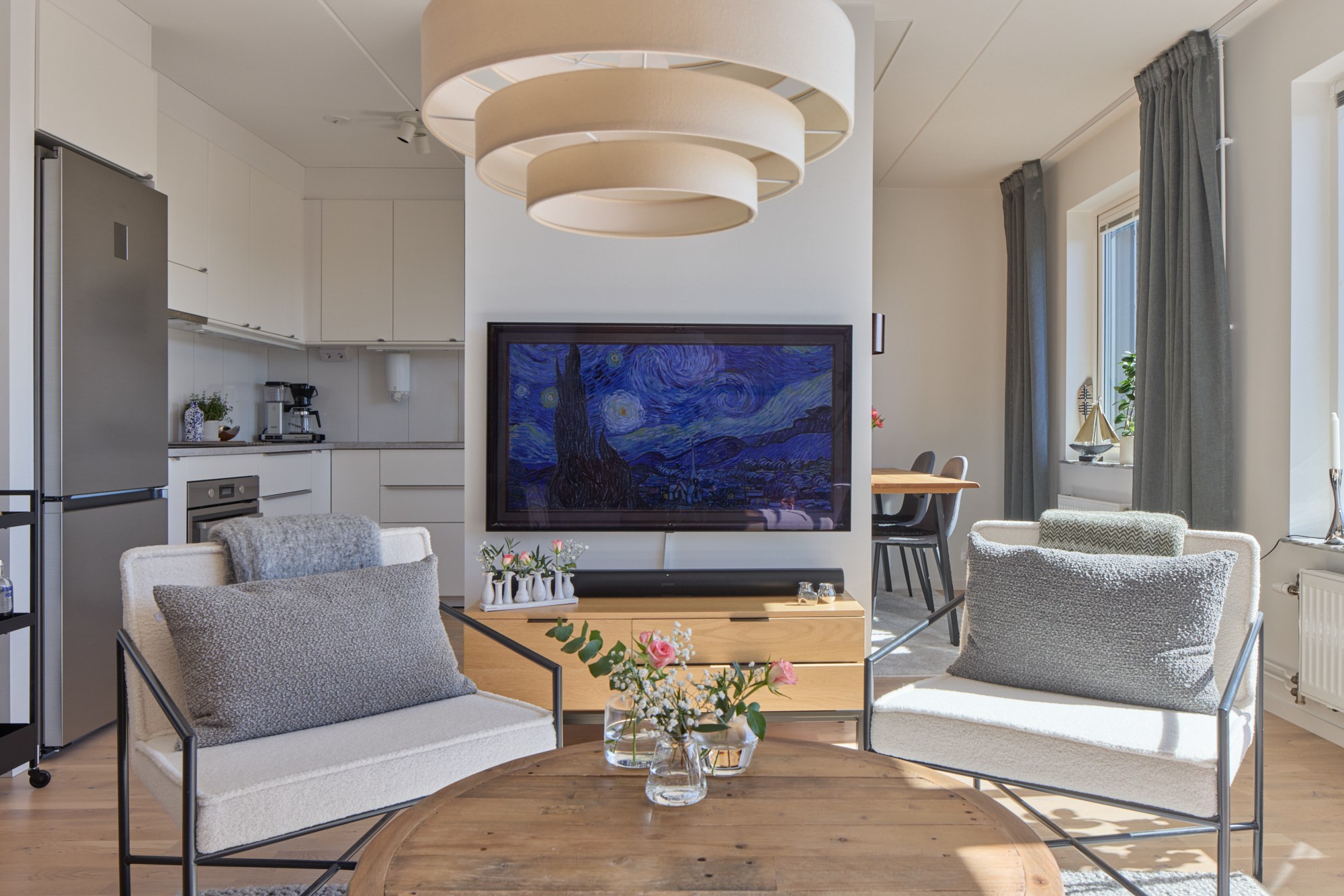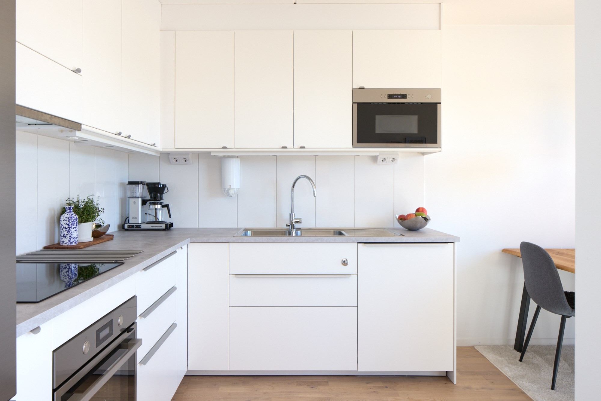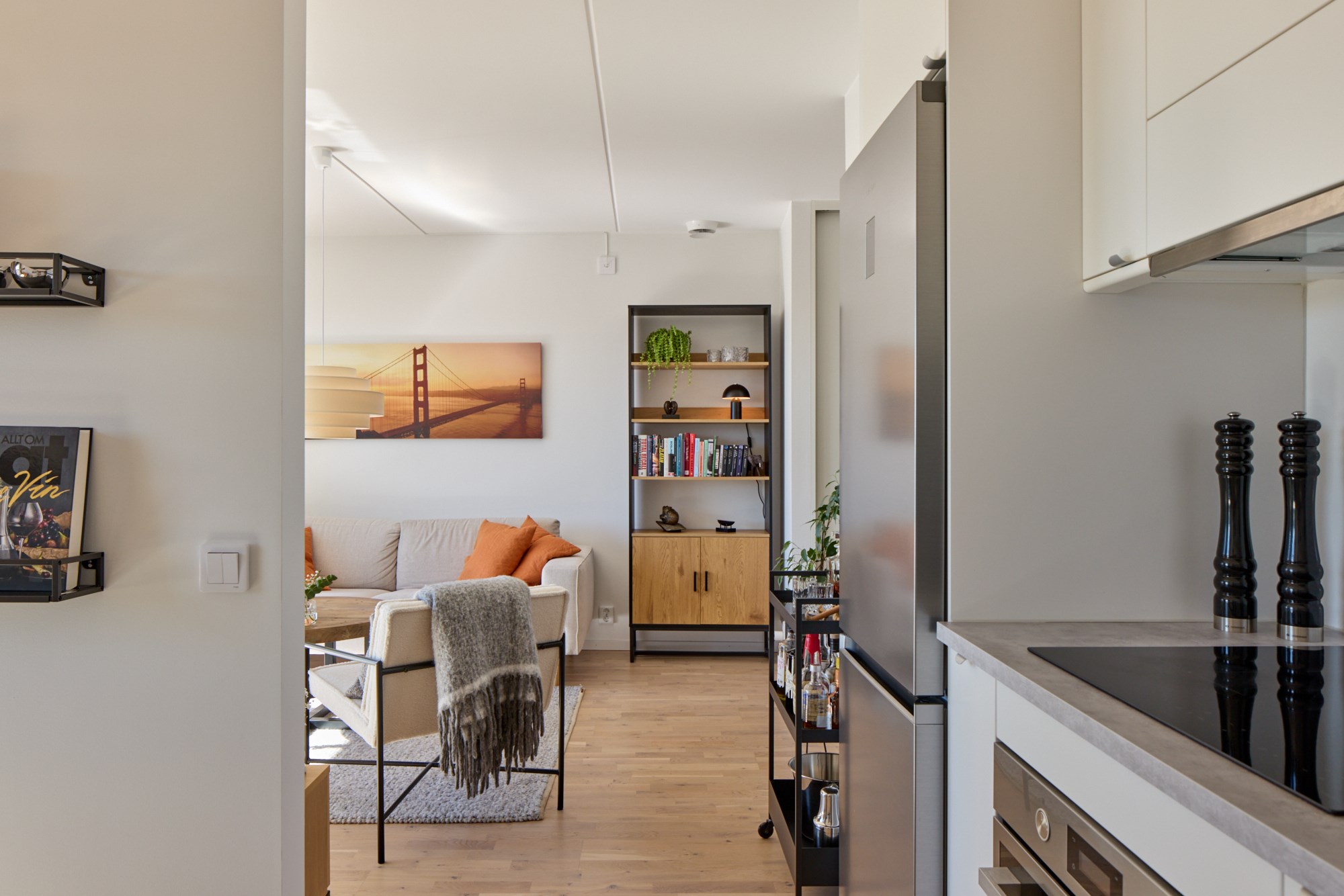 Parkettgolv och ljusa väggar. Vit köksinredning. Maskinell utrustning i form av induktionshäll och fläkt, ugn, mikrovågsugn, markisen, diskmaskin, delad kyl och frys. Direkt anslutning till matplats.