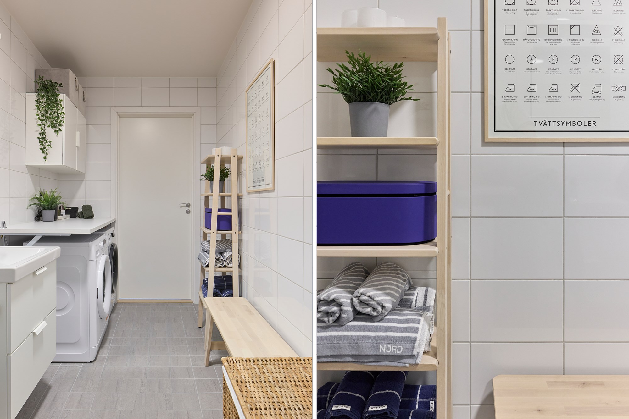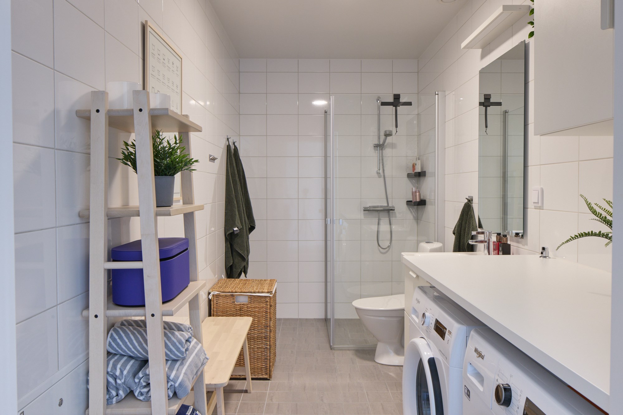 Helkaklat badrum. Grått klinker till golv och vita kaklade väggar. Utrustad med WC, handfat med vit kommod, spegel, dusch, tvättmaskin och torktumlare med arbetsbänk ovan samt skåpsförvaring.