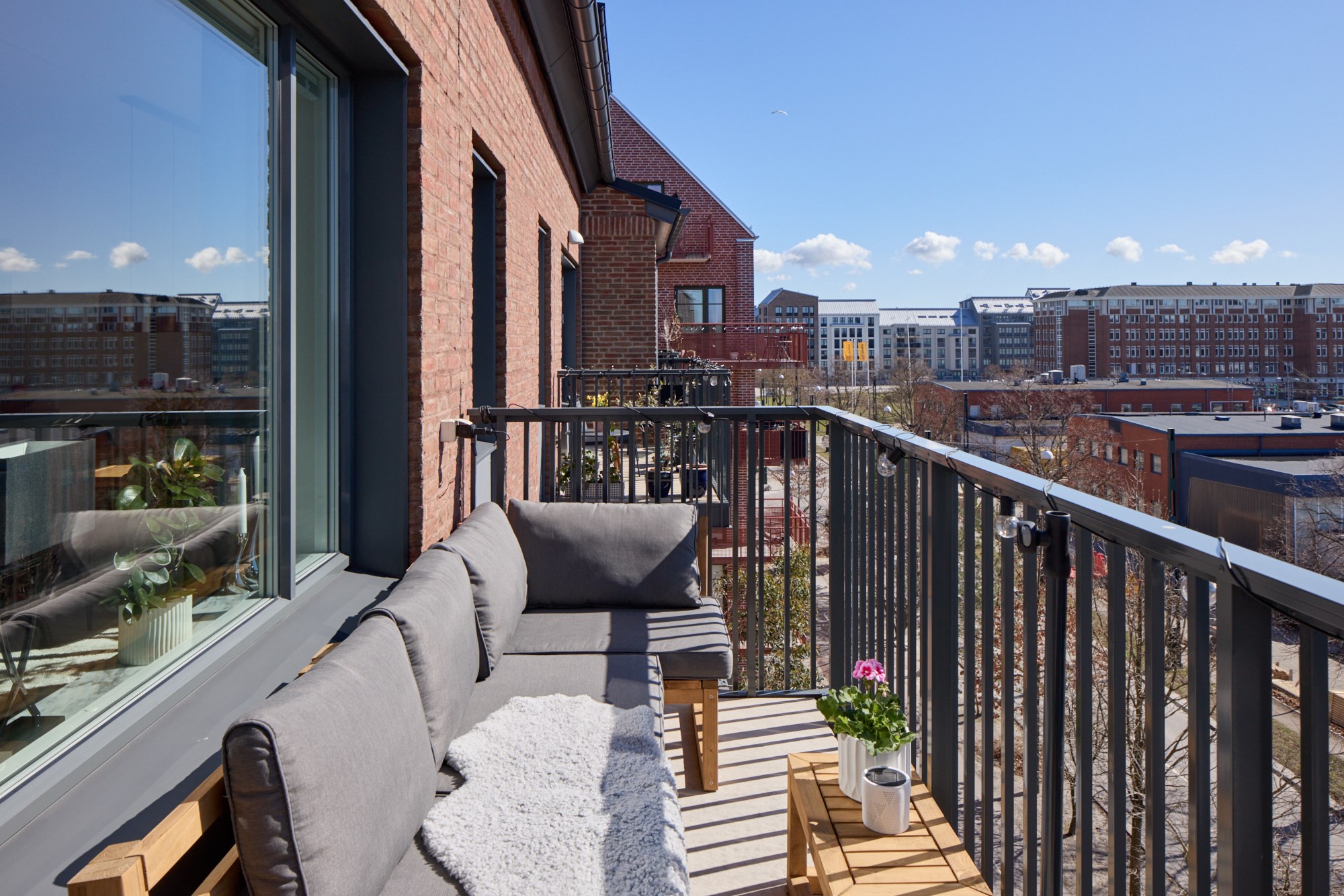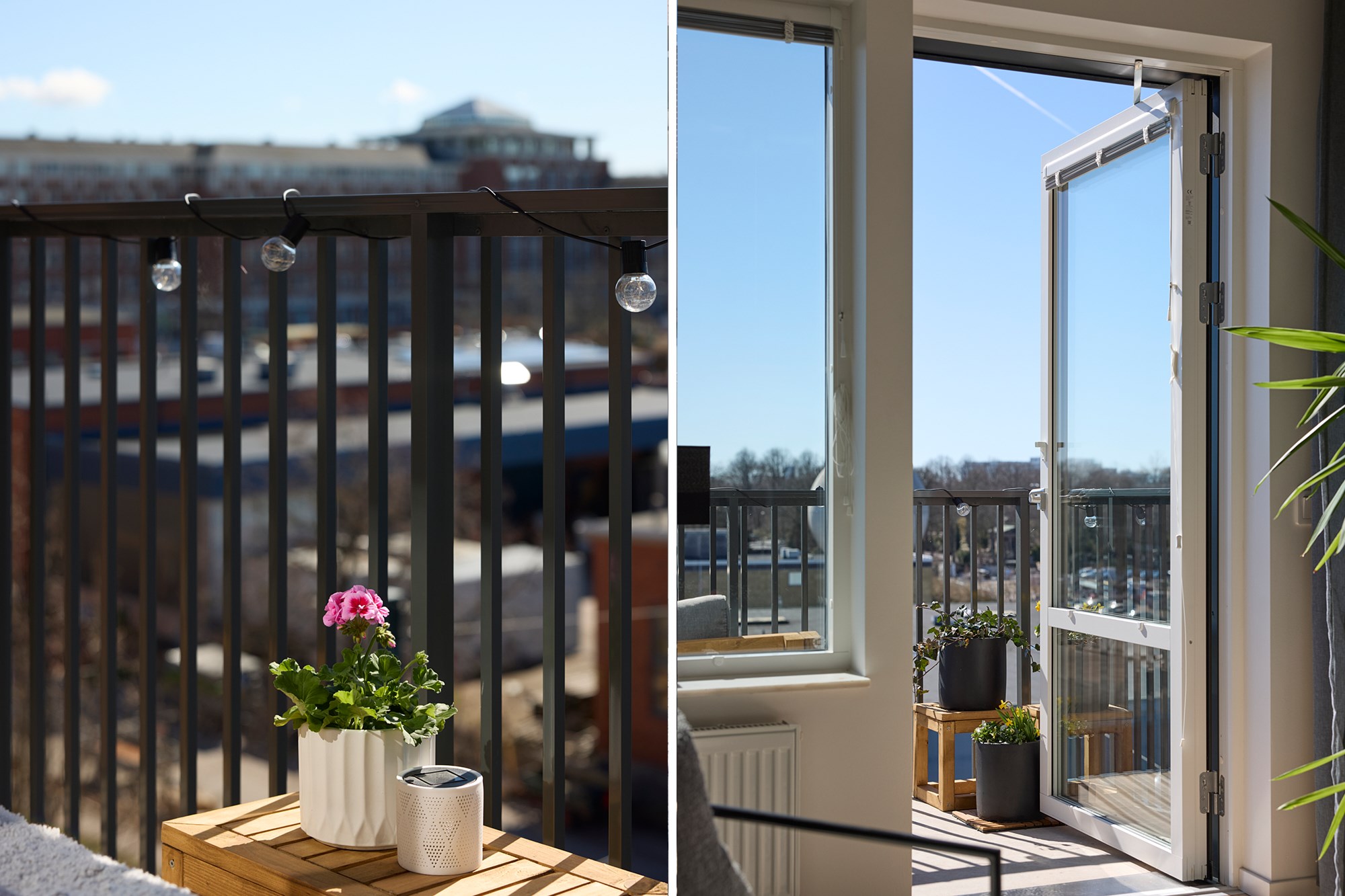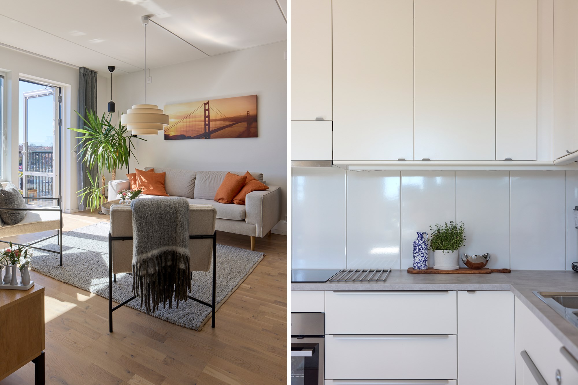 Parkettgolv och ljusa väggar. Plats för soffgrupp. Utgång till balkong.