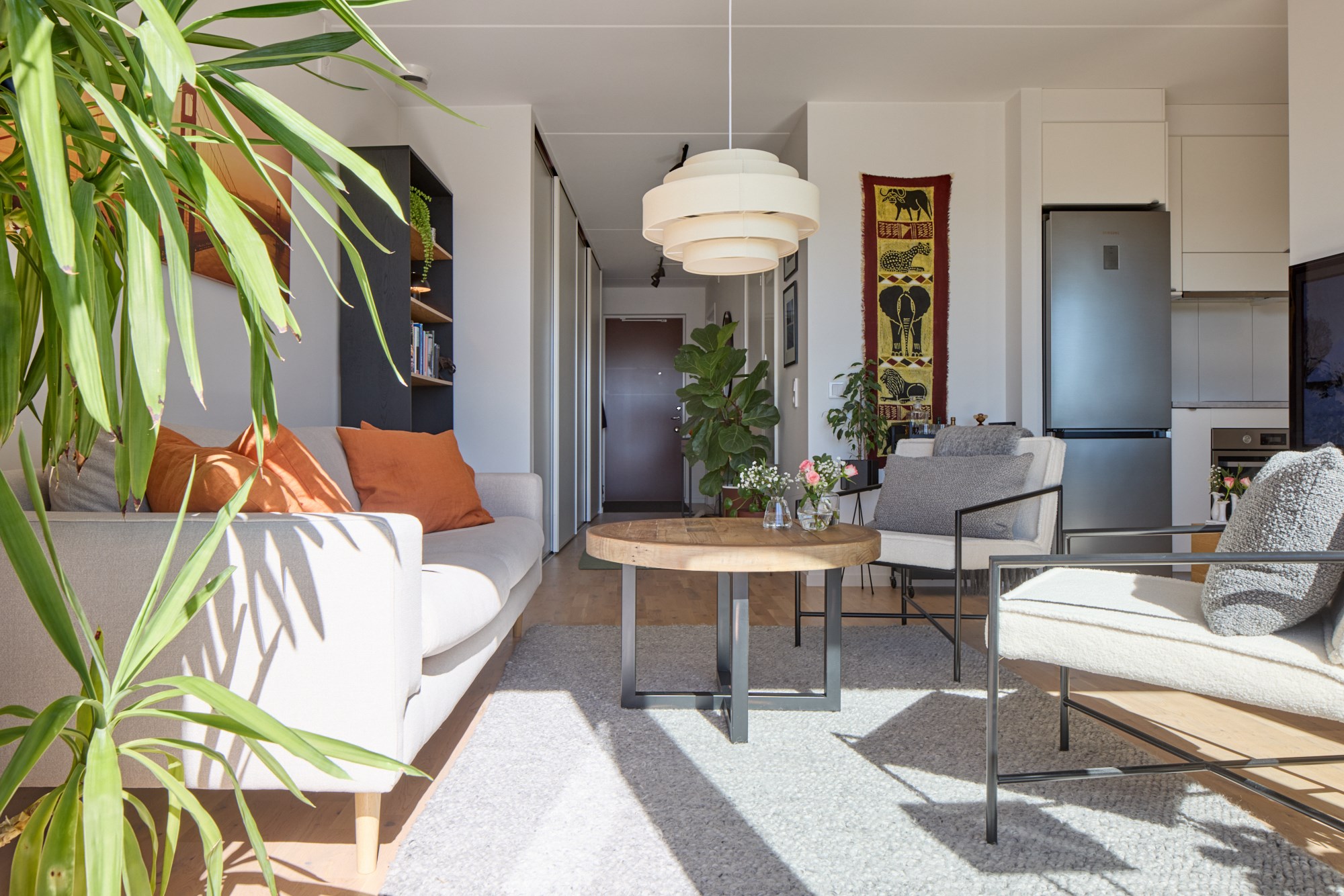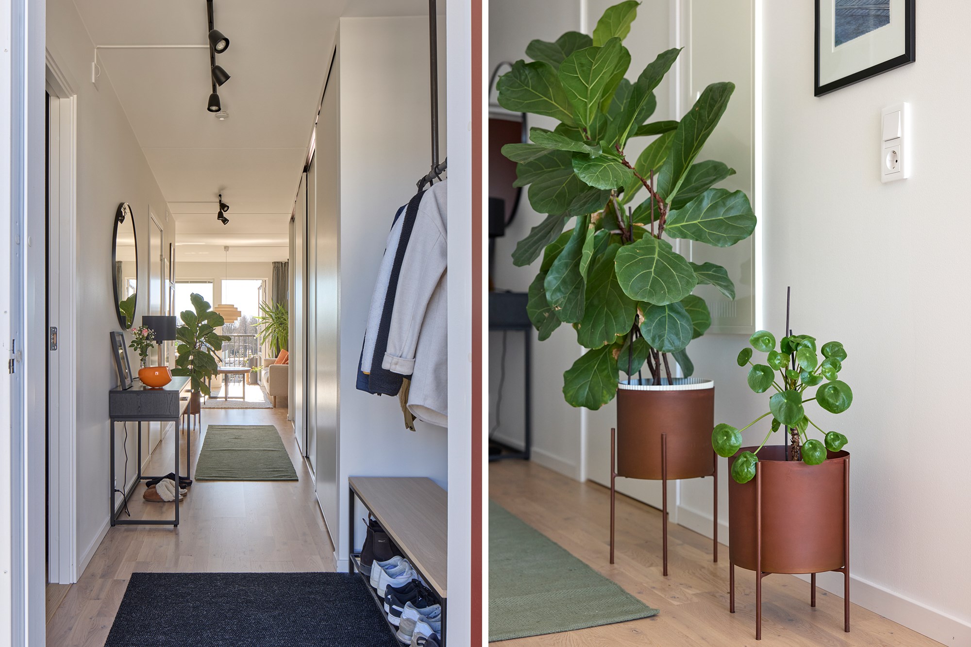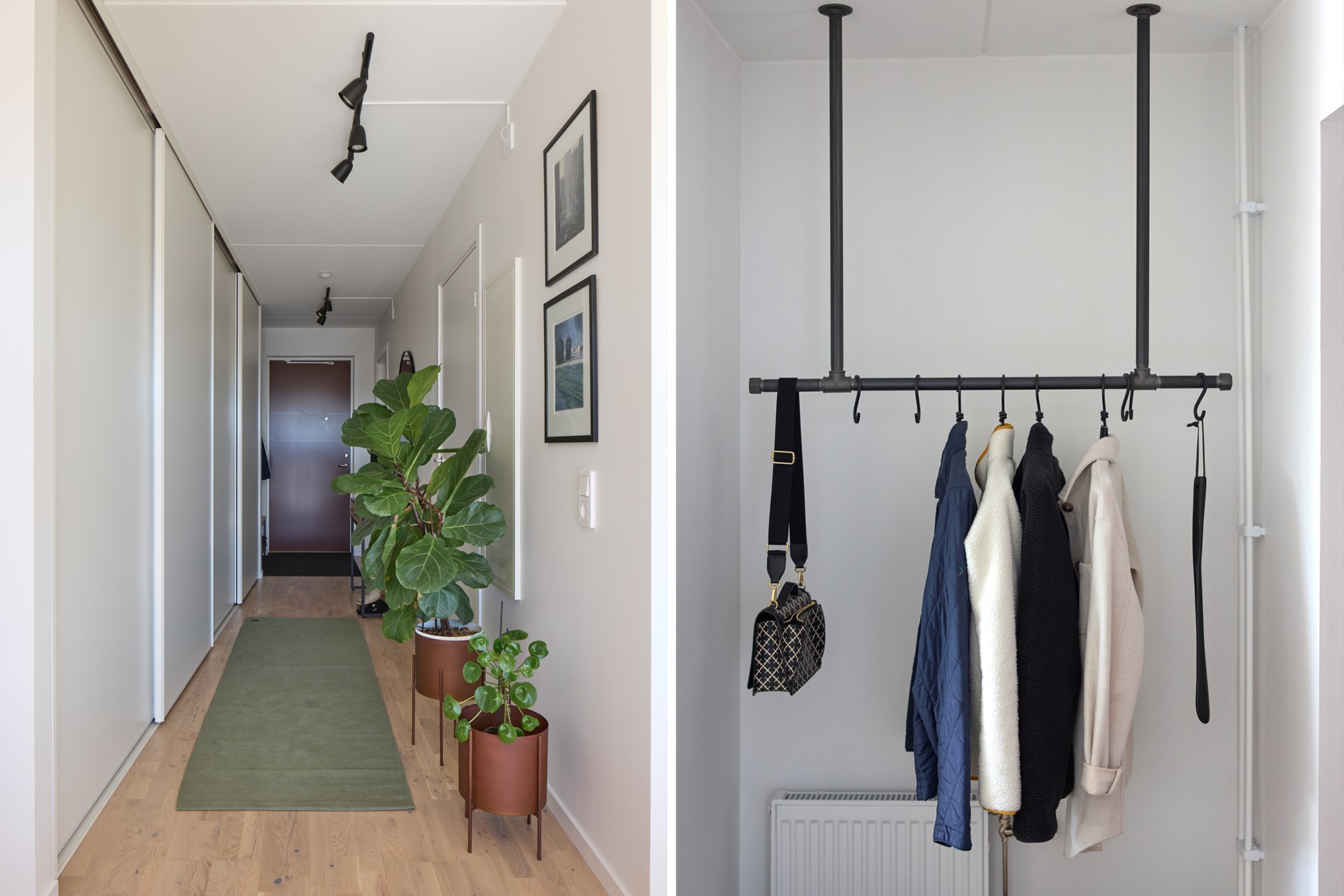 Parkettgolv och ljusa väggar. Plats för avhängning. Generöst med garderobsförvaring.