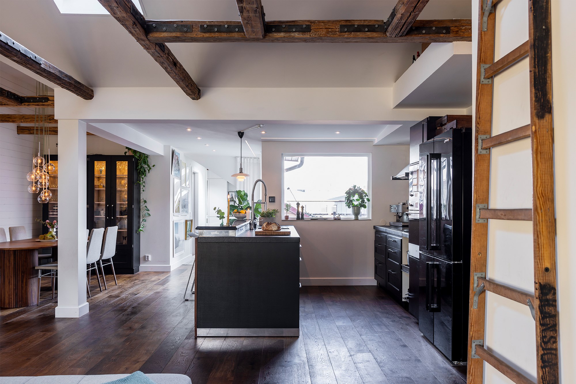 På S:t Pauli kyrkogata nummer tolv öppnar vi den pampiga röda porten och tar hissen upp till en unik vindsvåning med fantastisk volym och härlig balkong med utsikt över takåsarna. Exklusiva materialval skapar en sällsynt fin stämning i fyra rum och kök där takbjälkar och ett mörkbetsat ekgolv sätter tonen på 110 kvadrat. En takhöjd på 4,20 och höga takfönster samt långa siktlinjer ger en förträfflig atmosfär. Den omfångsrika sällskapsytan med integrerat kök är välmöblerad och stilfull. Köket kommer från svenska Kaptensgården och går i svart laserad ek som passar fint till glaserat handslaget kakel, svart granit samt svarta vitvaror från Smeg. En blankpolerad granitskiva på köksön går att höja upp till en bar, smart finess! Intill köket öppnas de vida glaspartierna ut mot terrassen, en 14 kvadrat rymlig uteplats i gårdsvänt läge, rik på solchanser de varmare månaderna. Master bedroom ligger i vinkel, här finns höga takfönster, generös förvaring och ljus matta på golv. Våningen har ytterligare två charmiga sovrum, varav det ena med utgång ut till terrassen. Varmt välkomna till ett unikt boende inrett med känsla för detaljer i ett pampigt hus med hiss upp till din dörr!