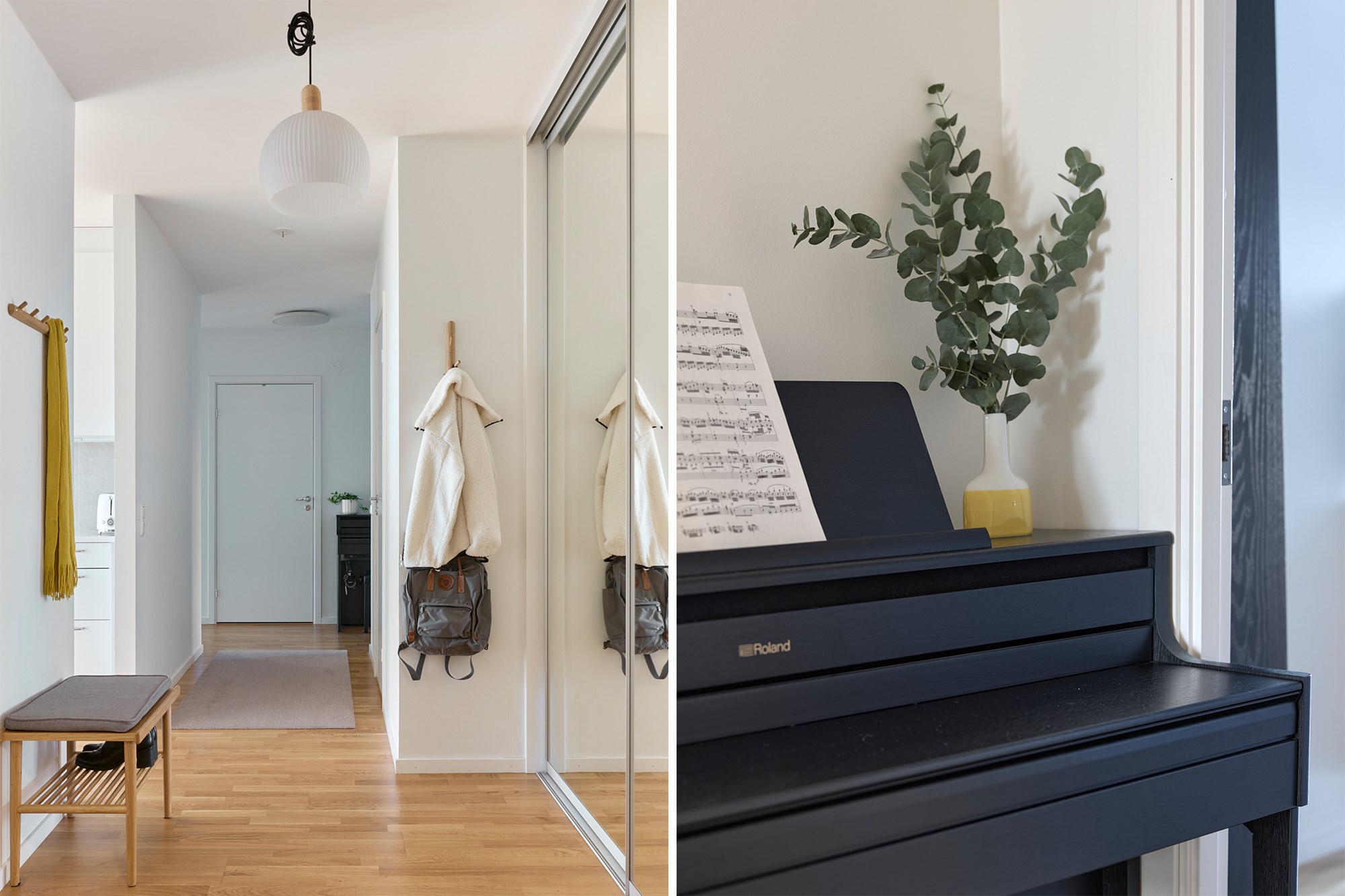 Parkettgolv och ljusa väggar. Plats för avhängning. Garderobsförvaring.