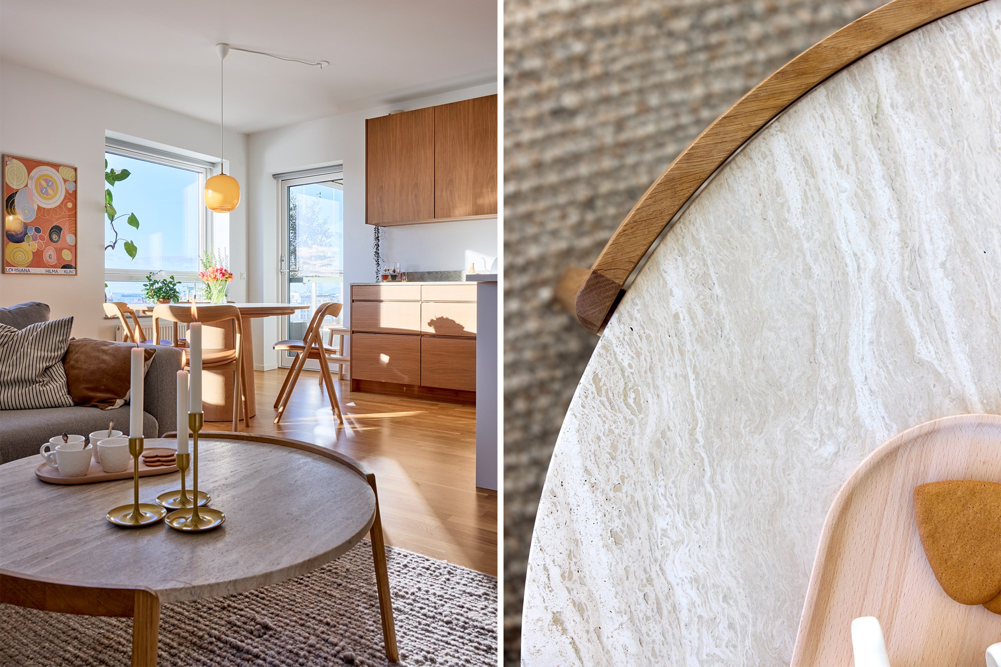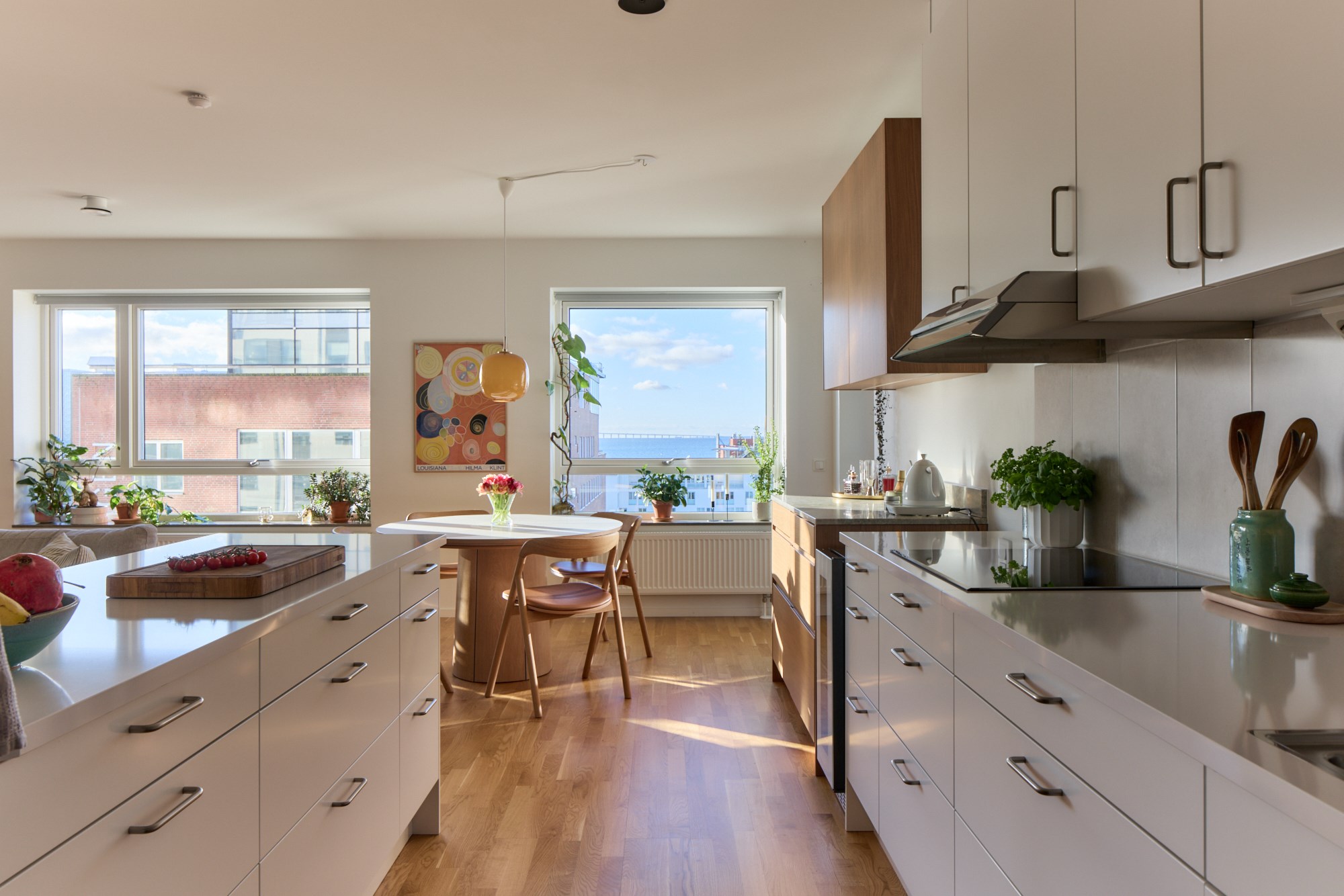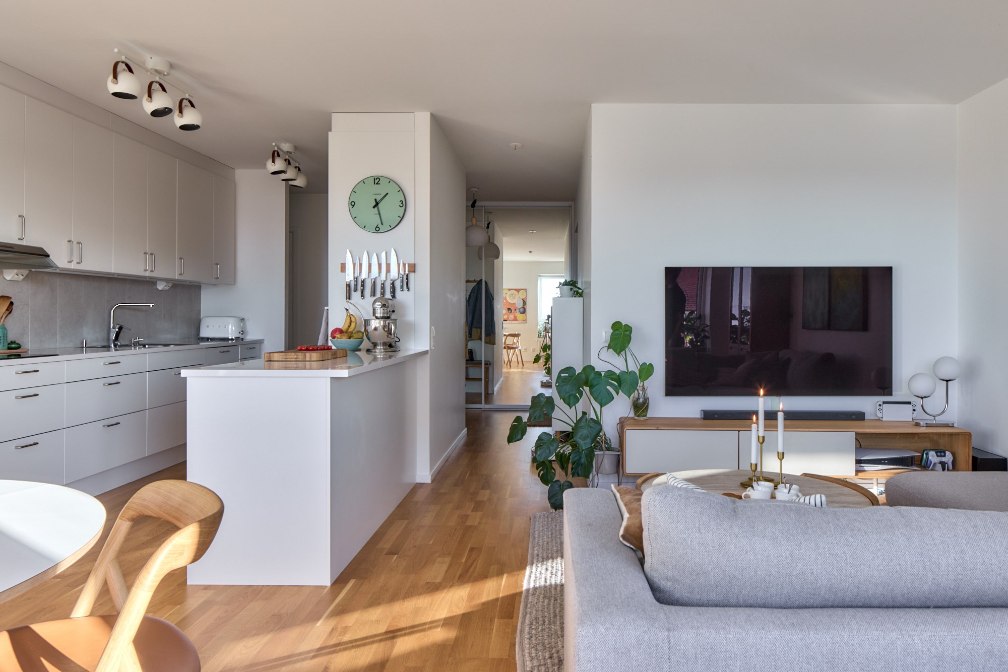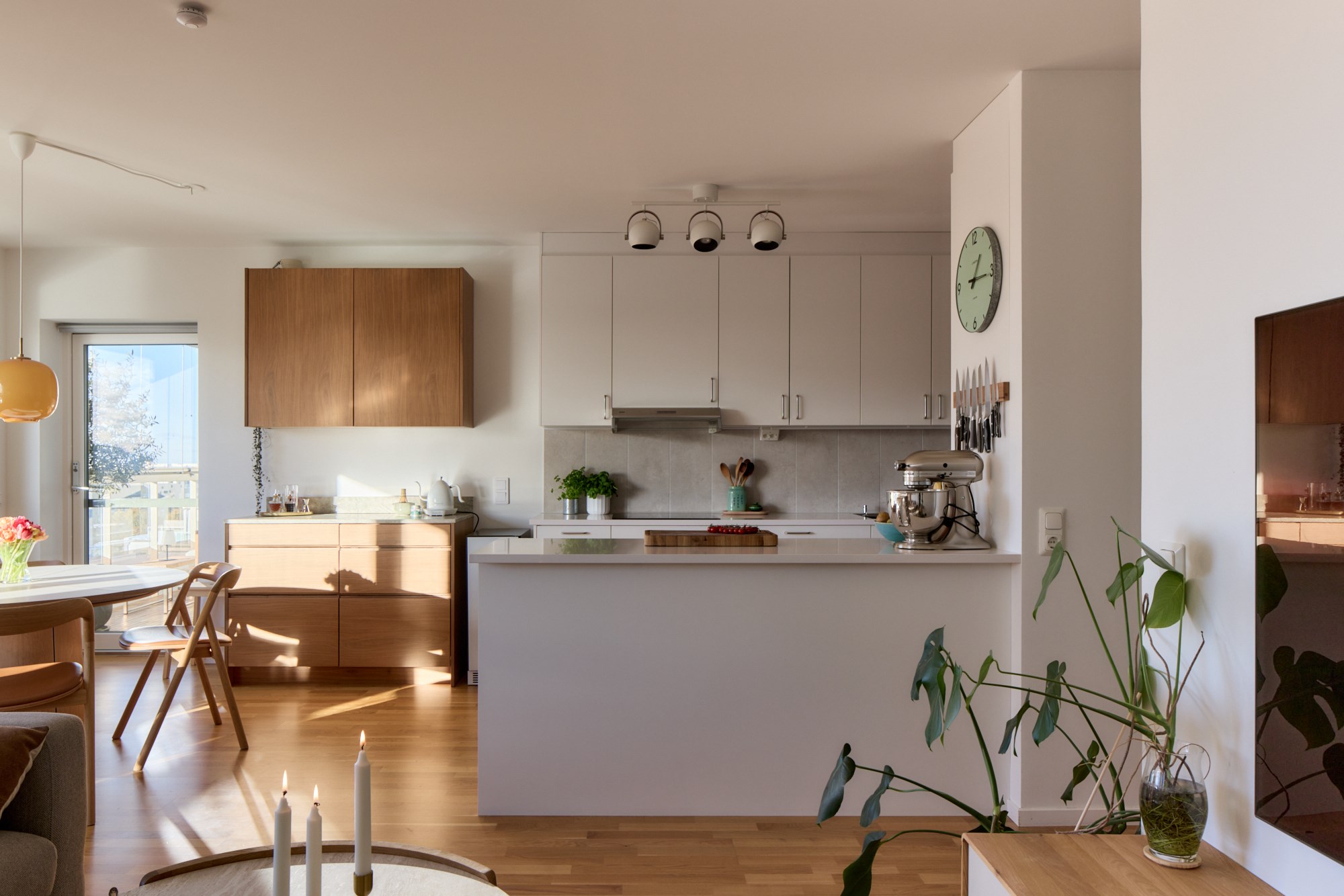 Parkettgolv och ljusa väggar. Vit köksinredning och bänkskiva i vit komposit. Maskinell utrustning i form av induktionshäll och fläkt, integrerad ugn samt mikrovågsugn, diskmaskin, kyl och frys. Baravdelning i köket är i Multiform, skåpsluckor klädda i valnötsfanér och bänkskiva i kvartsit.