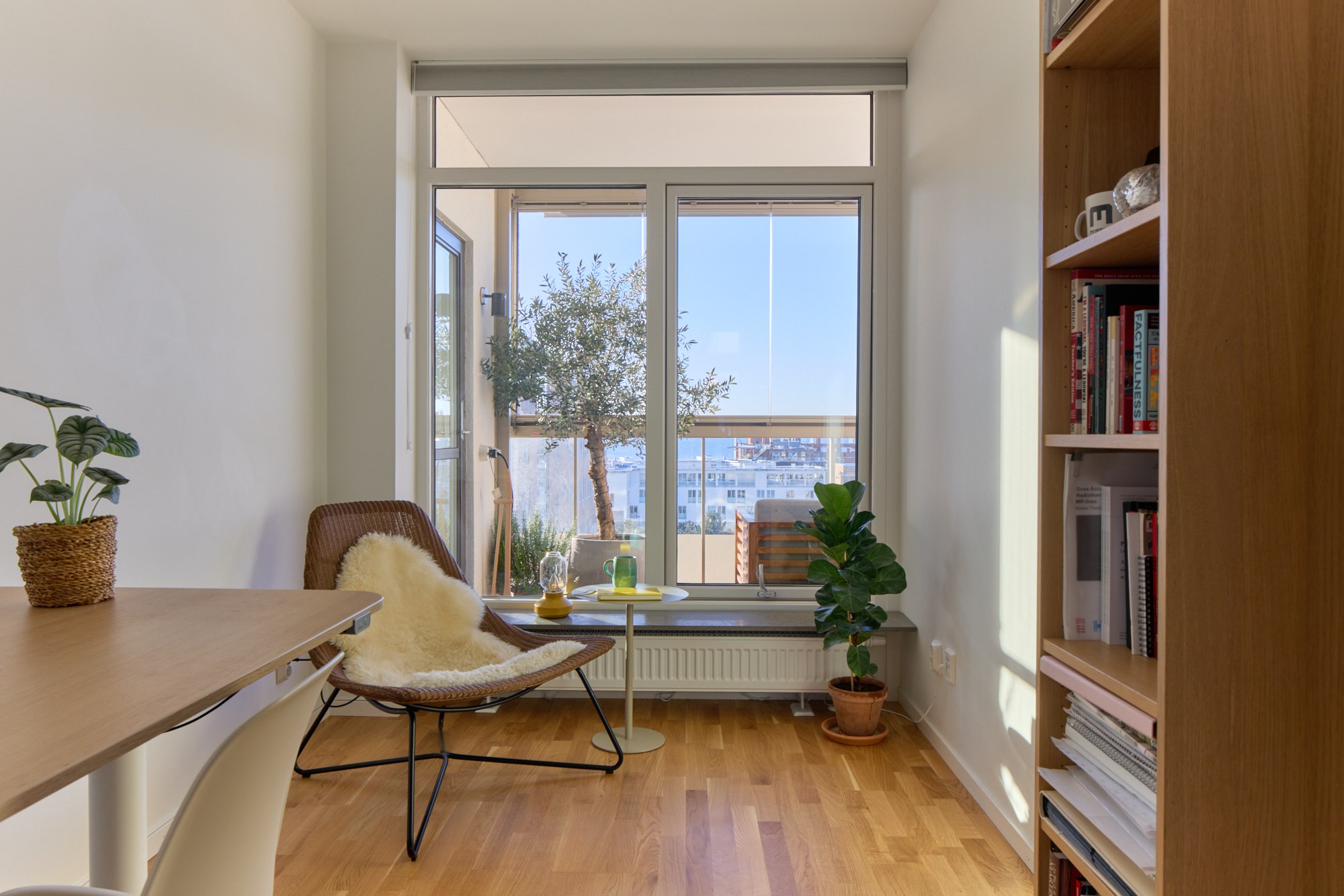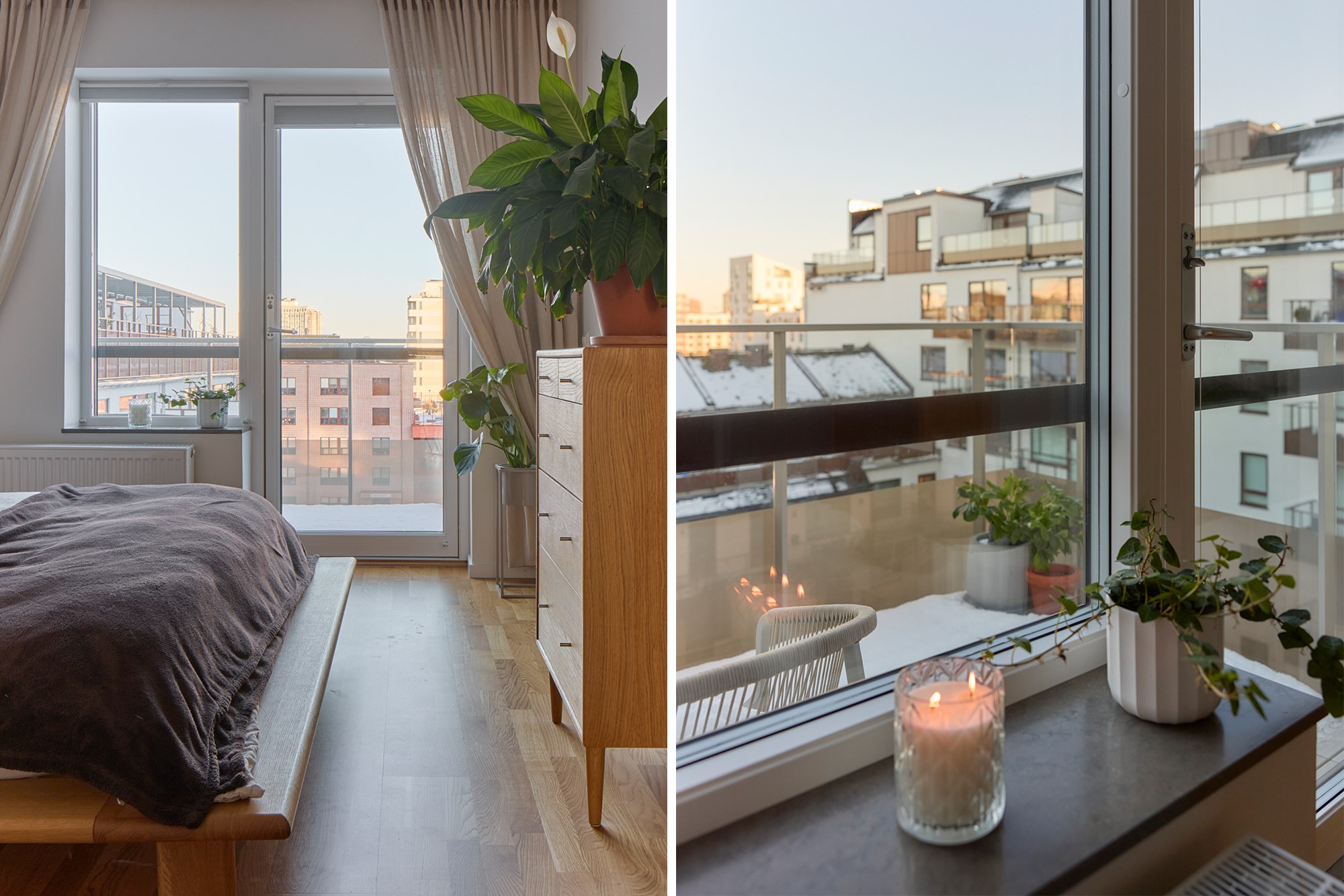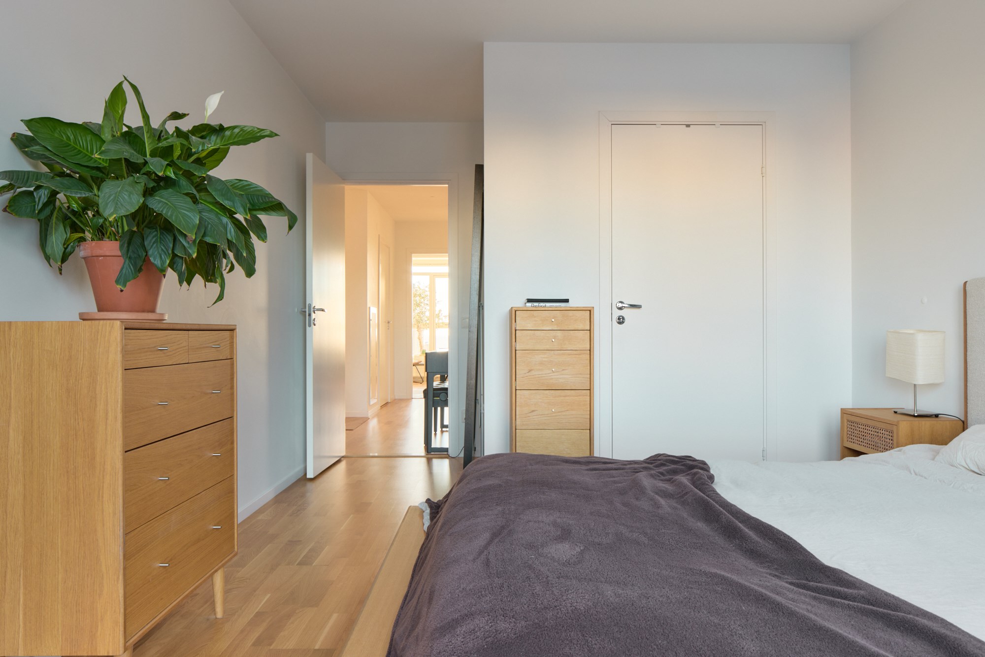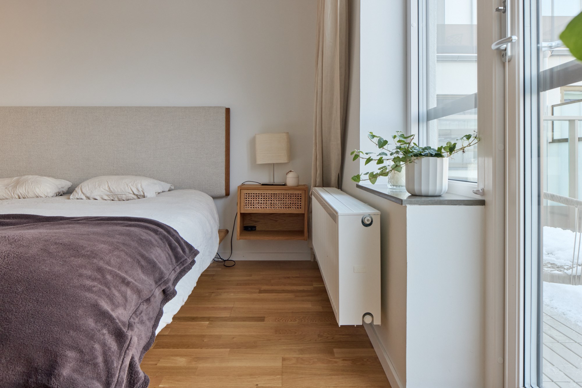 Parkettgolv och ljusa väggar. Klädkammare. Utgång till balkong.