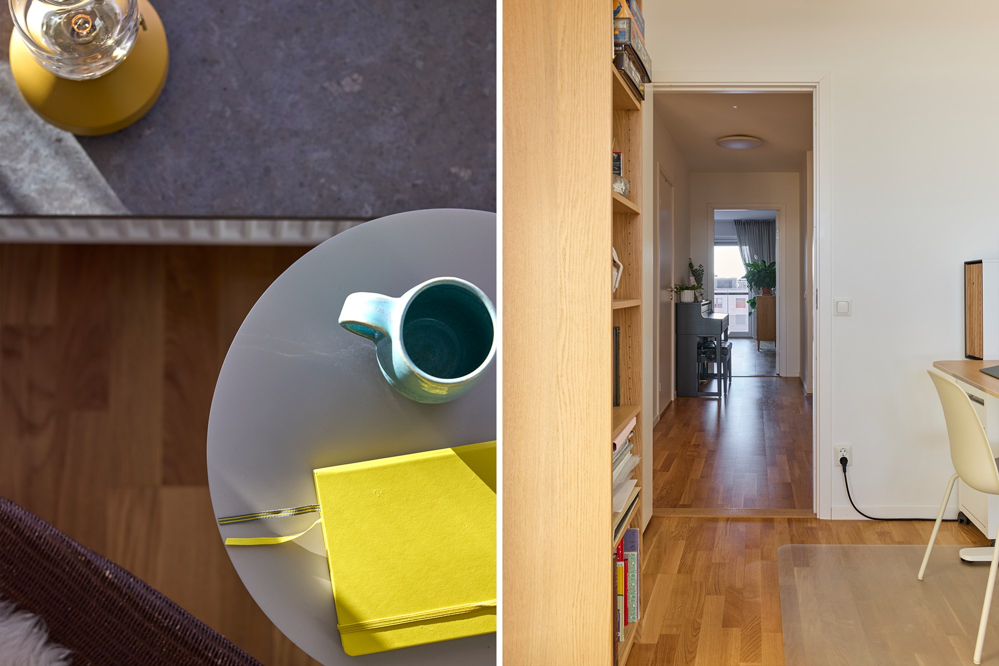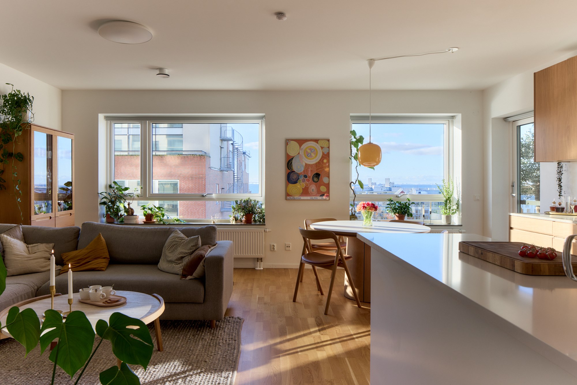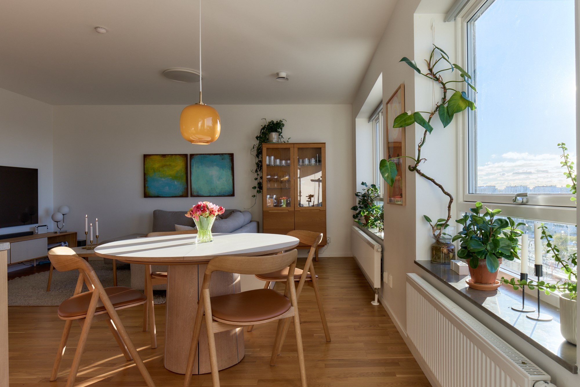 Parkettgolv och ljusa väggar. Direkt anslutning till kök. Utgång till inglasad balkong.