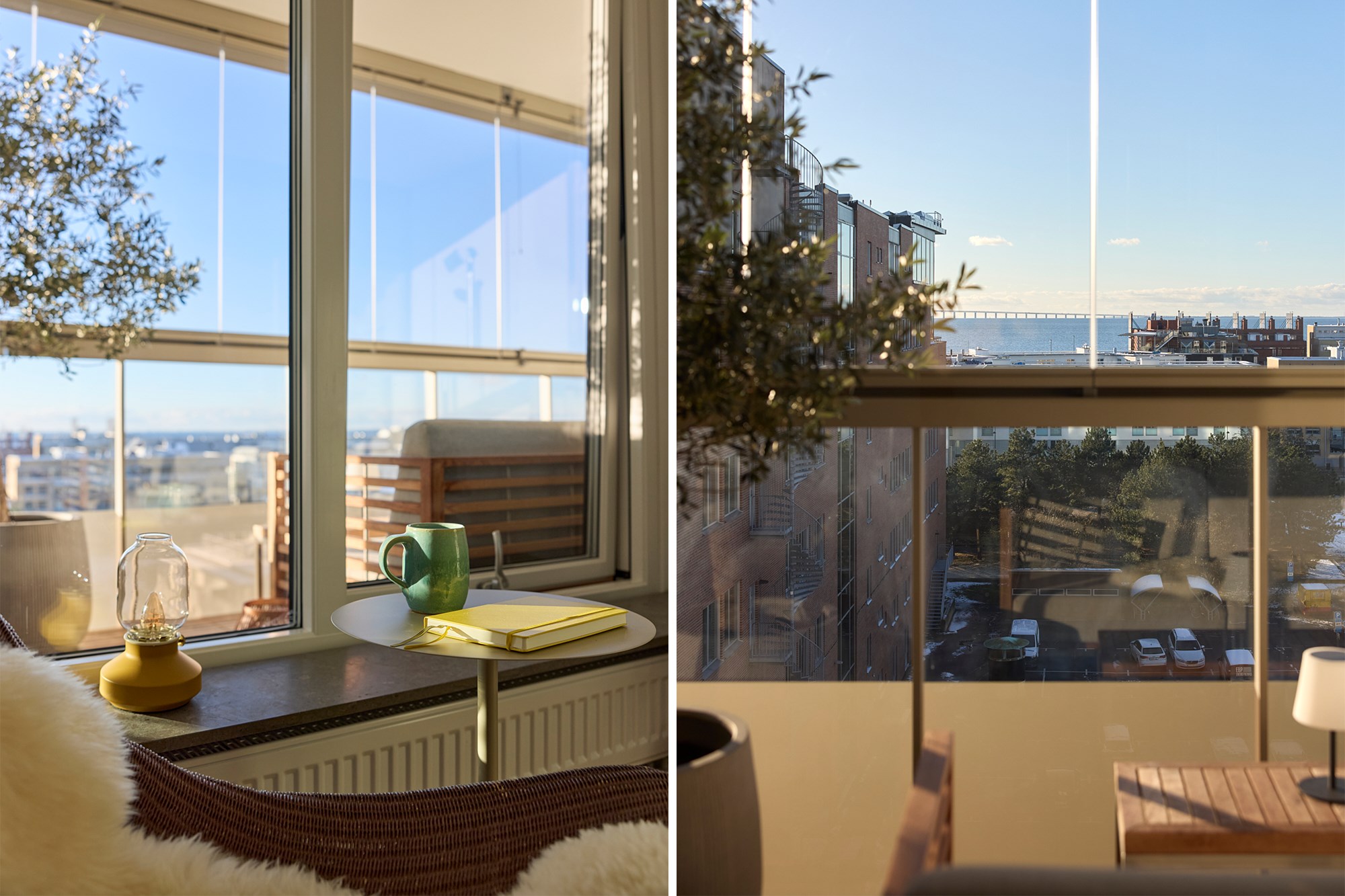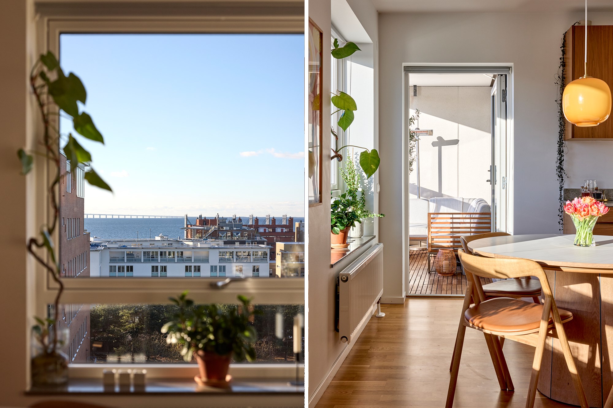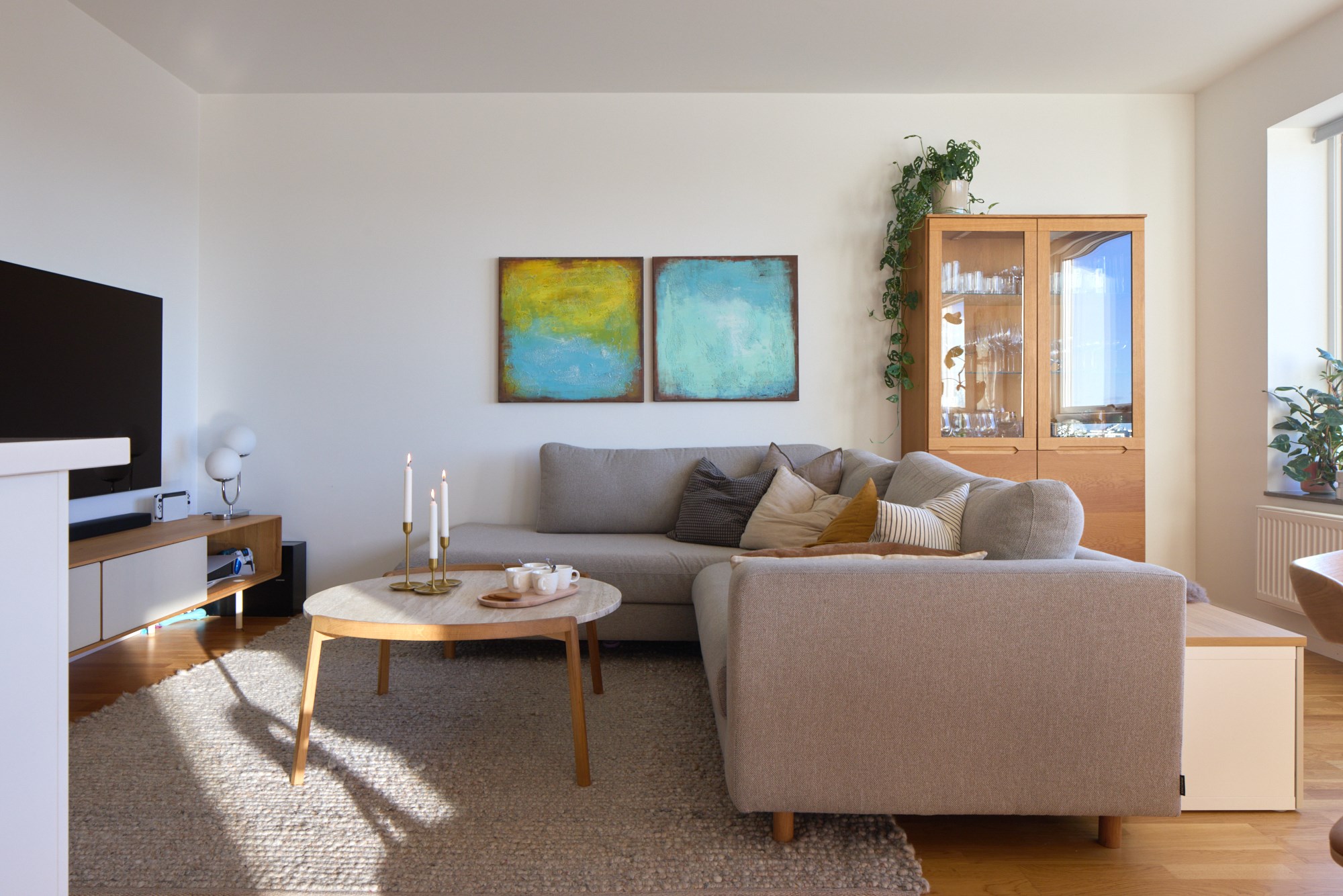 Parkettgolv och ljusa väggar. Direkt anslutning till kök. Utgång till inglasad balkong.