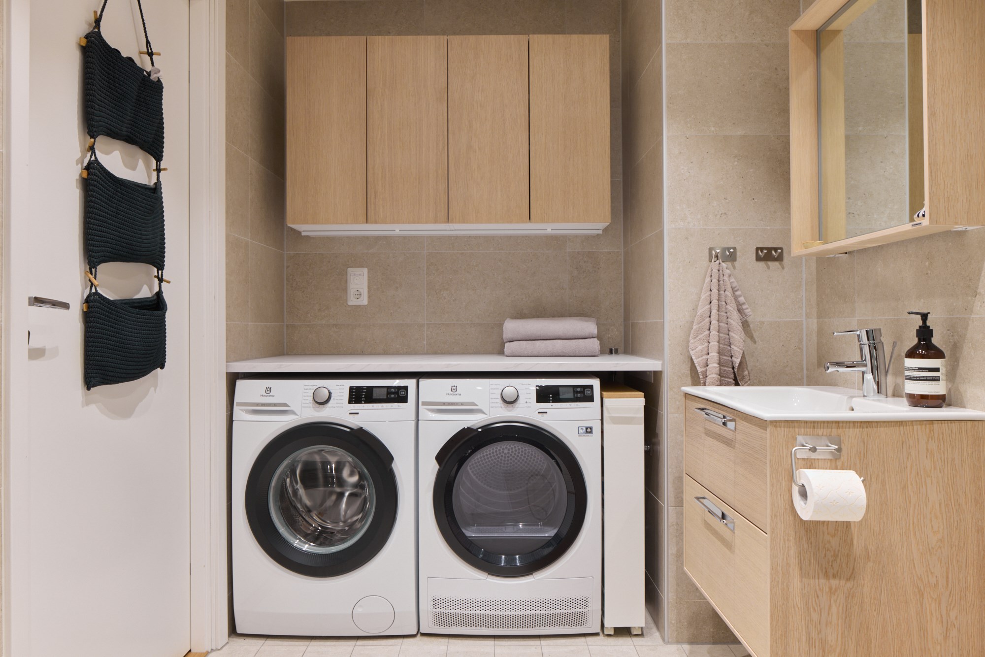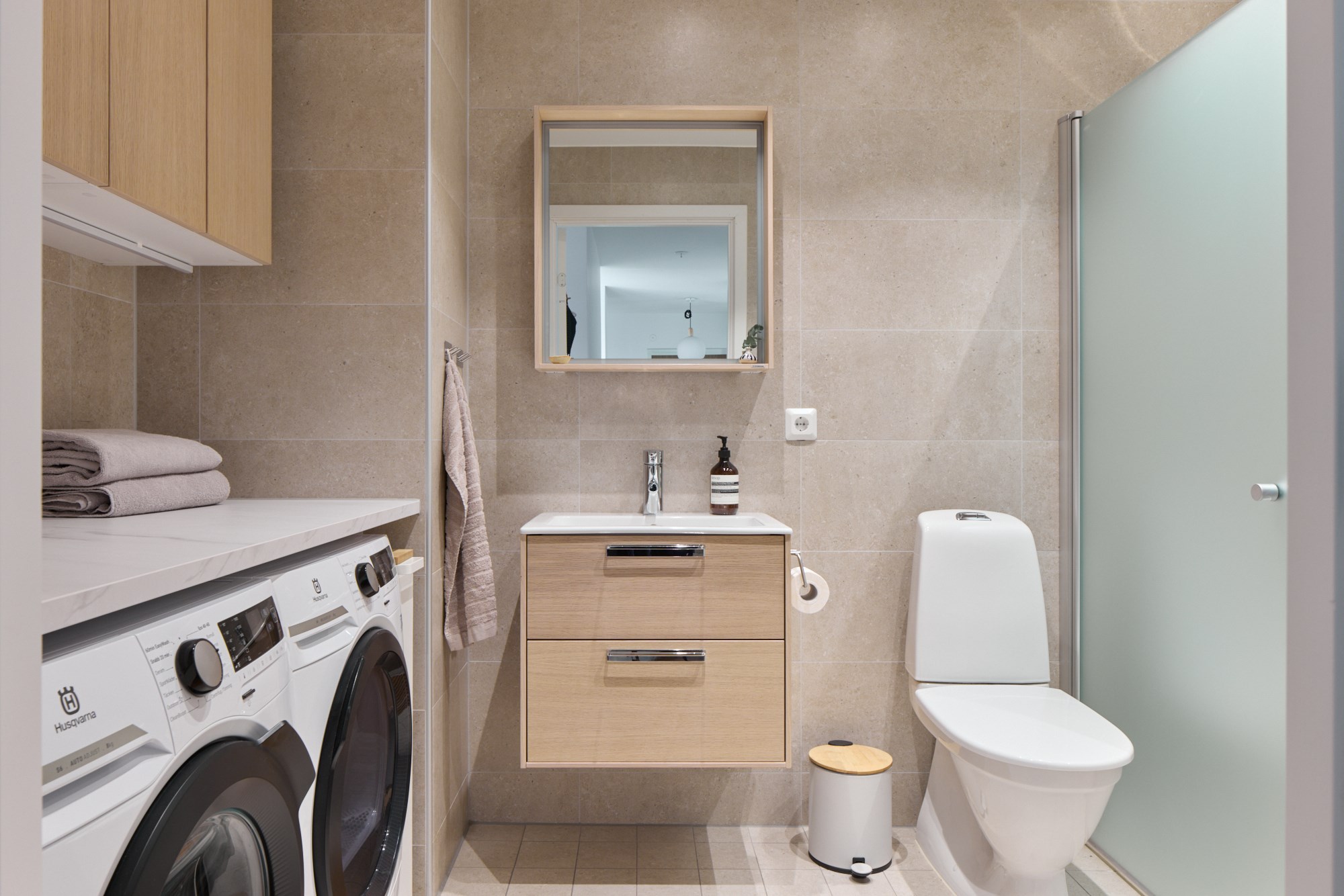 Helkaklat badrum i beige. Utrustning i form av WC, handfat med kommod, spegelskåp, dusch, tvättmaskin och torktumlare. Arbetsbänk och förvaringsskåp.