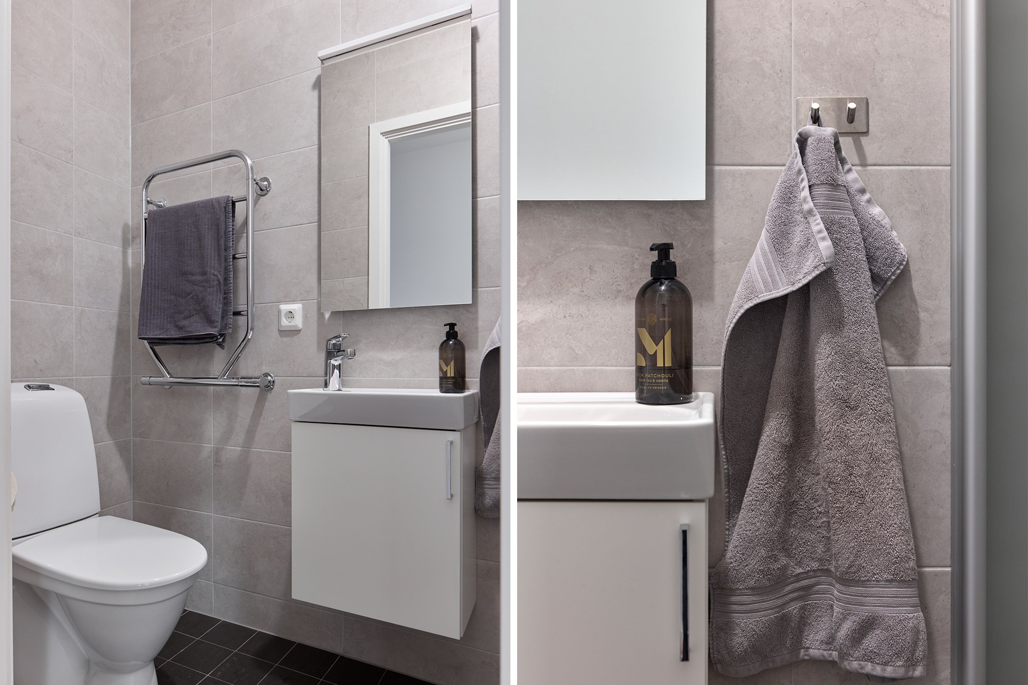 Helkaklad WC. Grå klinker till golv och vita kaklade väggar. Utrustad med WC, handfat med kommod, dusch och handdukstork.