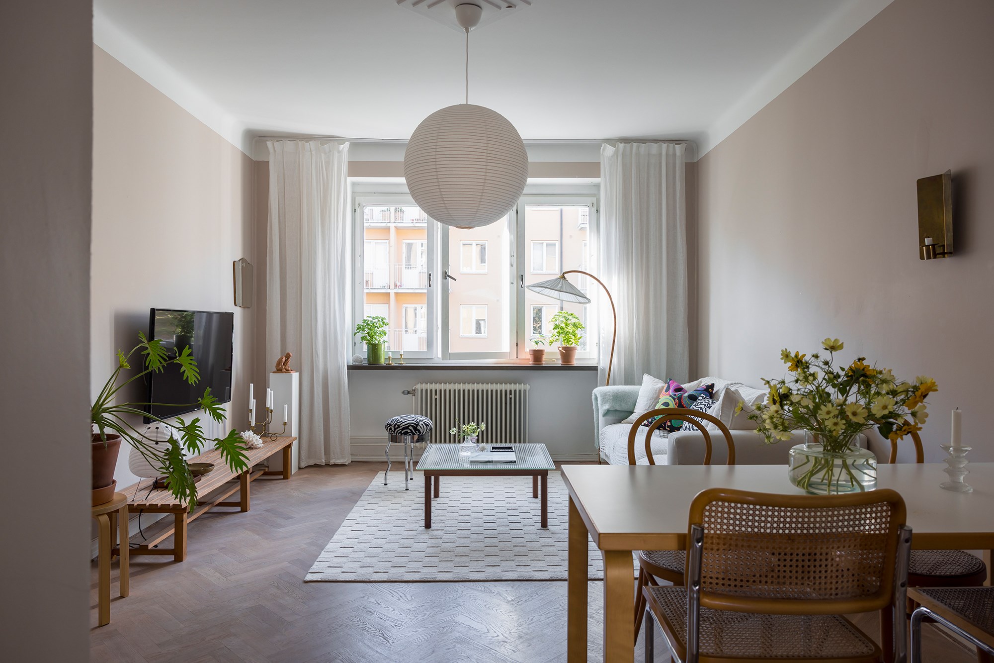 Fiskbensparkett och släta väggar i rosa kulör. Gott om plats för soffgrupp och annan möblering.