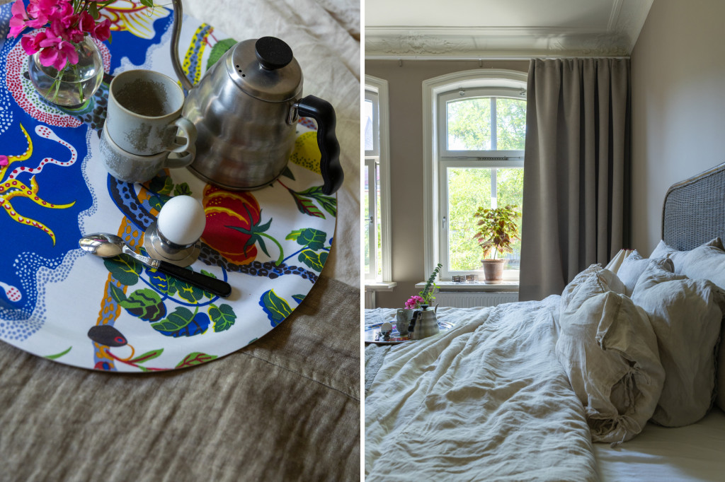 Frukost på sängen i ett ljuvligt sovrum, dröm!