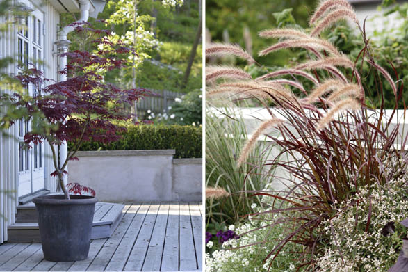 Jag älskar fjäderborstgräs - den dansar i vinden, har skimrande vippor som blir ljusa eller drar mot kopparskimrande. Så fina att skapa lite lekfullhet med! En stor kruka med bara gräs i är något av det finaste jag vet. Den står där över hela vintern, kalla dagar med rimfrost på vipporna. Det går jättebra att använda sig av större gräs också, om man har som jag, en mer sparsmakad stil.