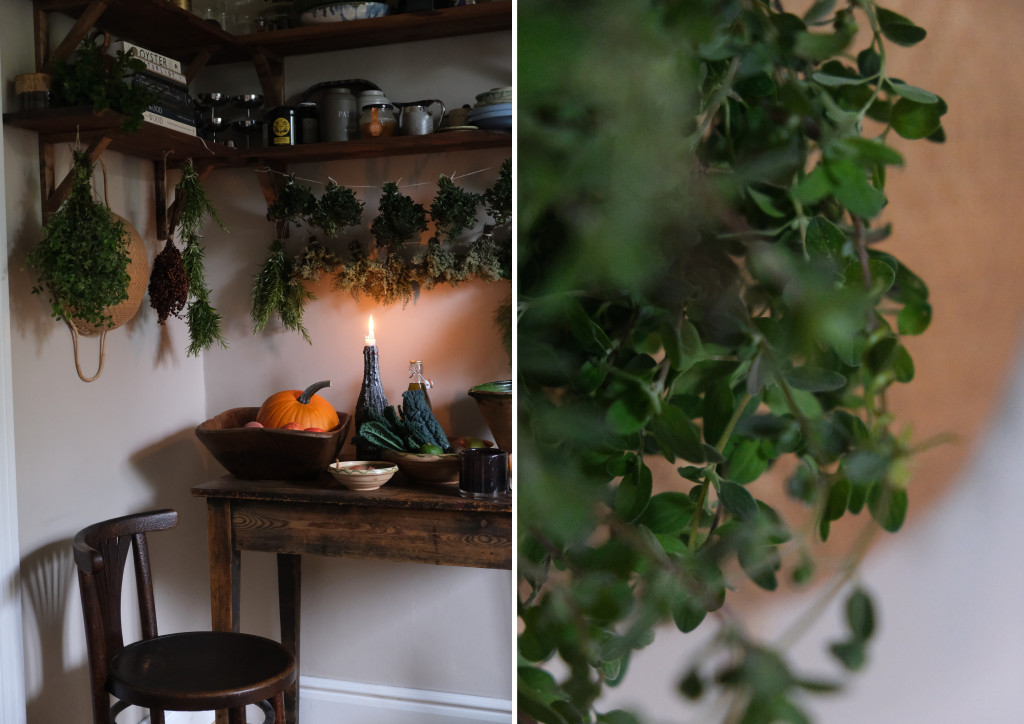 Att klippa ner sommarens kryddor och hänga upp på tork har blivit en härlig tradition i köket hemma, doften är fantastisk och det är extra mysigt i köket med allt det gröna. Låt hänga några veckor och sedan kan man bara repa av bladen från stråna för att förvara dem i glasburkar. I år blev det knippen av oregano, timjan, mynta och rosmarin som hänger på tork och doftar ljuvligt!