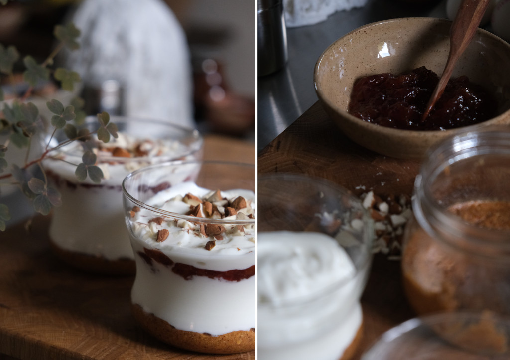 Vi mixade mandel med lite olja och en nypa flingsalt till ett slätt smör. Varva yoghurt, fruktkompott ( vi tog plommonkompott) och mandelsmör i skålen.