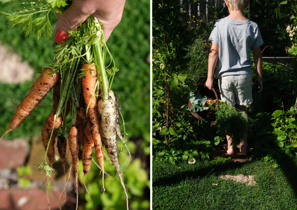 Färgstarka grönsaker som mörkröd sallad och mangold med röda stjälkar blir också ett läckert blickfång. Ringblommor och Tagetes ger mycket färg i pallkragarna och fungerar bra för att avskräcka bladlöss. En annan ljuvlig kombination är den mörka palmkålen "Nero Di Toscana" tillsammans med blomstermorot, det låter väl som en fin kombo?
