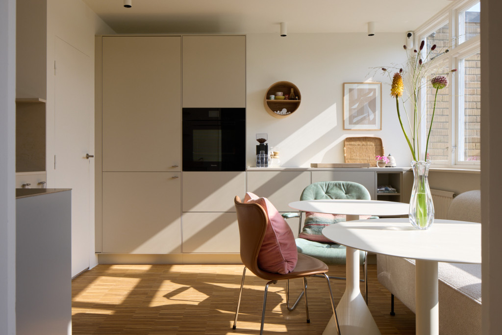 Mycket av originalkaraktären i våningen på Klostergatan 2 har bevarats och vårdats, köket är platsbyggt från Byggfabriken, i tidsenlig stil med dova toner på väggar som även de är från Byggfabriken. Här finns en genomgående klassisk känsla i stora drag som ner till små detaljer, beslag i originalutseende på både dörrar och fönster bidrar till en oemotståndlig sekelskiftescharm.
