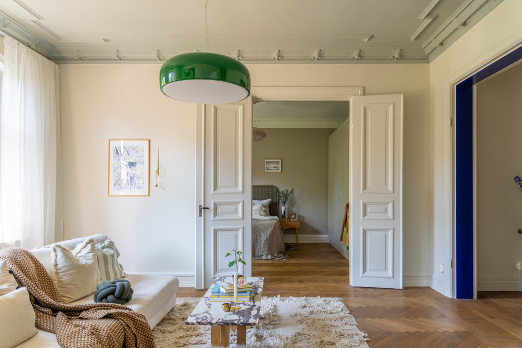 Det här är ett riktigt lyckokast med en unik kombination av djärvhet, lekfullhet och en kärlek till det klassiskt stilfulla! På Stenbocksgatan 6 möts vi av ett hem fyllt med stor personlighet och modiga detaljer, sköna färger och en sagolik planlösning. Ursprungligen vackert sekelskifte med tre salonger i fil, djupa fönsternischer, profilerade spegeldörrar, vaxad fiskbensparkett och en grön kakelugn. Dubbeldörrarna ut till balkongen står öppna och en svag bris fyller en väl omhändertagen och otroligt unik våning med karaktär. Takhöjden är rejäl och taken är rikt dekorerade med stuckaturer. Tre salonger på rad ger många meter i härlig siktlinje rakt igenom hela våningen. Salongerna har alla de attribut man vill ha, alla inredda med en lite avslappnad, cool stil.